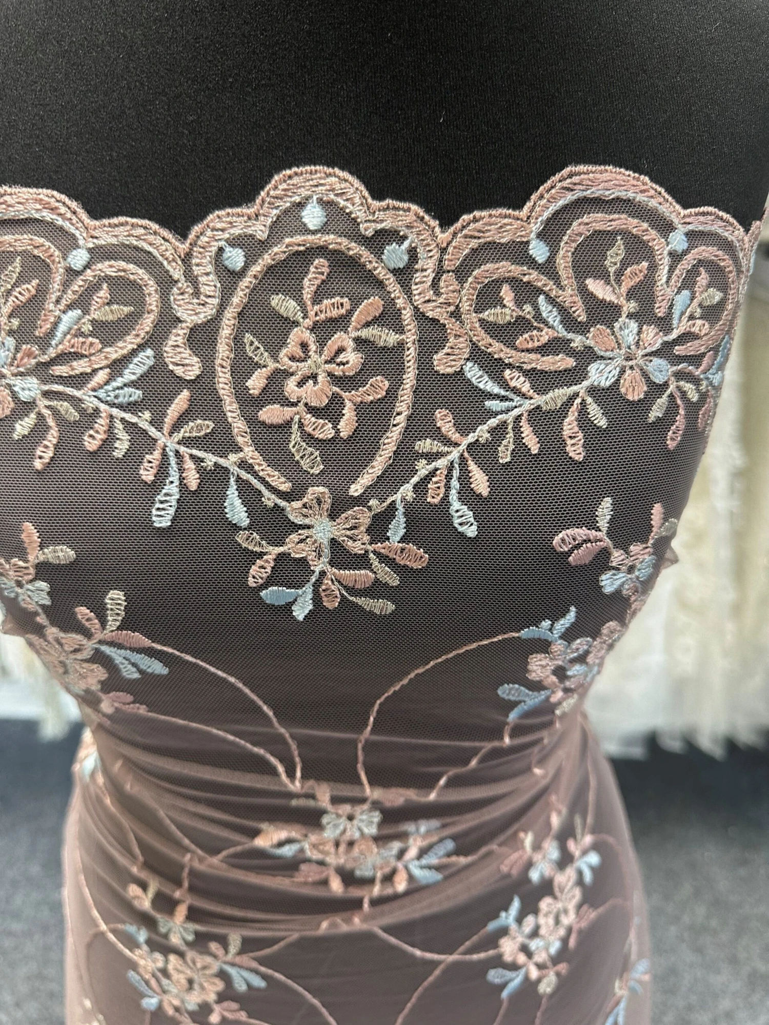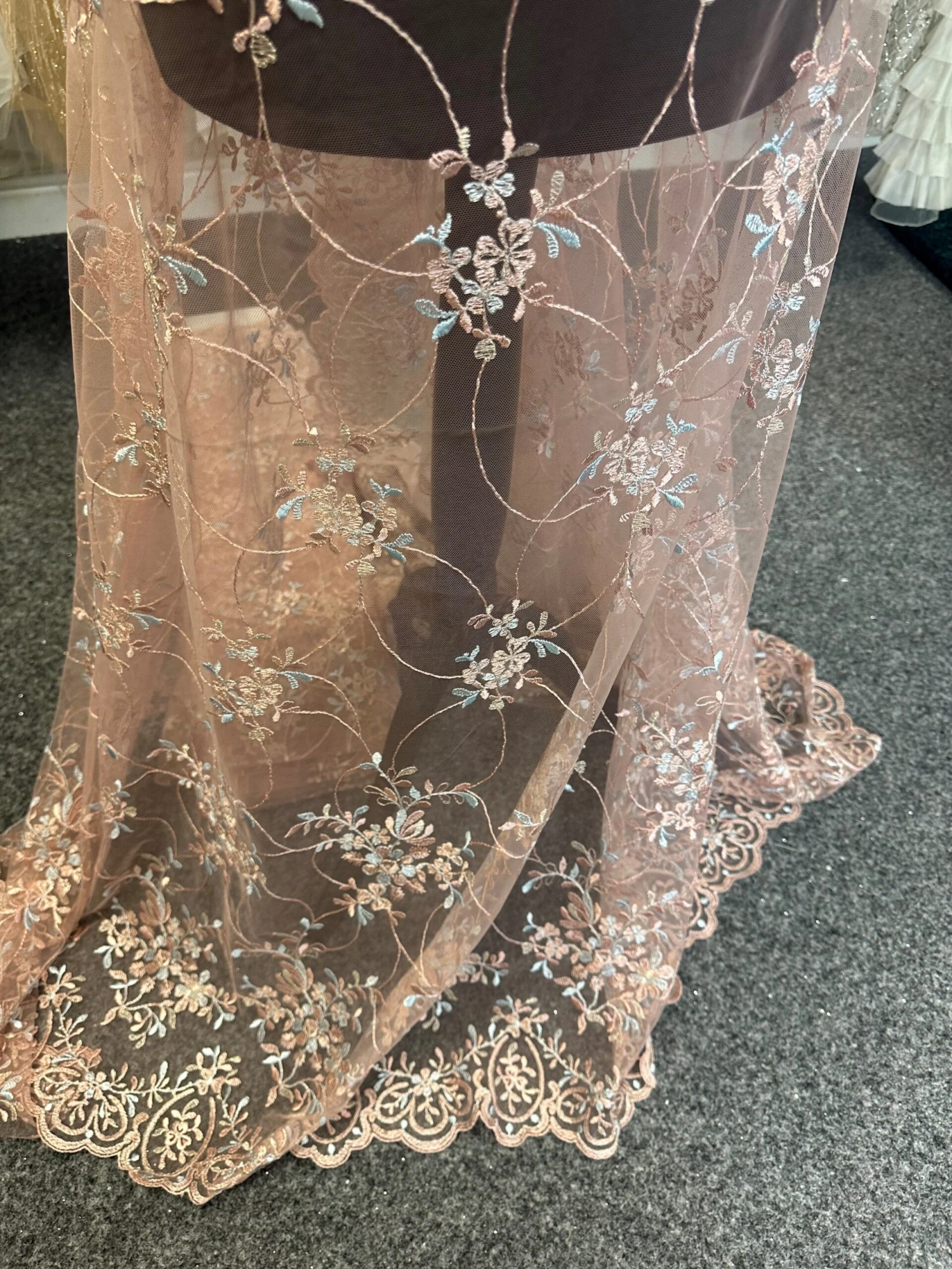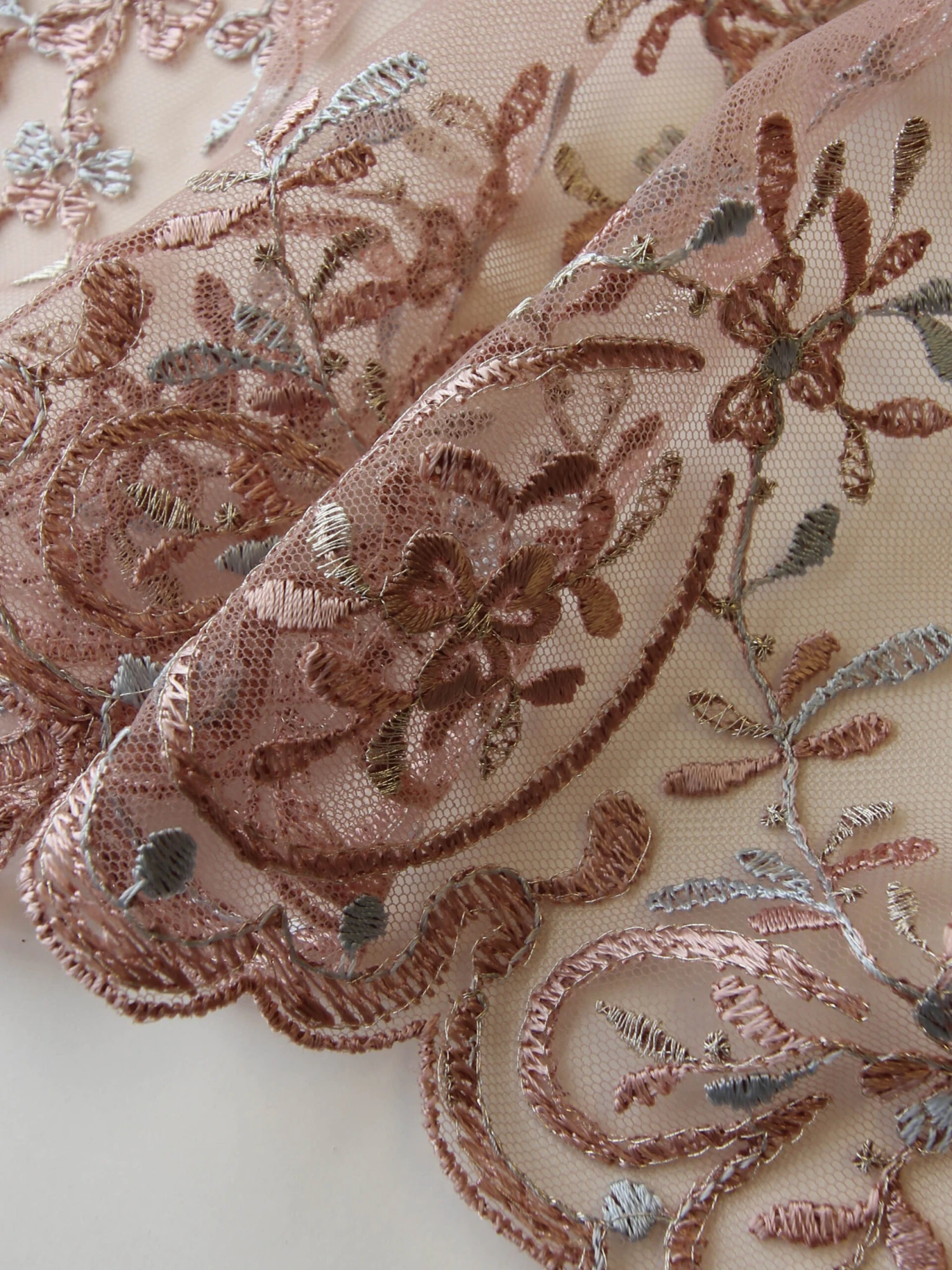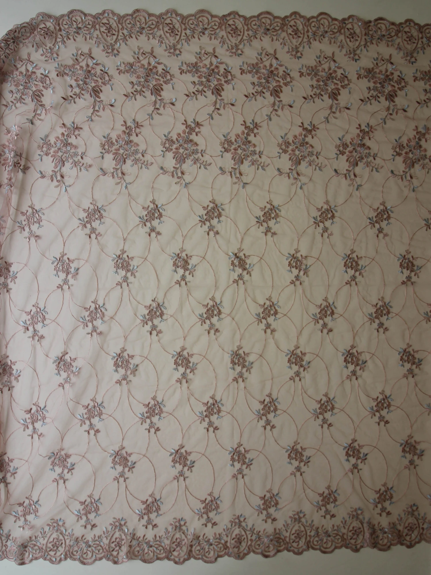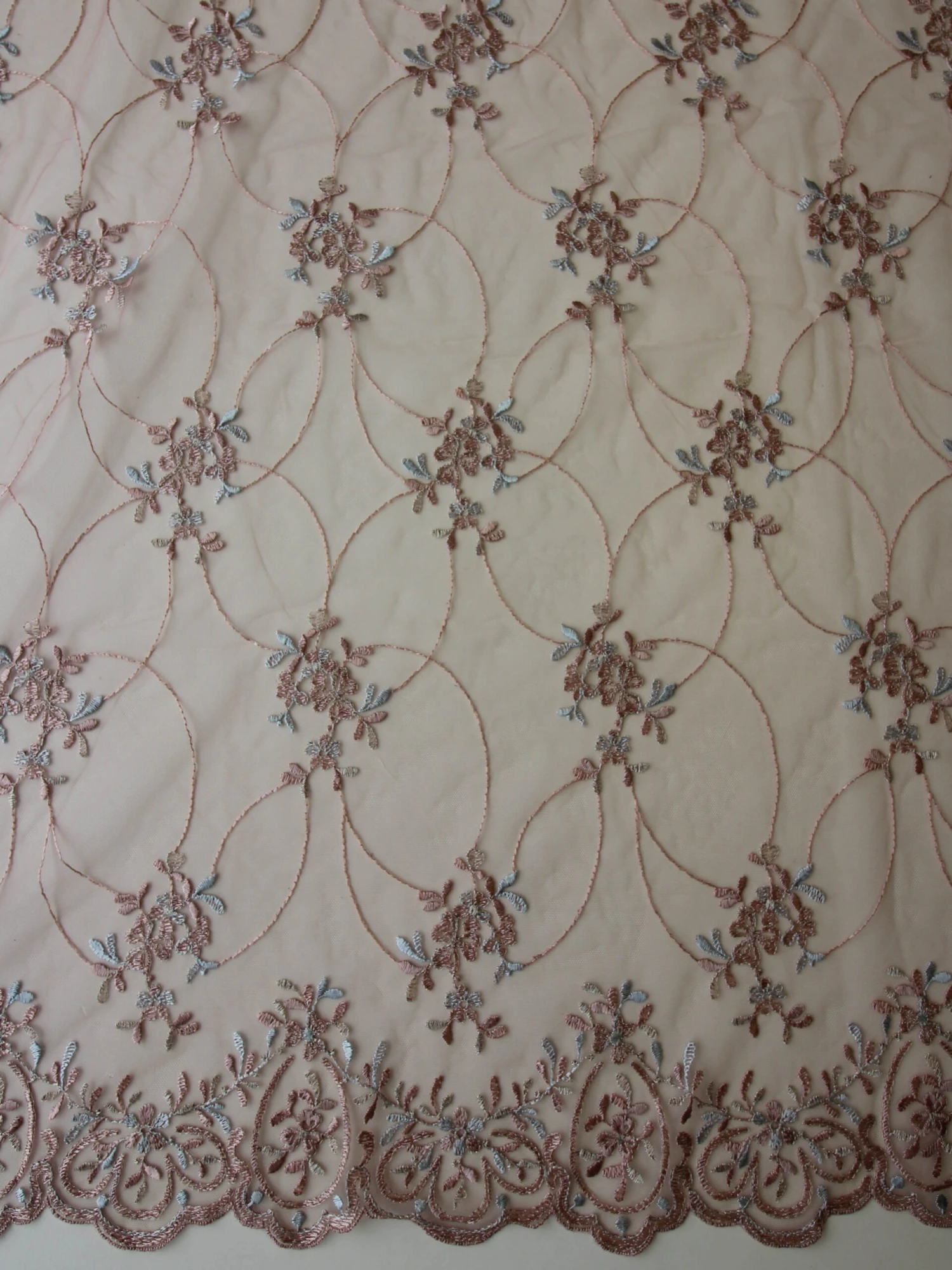 An attractive rose gold or antique rose coloured lace that measures 132 cm (52″) wide. This is a tulle base that has been embroidered beautifully with pink, filigree gold, and light blue yarns to form a sweeping floral pattern.Â