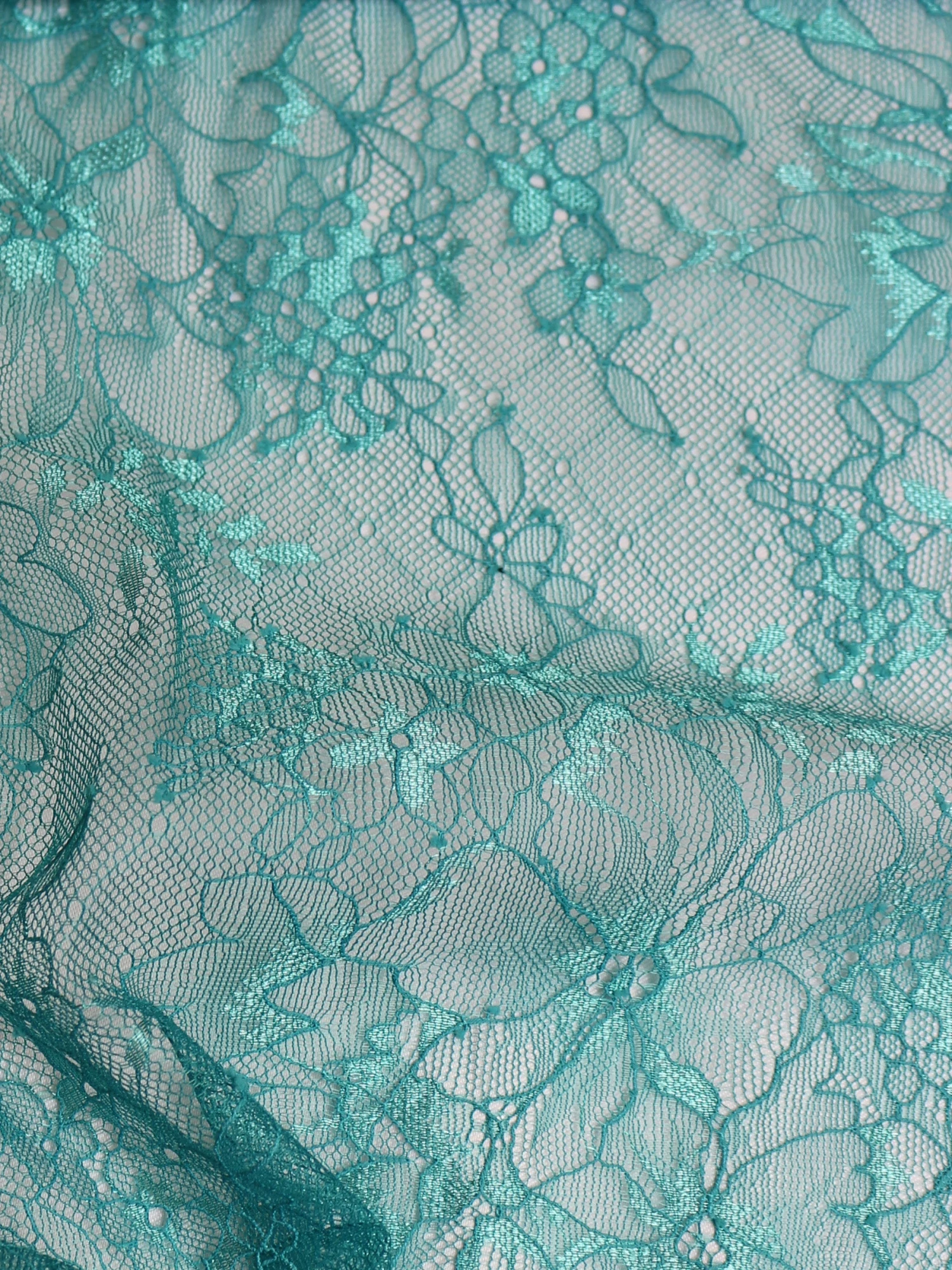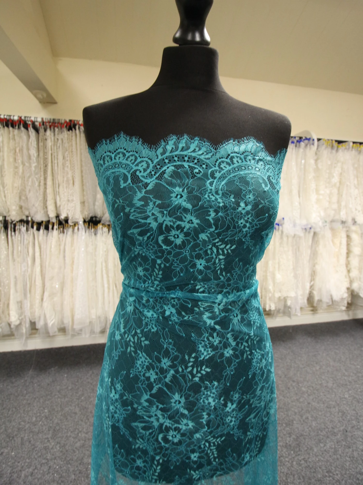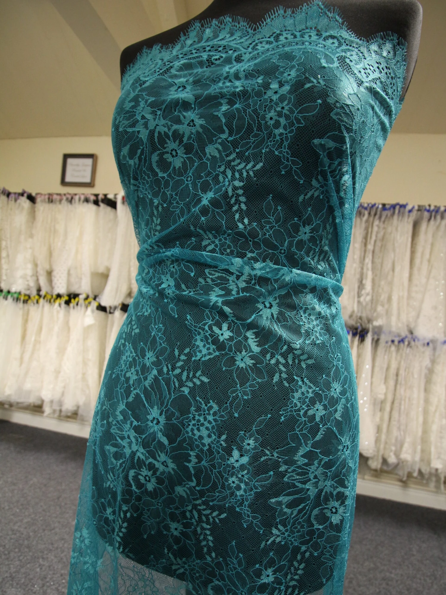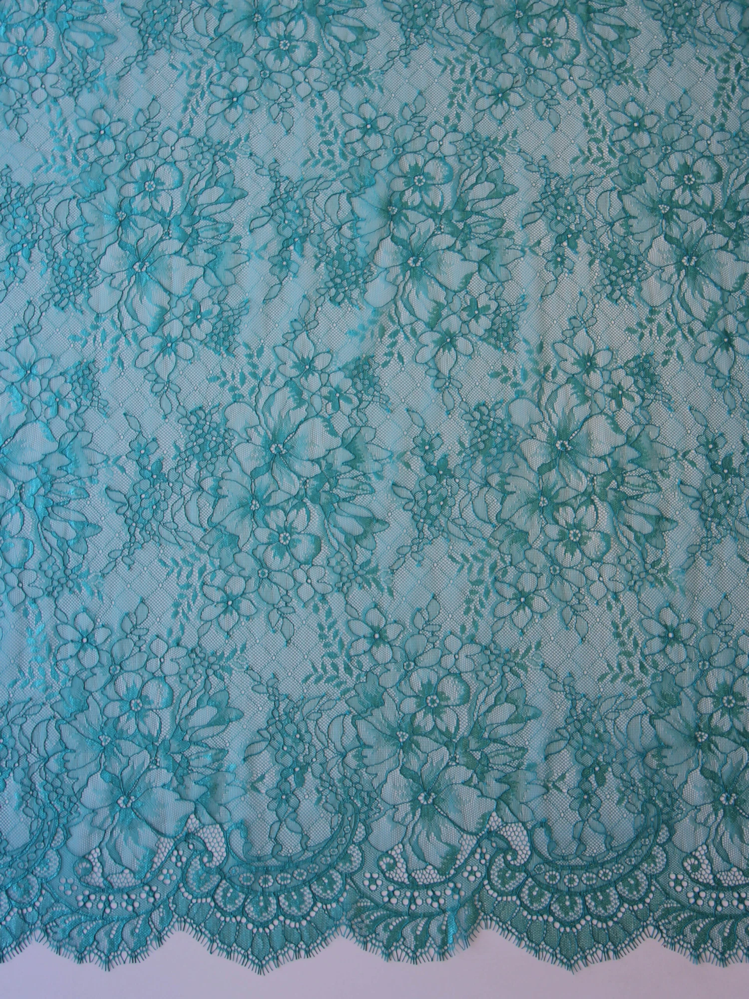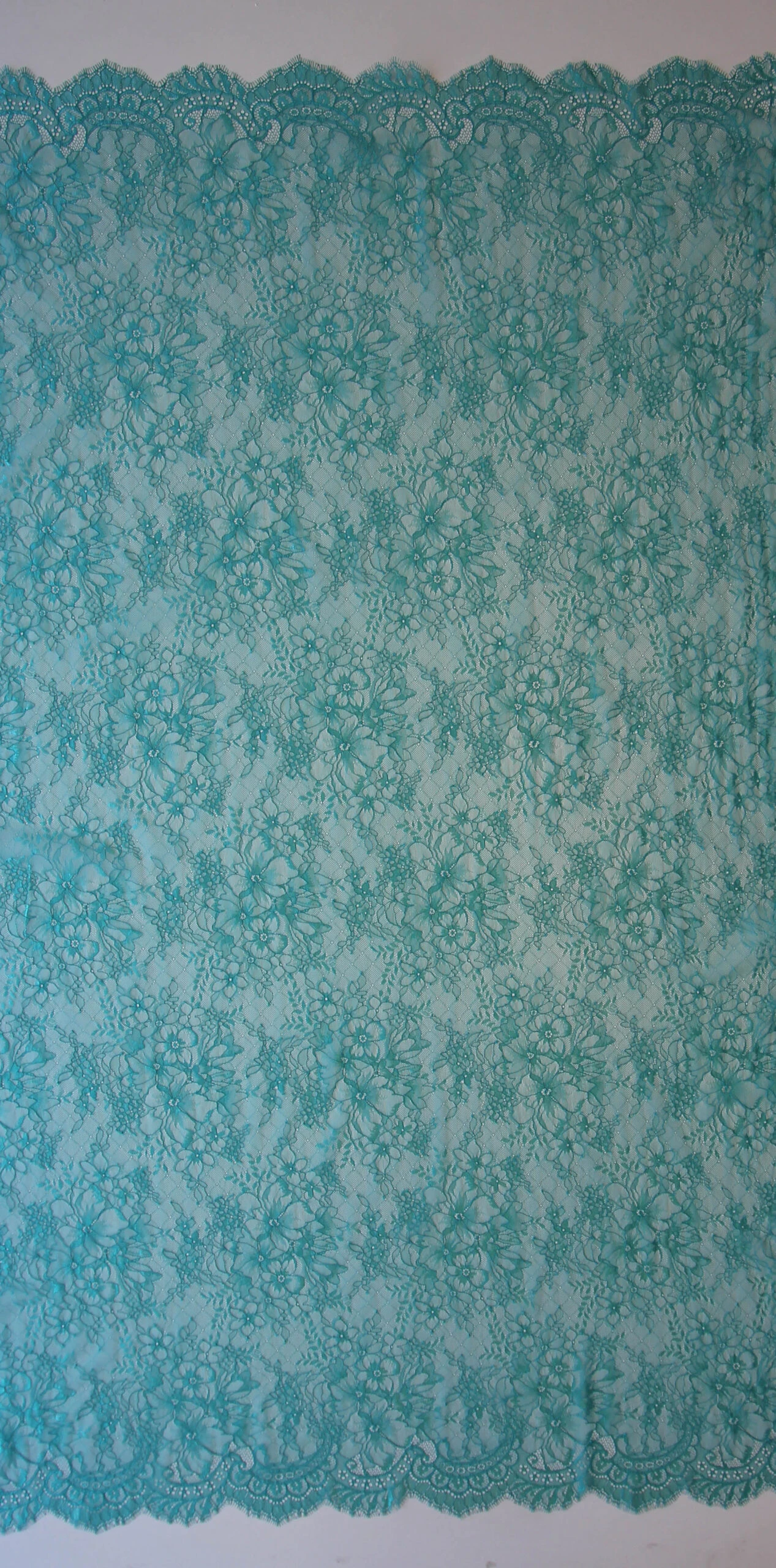 A lightweight aqua blue lace with an all over floral design, that measures 142 cm (56″) from edge to edge across the width.