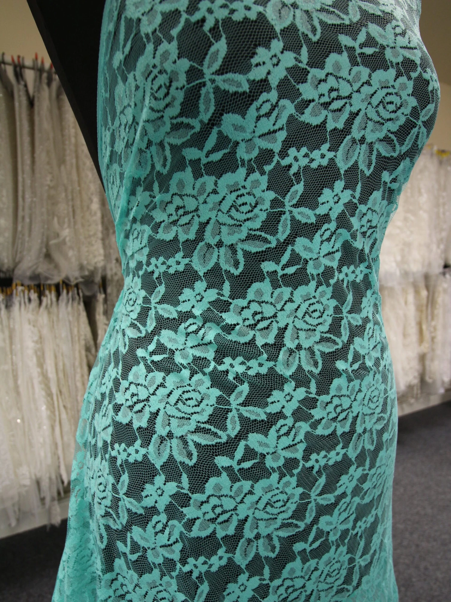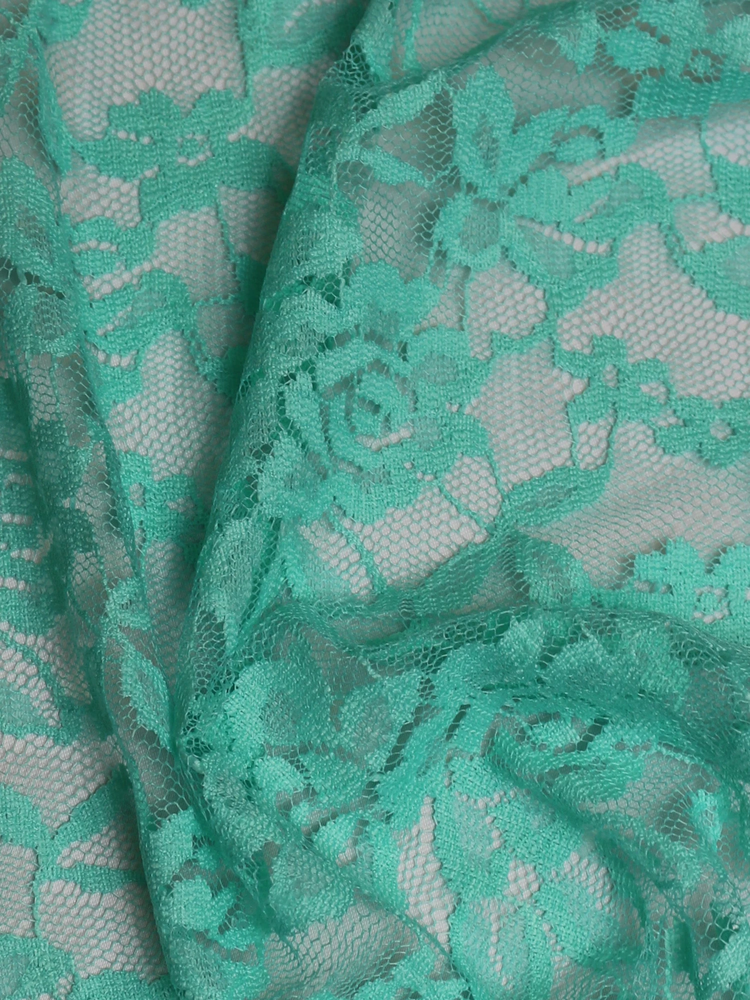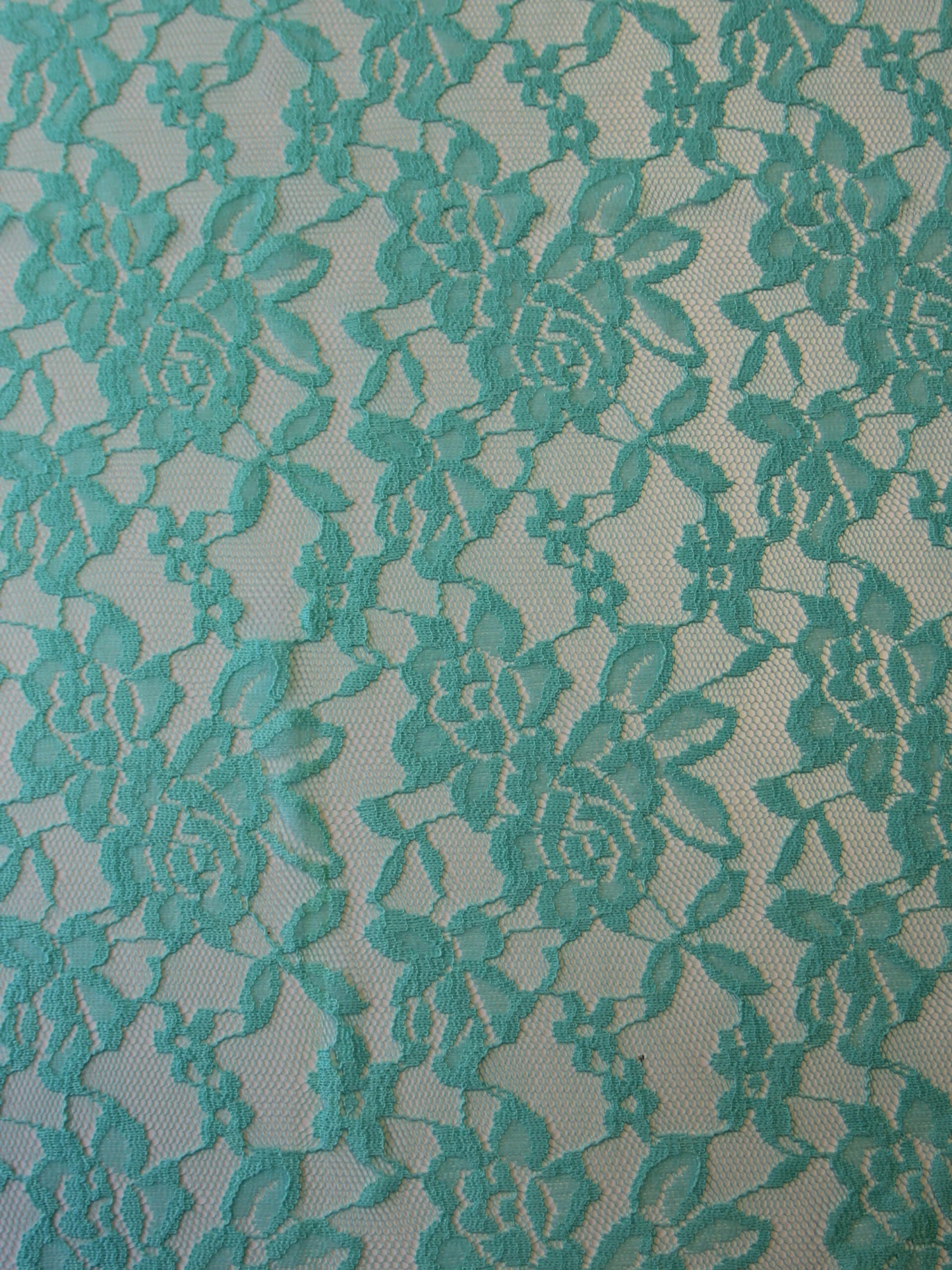 An attractive rose motif runs throughout the body of this aqua colored lace and interconnects with the other motifs. Both edges are plain.
