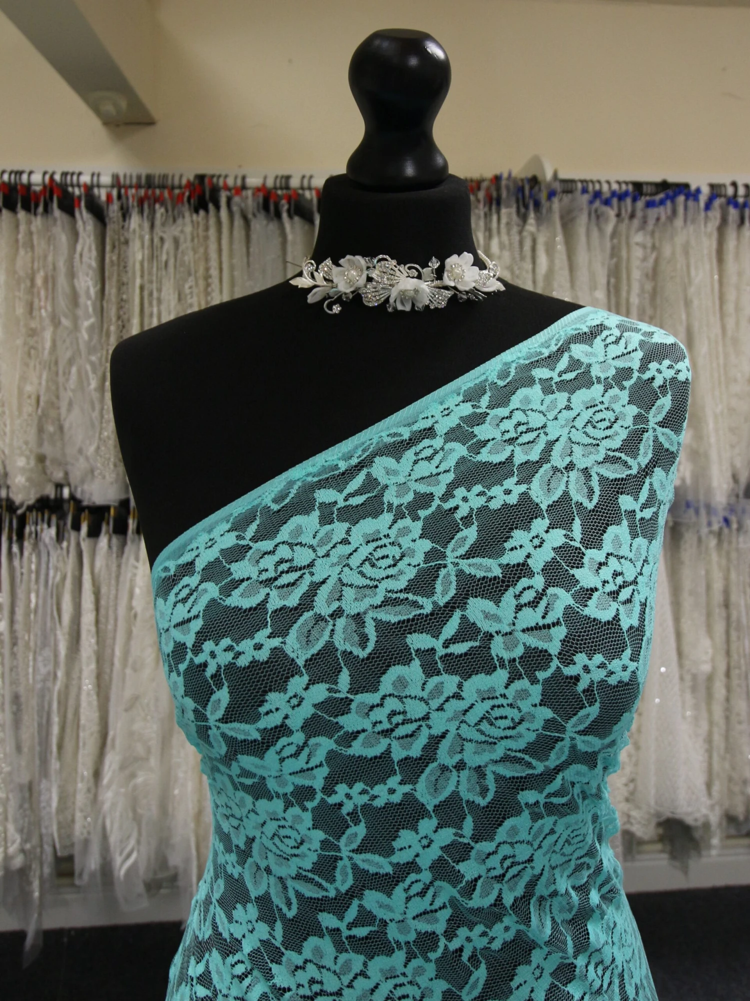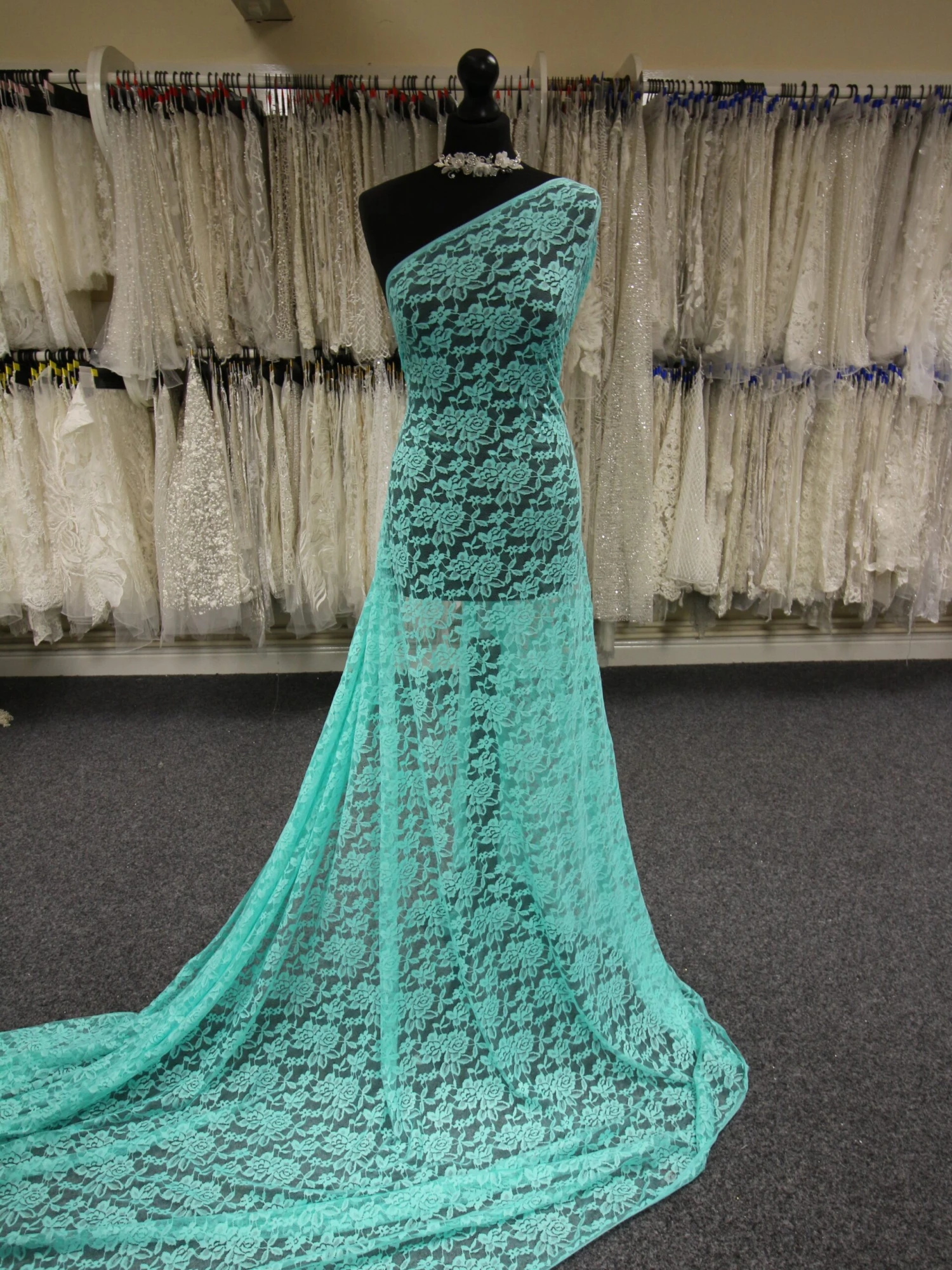 This lace measures 156 cm (61″) from edge to edge across the width and has elasticity in both directions.Â