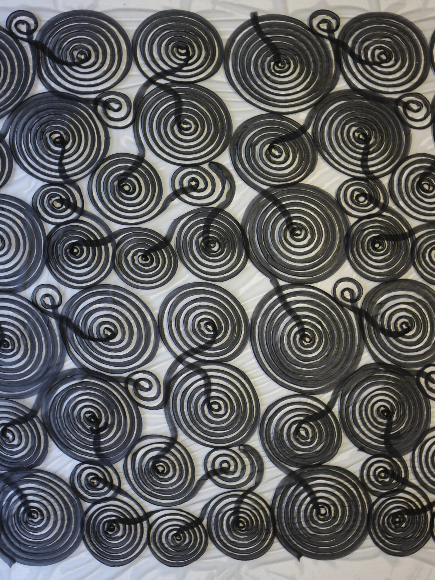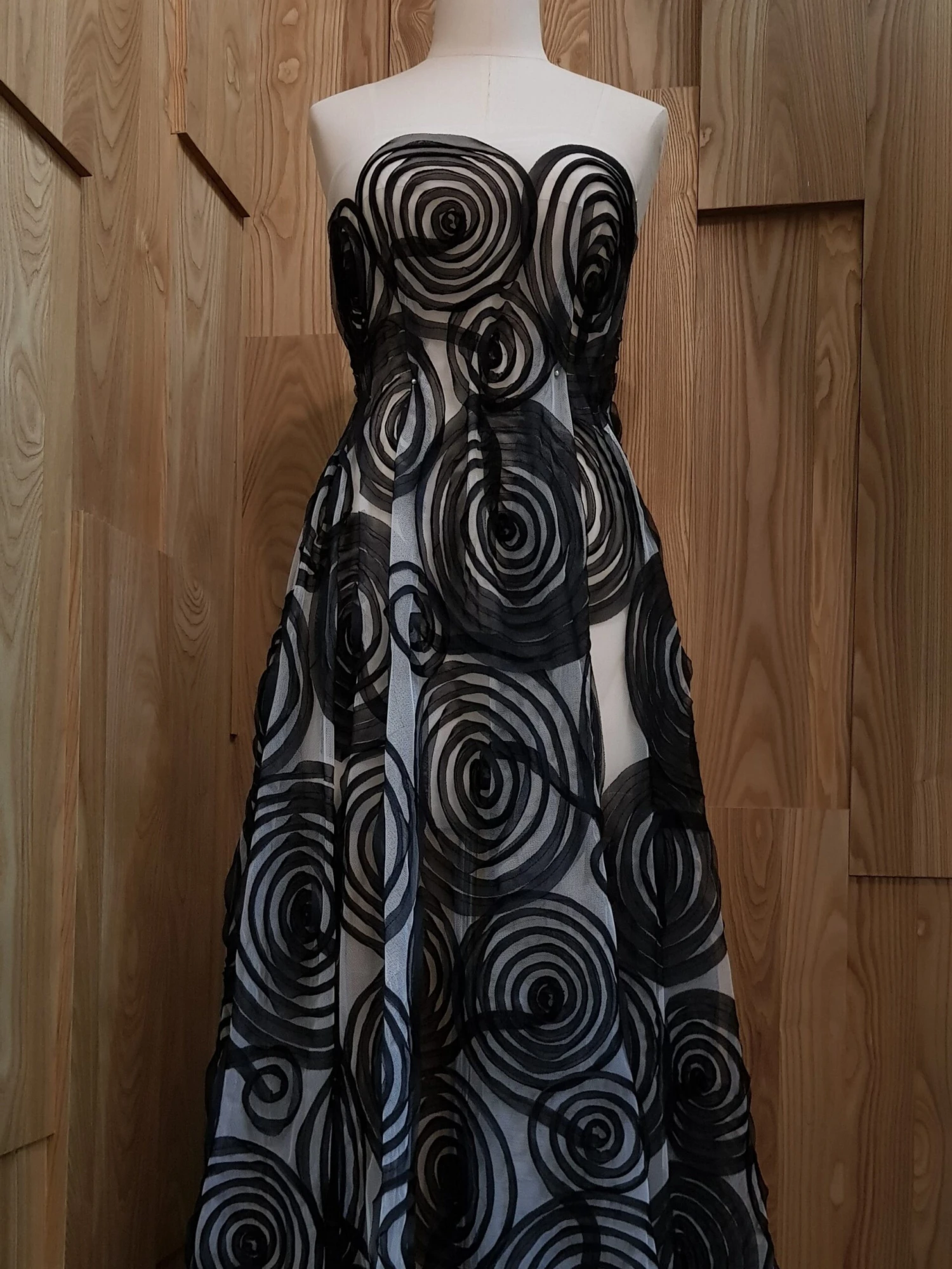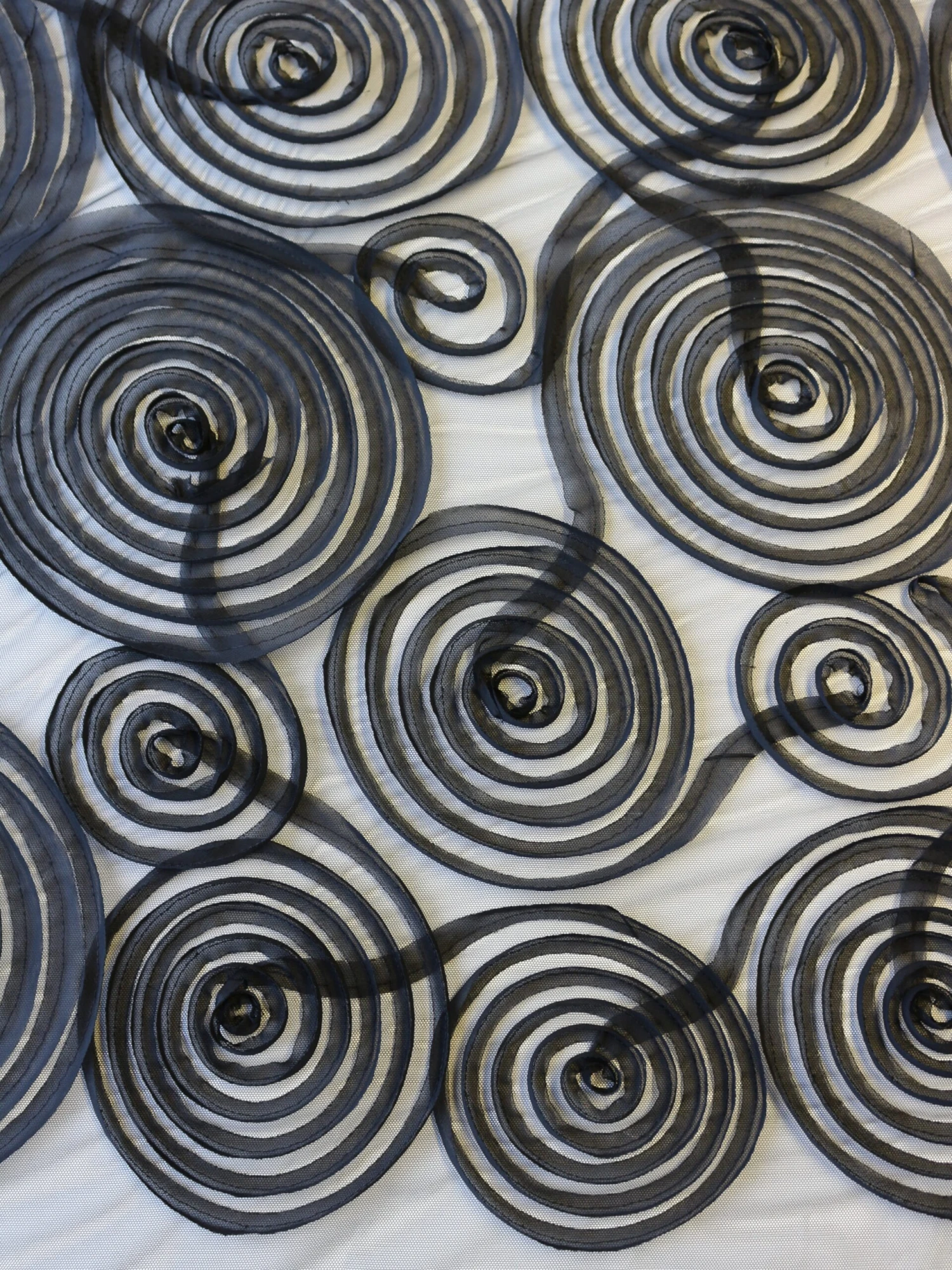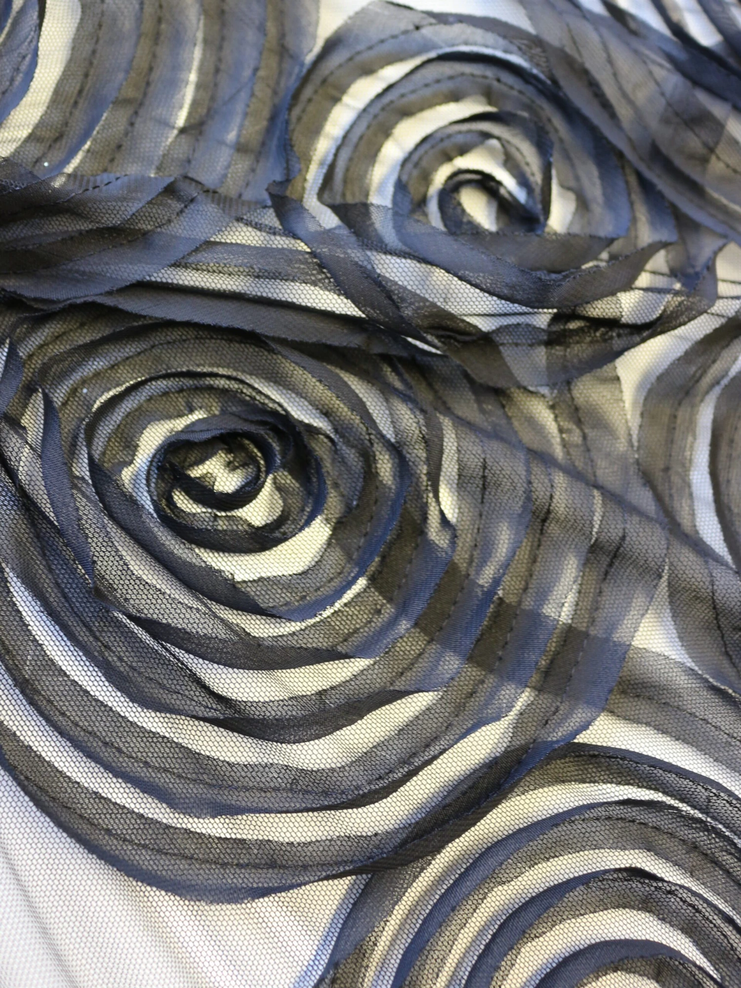 A dramatic and contemporary styled design made up for swirls, that measures 132 cm (52″) wide. The base is a tulle that has been decorated with a strip of georgette fabric that stands upright against the base.Â