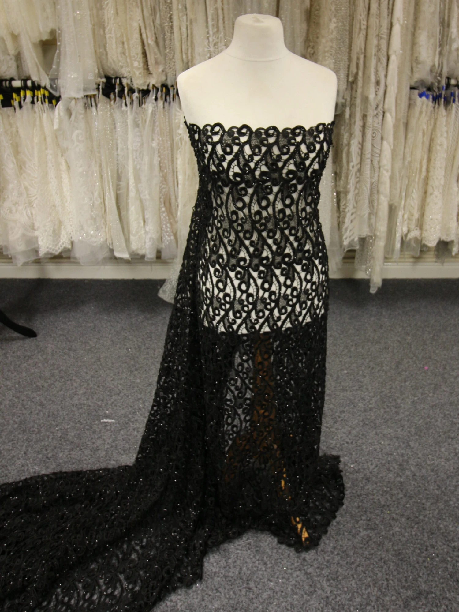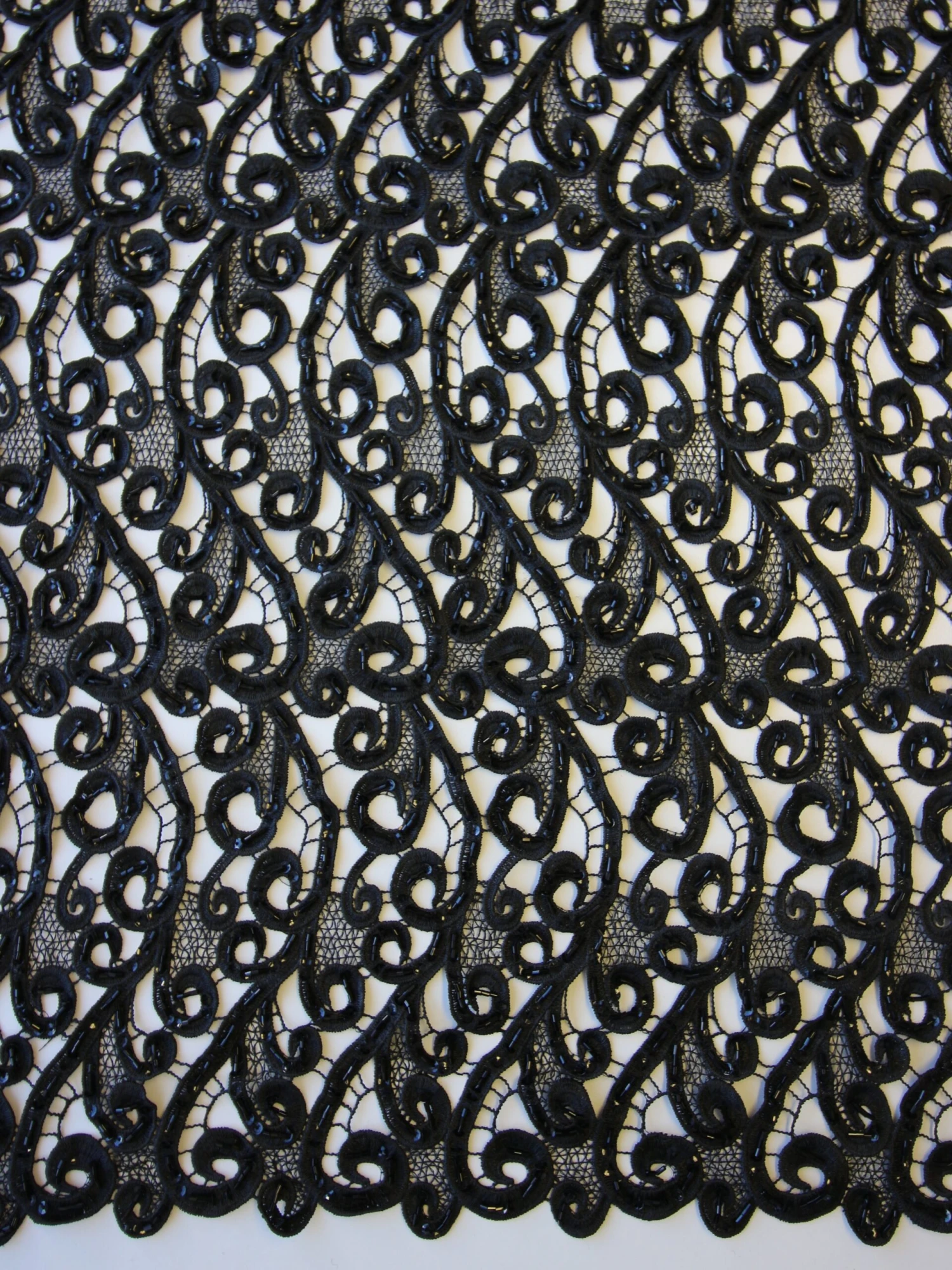 A chic, modern black lace with an adornment of beads and sequins to add sparkle. The non-floral contemporary design features swirls and has an open weave as opposed to a tulle base. An attractive design for evening wear and special occasion wear this lace is available from stock with no minimums and international delivery. It measures 132 cm (52″) wide.