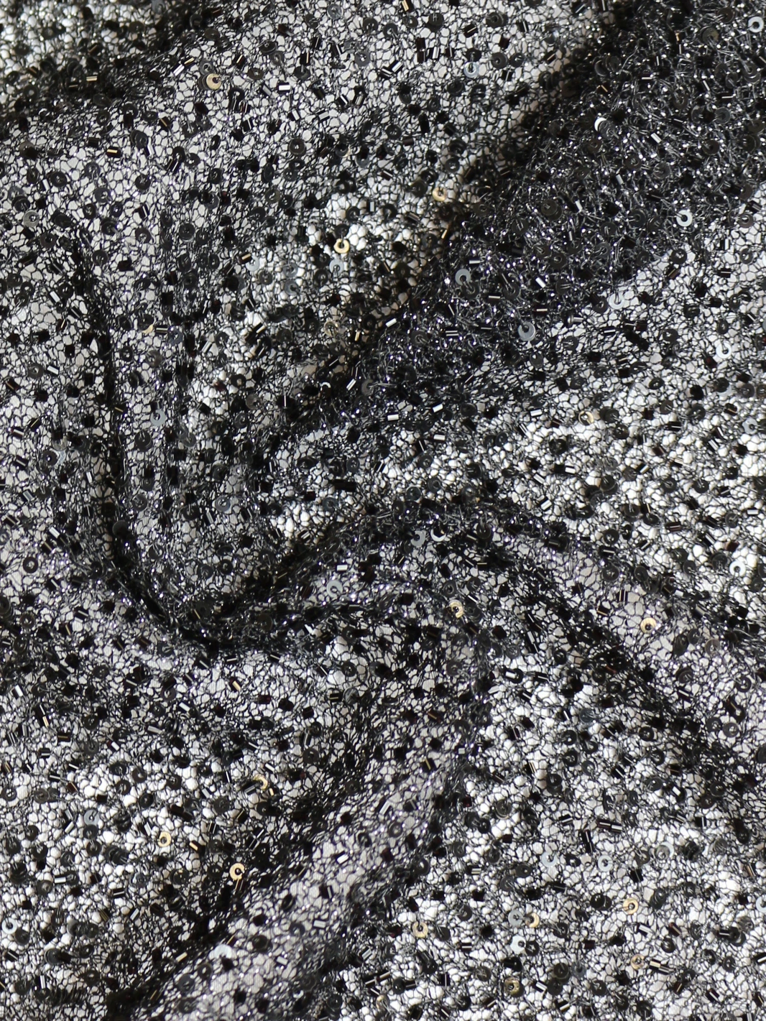 Britte is a hand embroidered lace that has been formed by sequins and beads on a delicate mesh type base fabric. This has a silver thread running throughout, that really is eye catching.