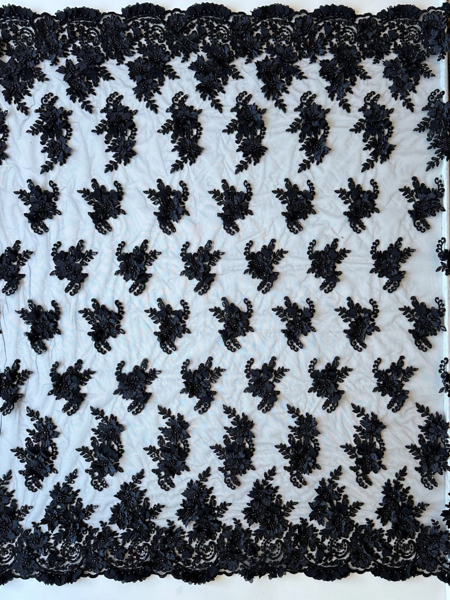 This lace measures 132 cm/52″ wide and features large all over 3D flowers (5 cm/2″ across), the centre of which is decorated with black beads. Both edges of the laces have the same decorative border that extends into the pattern 27 cm (11″). The motifs in the body of the lace alternate over 2 styles and measure 19 cm (7.8″) x 10 cm (4″) and 13 cm (5″) x 9 cm 3.8″)