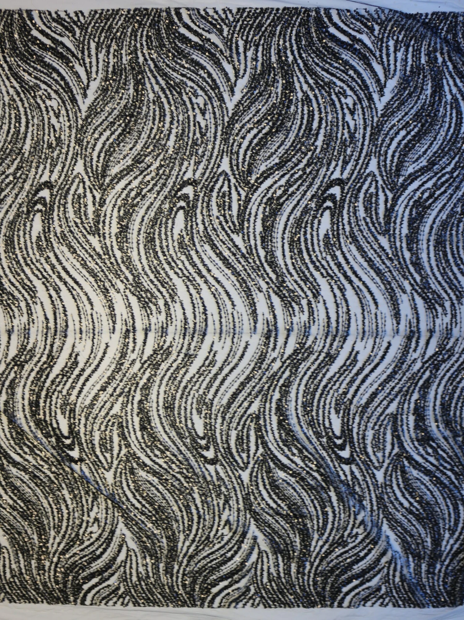 A glamorous and heavily bead and sequin embellished tulle base, this is black in color.