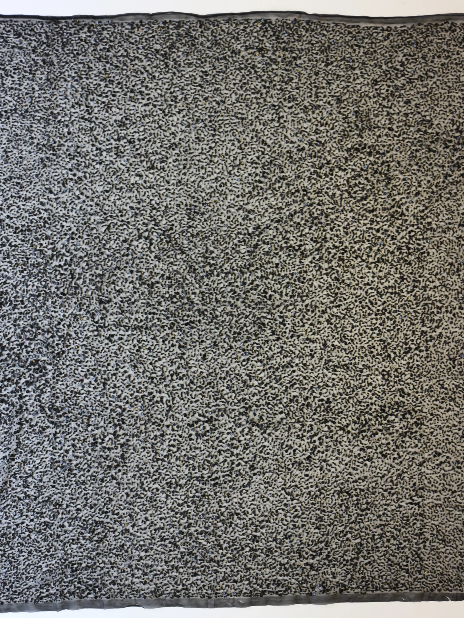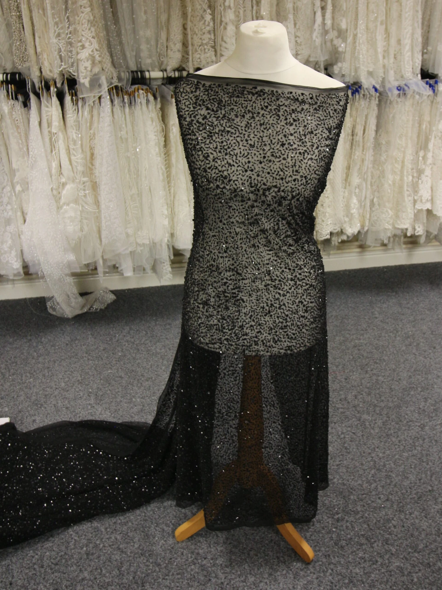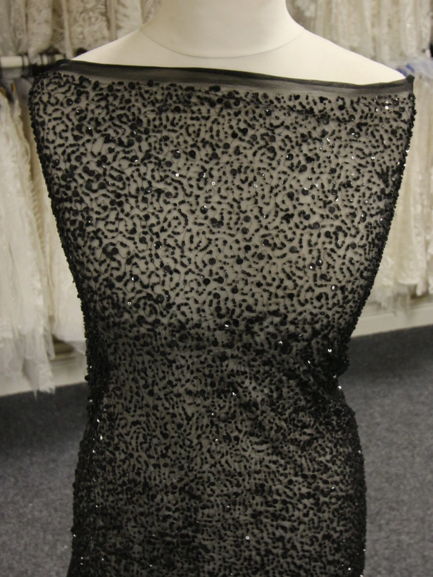 A superb, sparkling black lace that has global appeal. Perfect for an evening gown or for the alternative bride, this black lace has an black tulle base which has been embellished with a range of beads and sequins across the full width of the lace.
