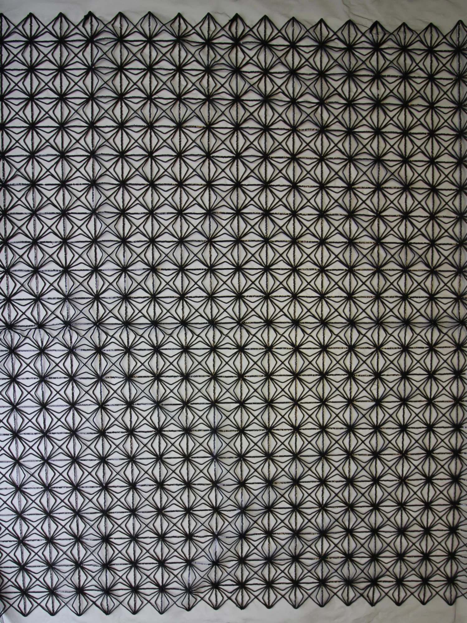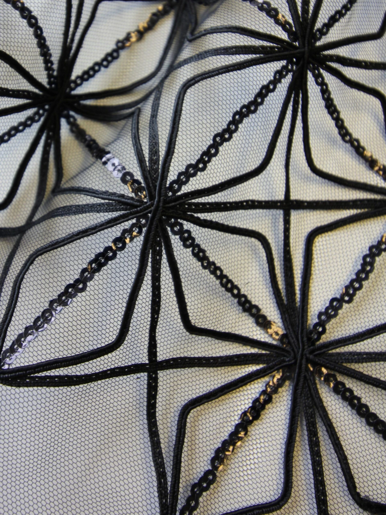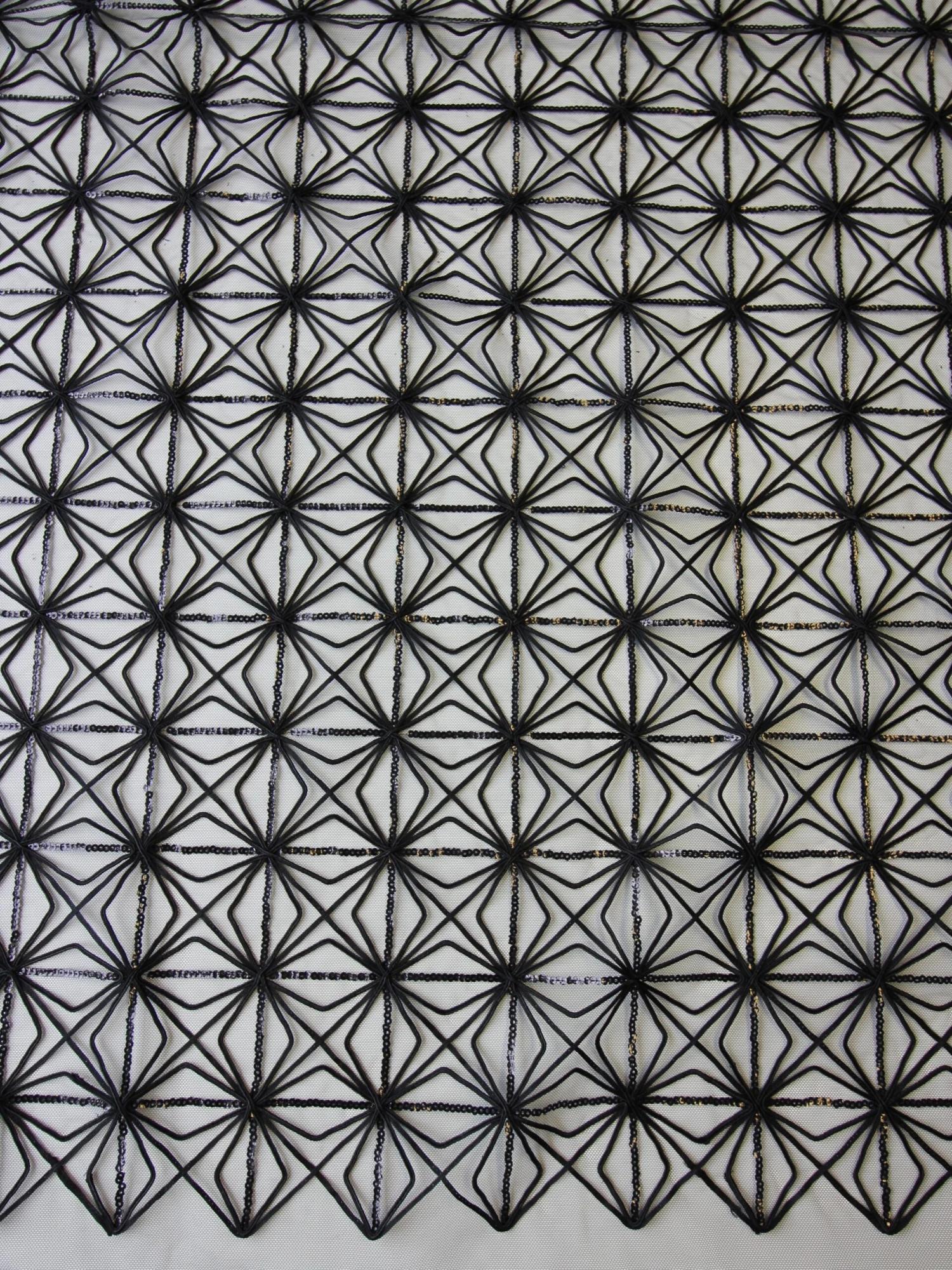 A contemporary and elegant black lace, which is comprised on a tulle base, with corded and sequinned detailing.