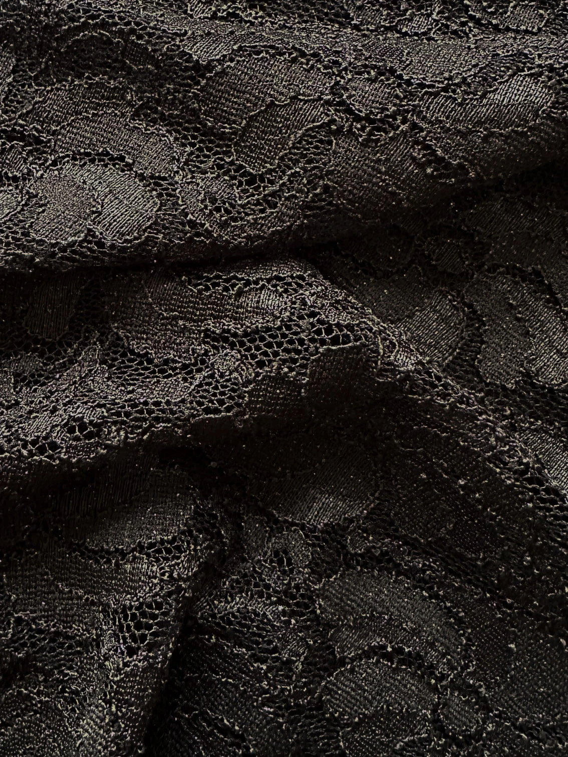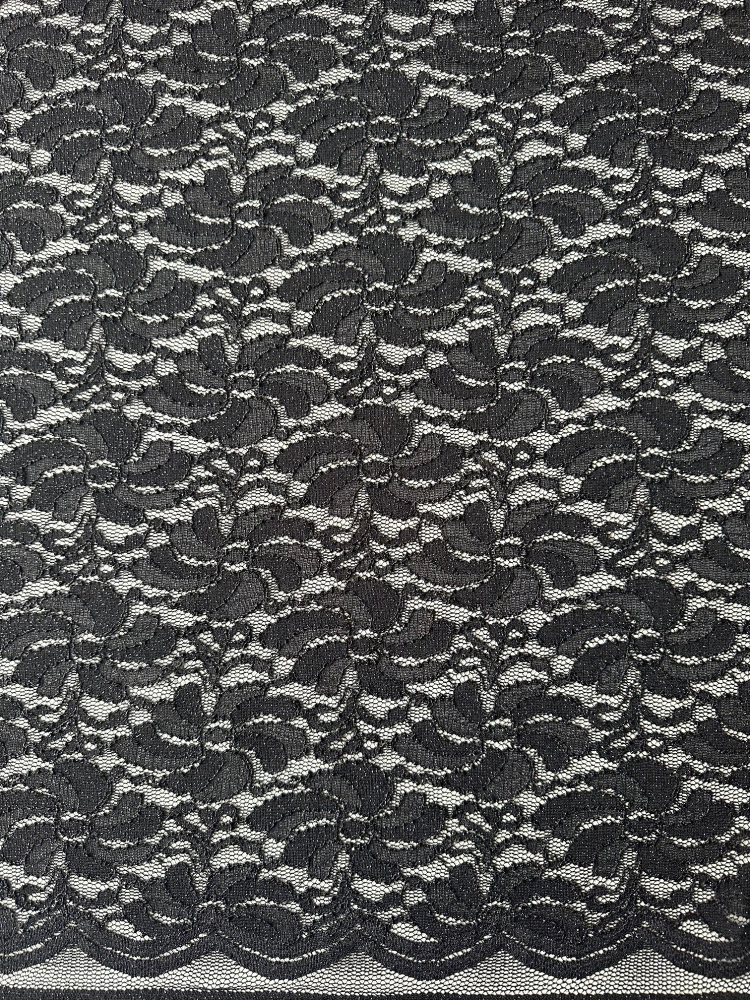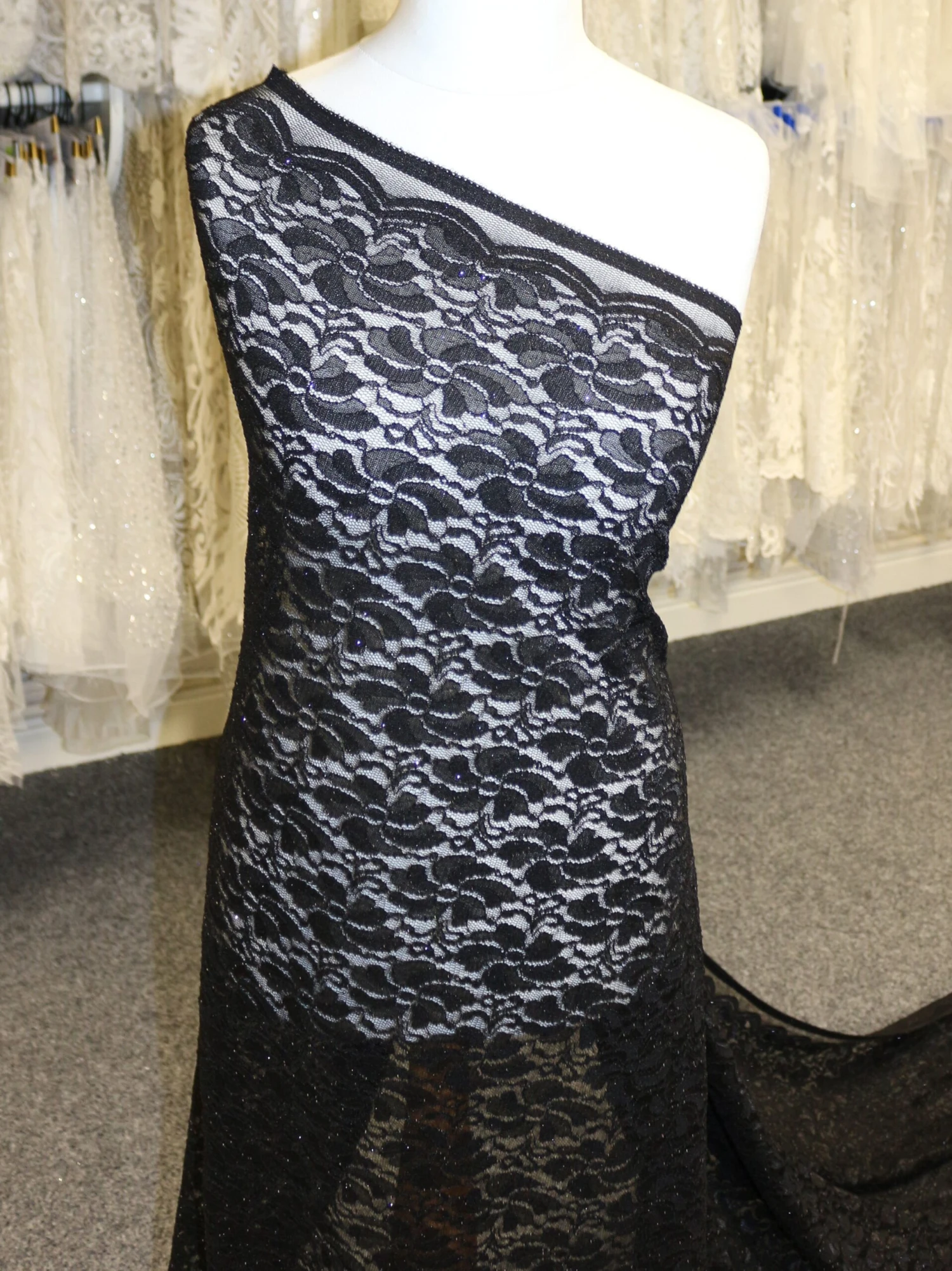 Vindication is a black glitter lace with stretch that is designed to offer superior flexibility and durability. The fabric measures 145 cm (53″) wide and features an opulent floral pattern with matching scalloped edges. You can see this lace here in black but it is also available in a range of other colors.
