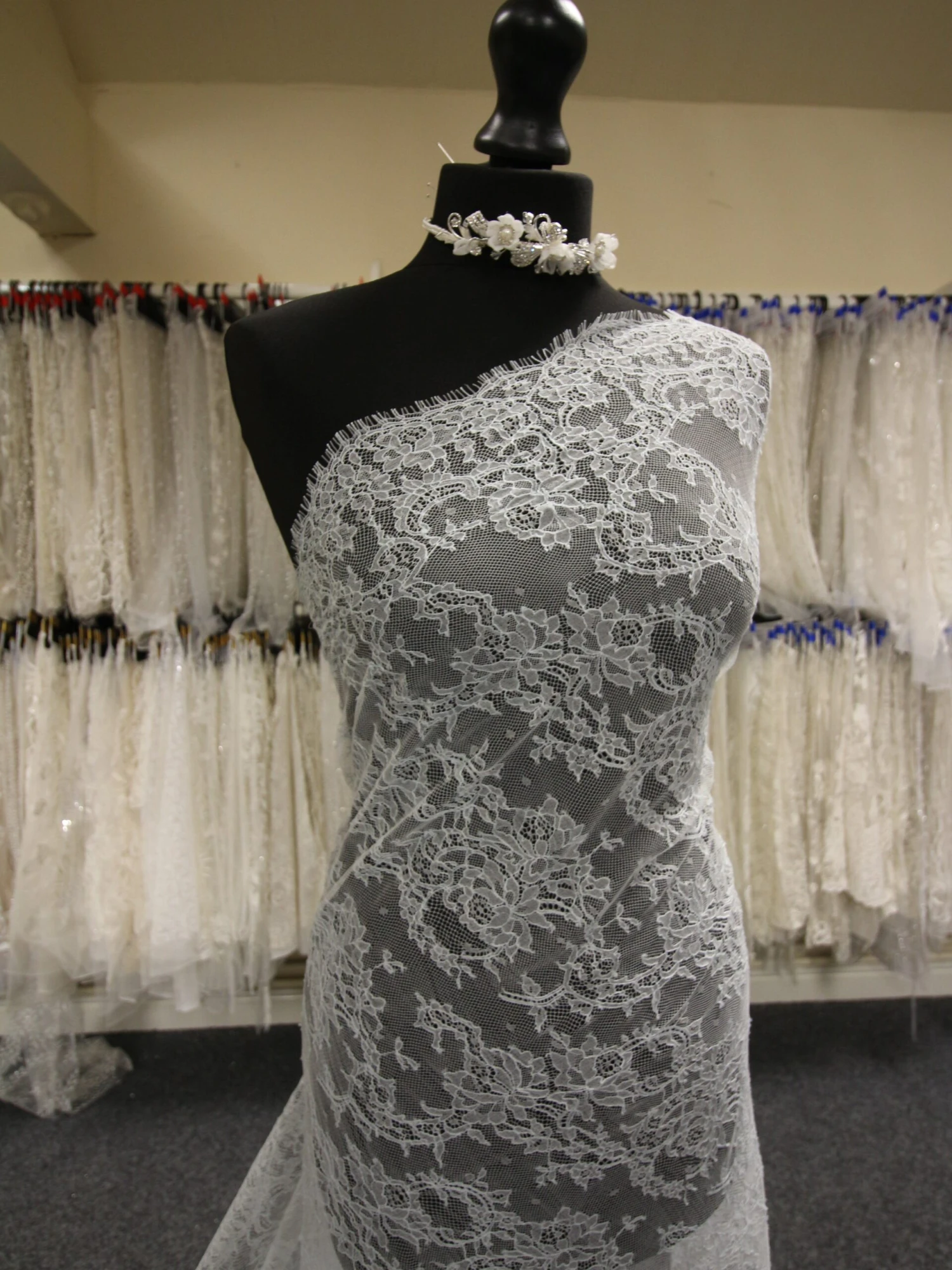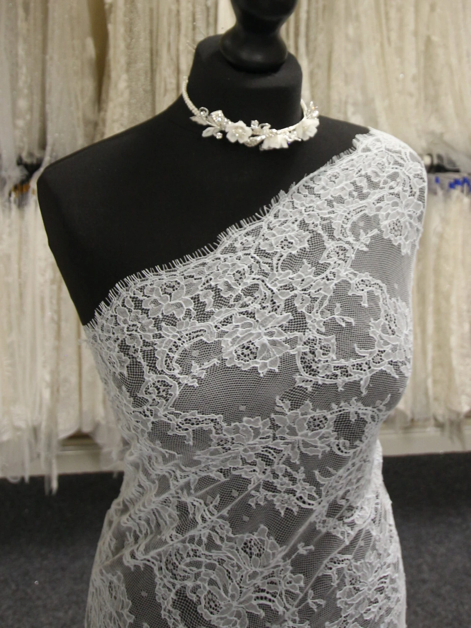 This lace is also light enough to be used for veiling. The lace measures 90cm (35.5″) wide and is available from stock, ready for worldwide shipping.