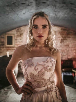 A blush pink embroidered lace which has matching scalloped borders and measures 132 cm (52″) wide. The design is a very attractive floral pattern, the largest flower in which measures approx 8 cm (3″) across.