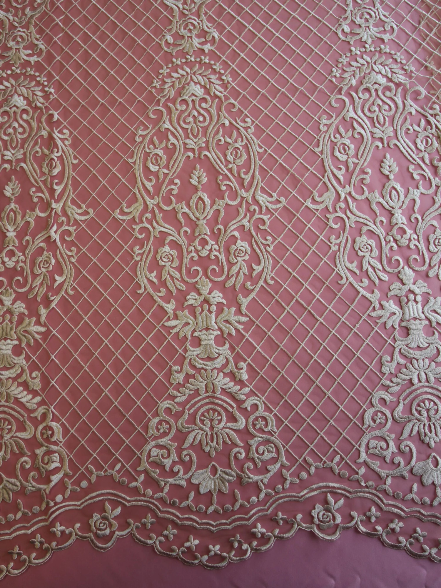 A stunning embroidered champagne tulle using dark ivory thread. The embroidery measures 132 cm/52″ from edge to edge and forms a scalloped border on just one side. The pattern repeats on 30 cm (12″) and features a glamorous lattice and contemporary, non floral design.