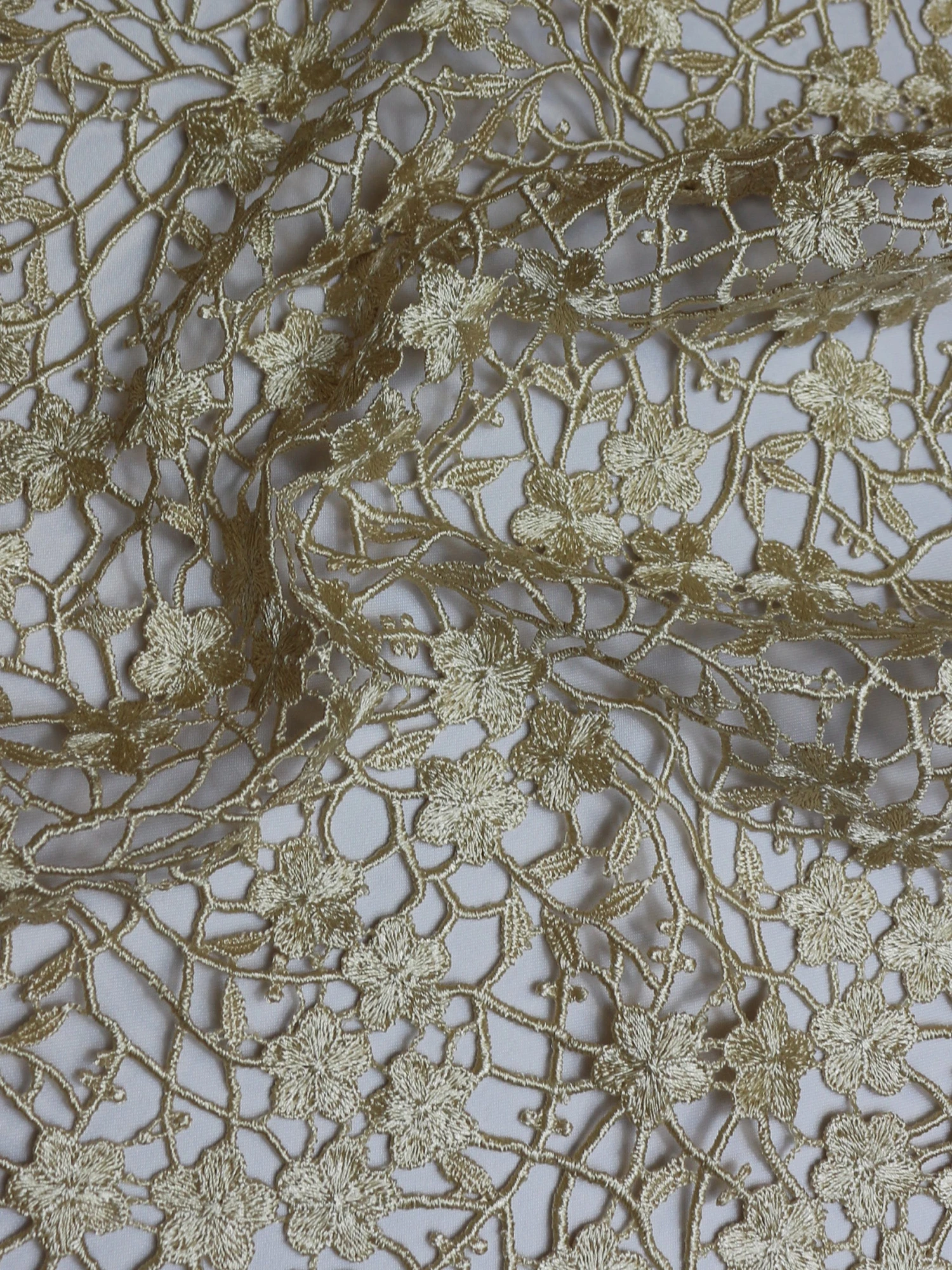 The nature of Guipure lace means that the motifs, in this case lovely flowers, are interconnected – there is not tulle base. We offer this lace in a range of colours including Champagne.