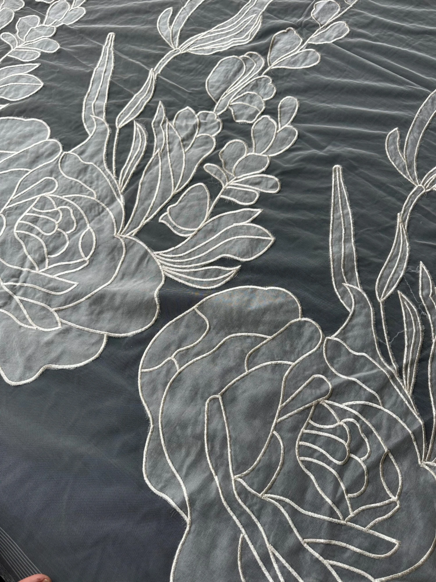 Braylee is an on trend large scale embroidered lace in a rich ivory or champagne colour. The design is of large flowers and stems reaches about half way into the tulle base.