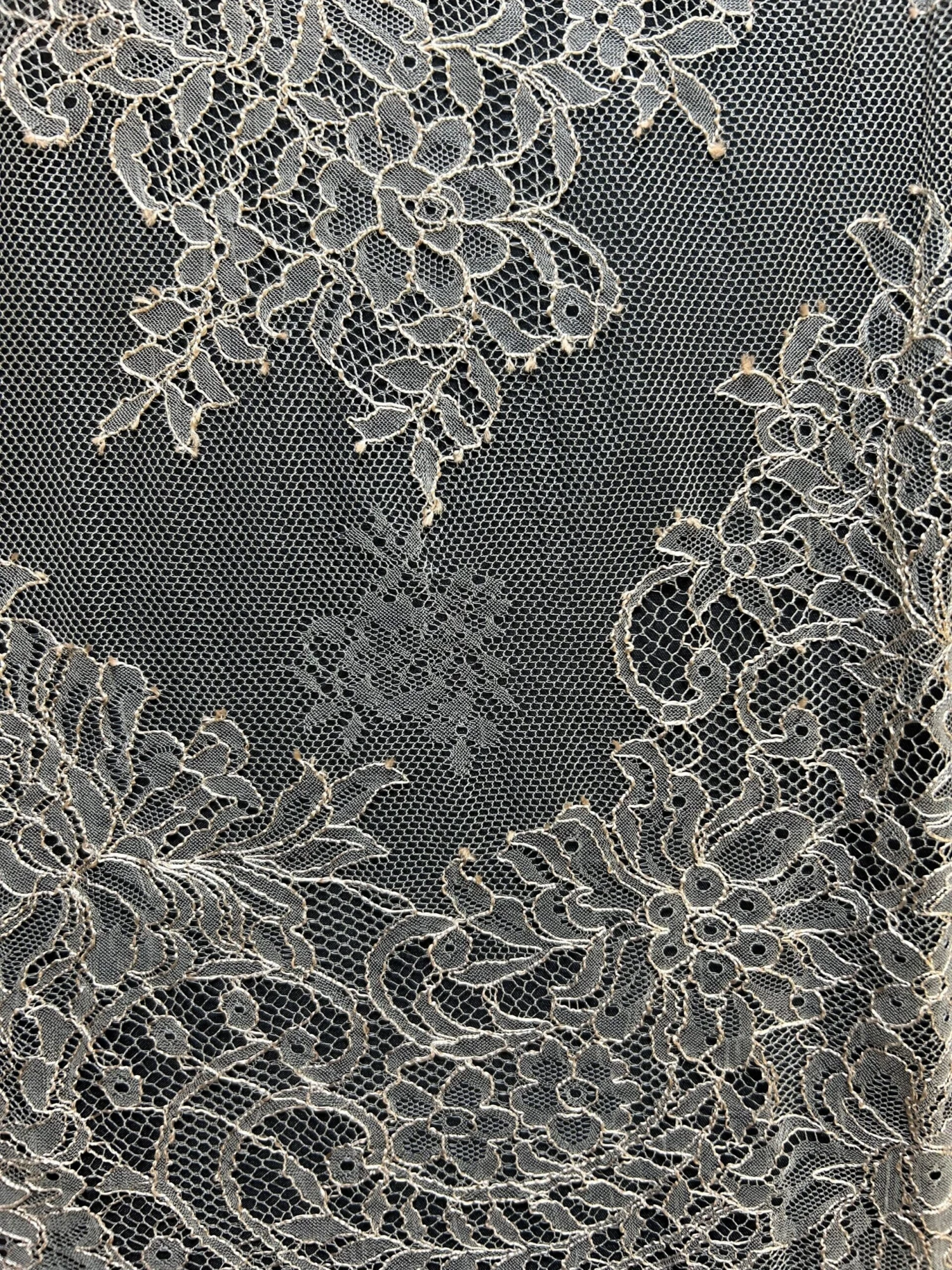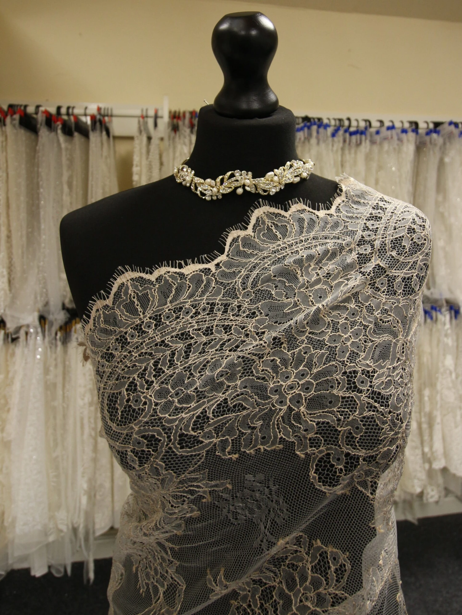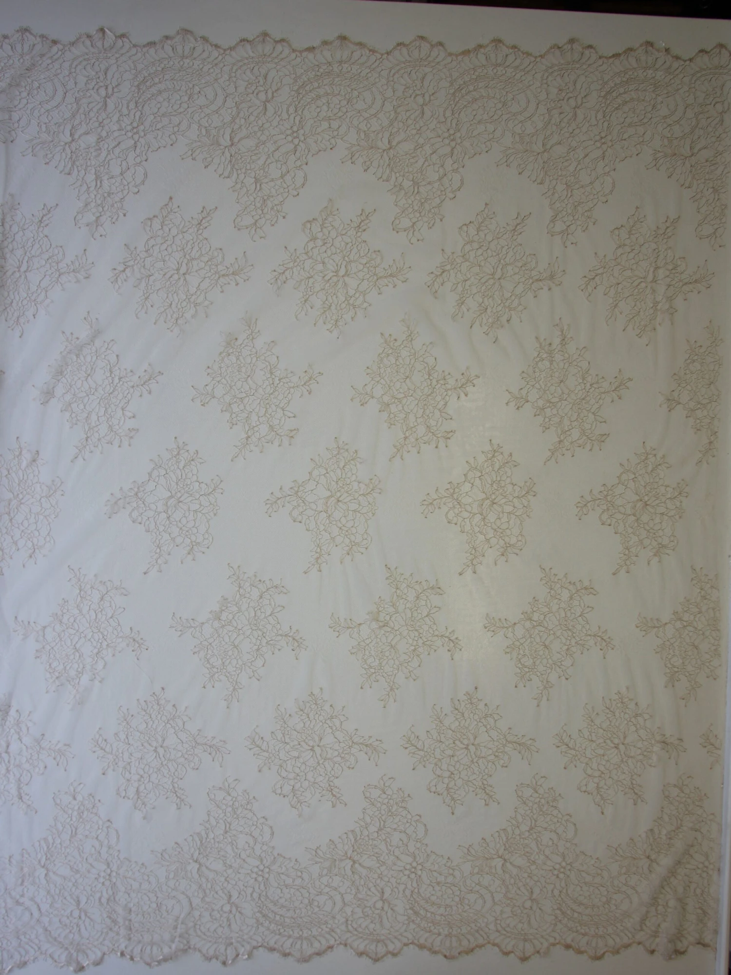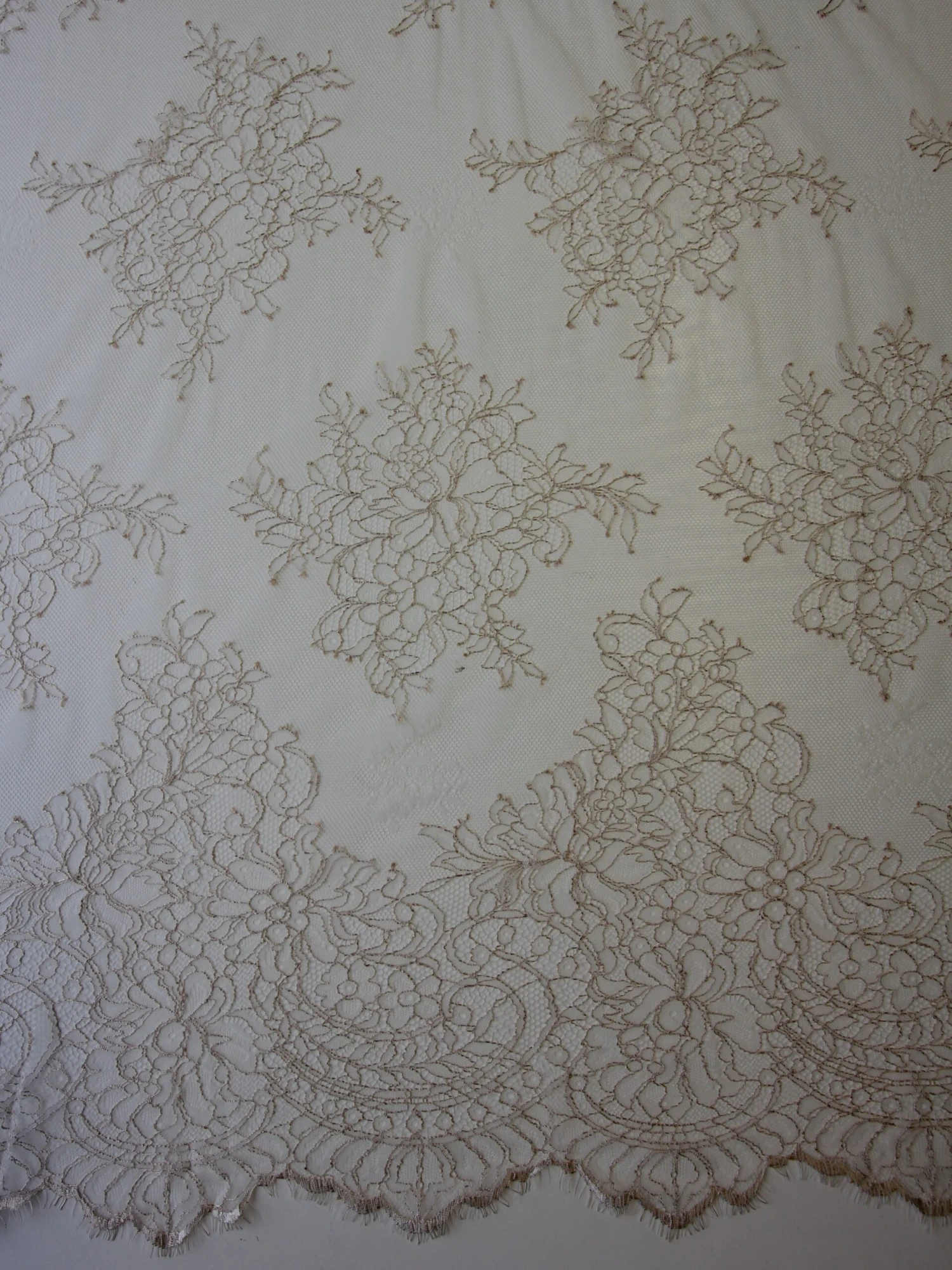 A Champagne coloured lightweight bridal lace with matching fringed and scalloped edges. Coralie measures 145 cm (56″) wide and will look beautiful over a satin dress fabric.