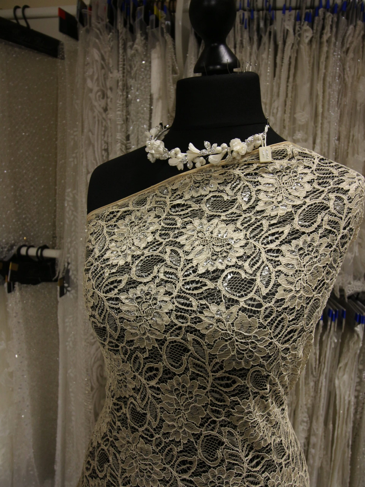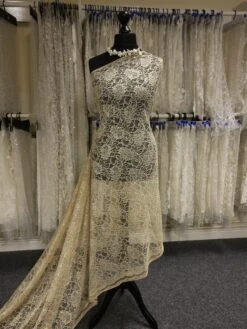 The lace combines elements of metallic yarn within the design that really ‘lift’ the aesthetic of this lace and give it a glamorous finish. This lace measures 110 cm (43.3″) wide and is available from stock. We highly recommend ordering a sample to really appreciate for yourself this intricate design and appealing look.