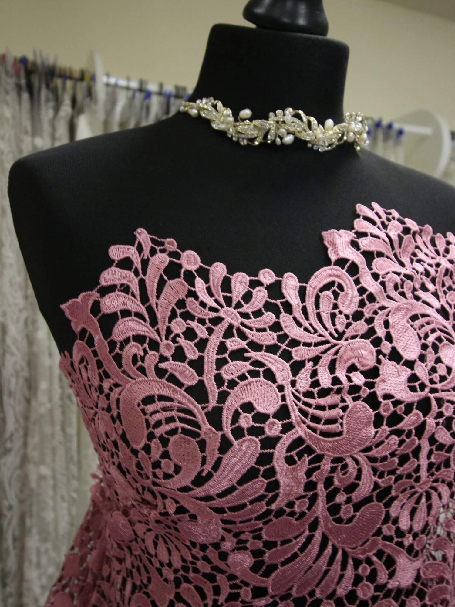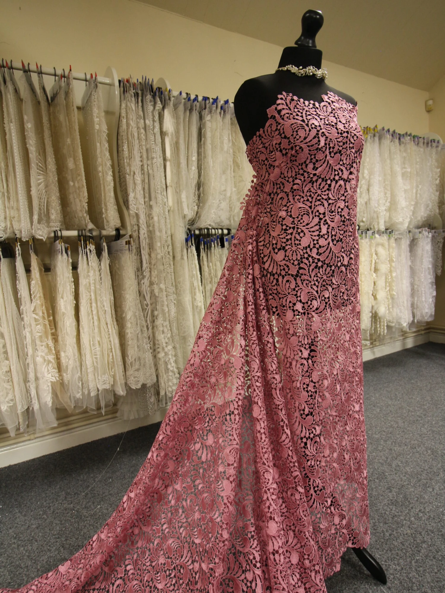 The lace features a lovely lustre and silky finish and is 132 cm (52″) wide. Also available in Green and Salmon Pink.