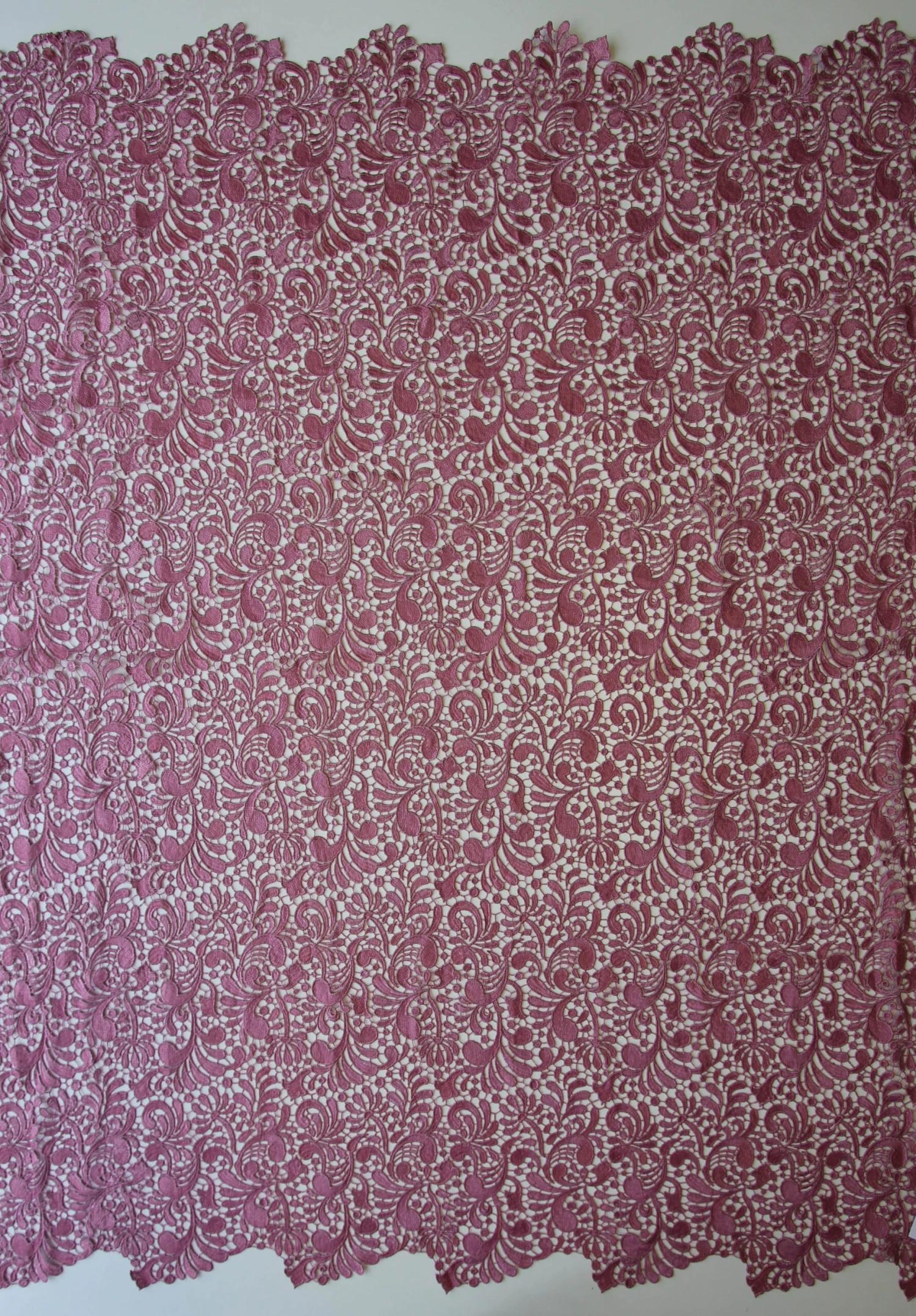 Theresa is a Guipure lace with a swirling design which repeats every 18 cm (7″).