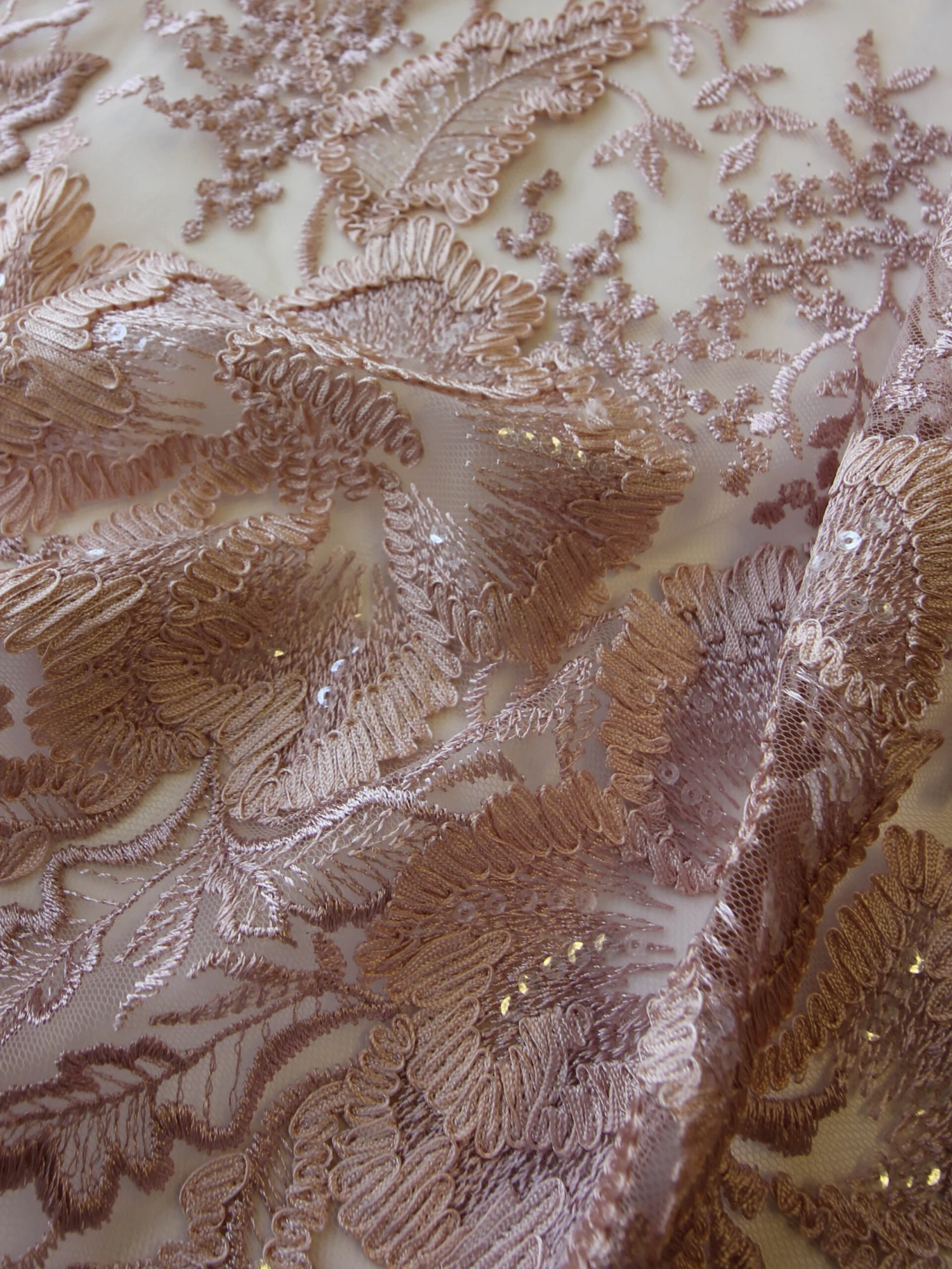 Bexley is a alluring lace that is a dusky pink colour and which measures 132 cm (52″) wide. The base is a tulle that has been delightfully embroidered and then embellished with cording and sequins.