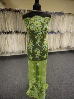 A very glamorous and eye catching green lace that measures 140cms (55″) across the width and has matching scalloped edges on both sides.