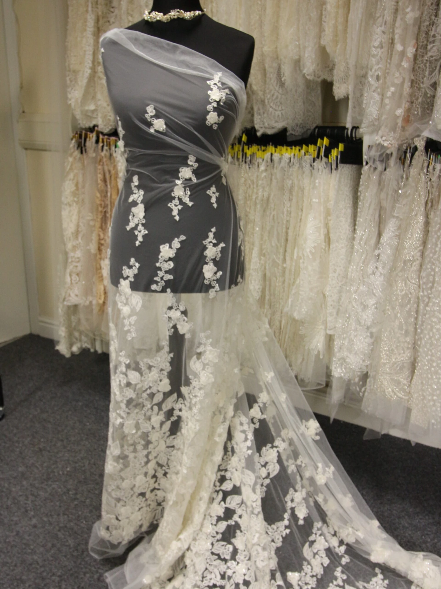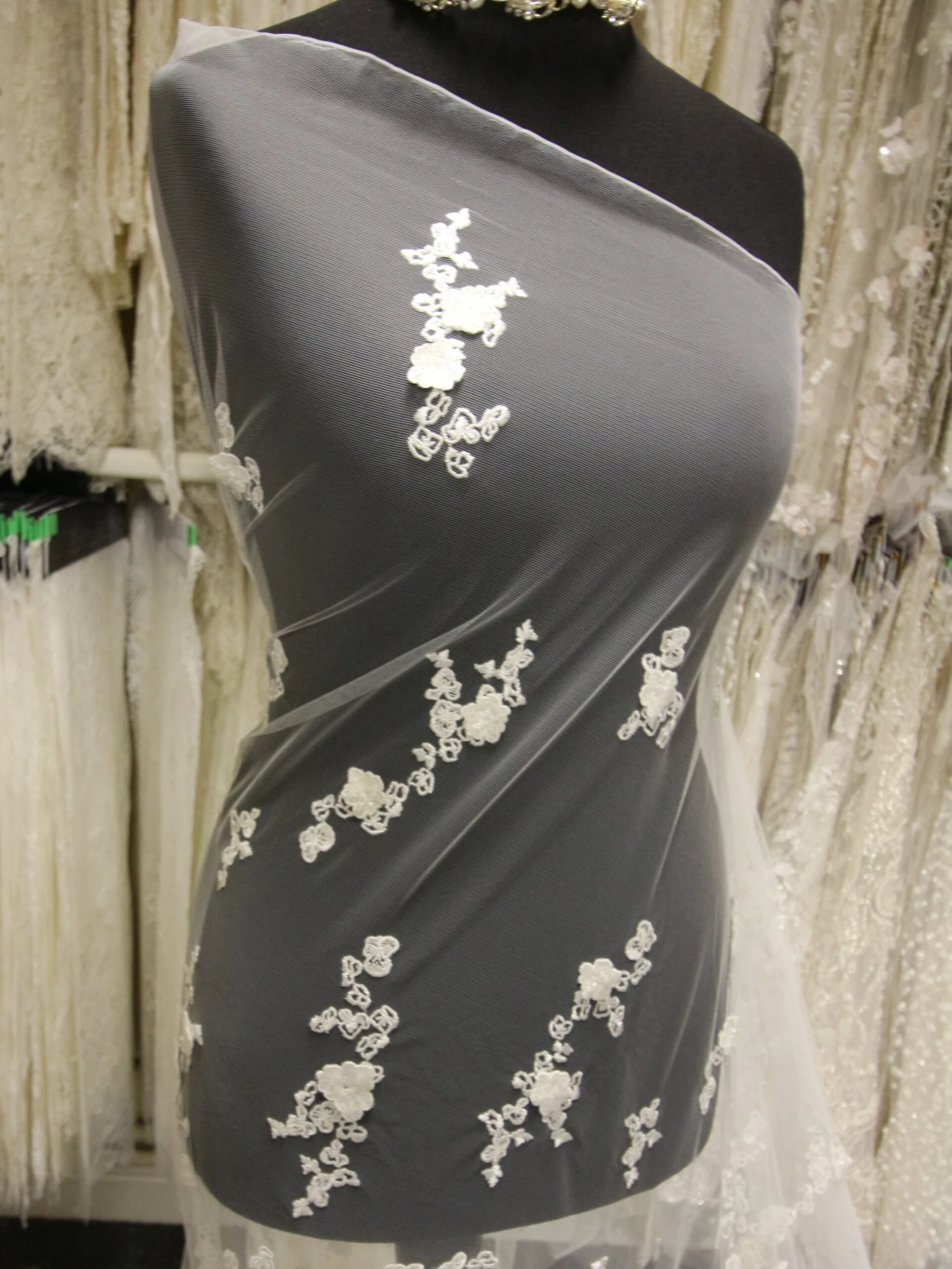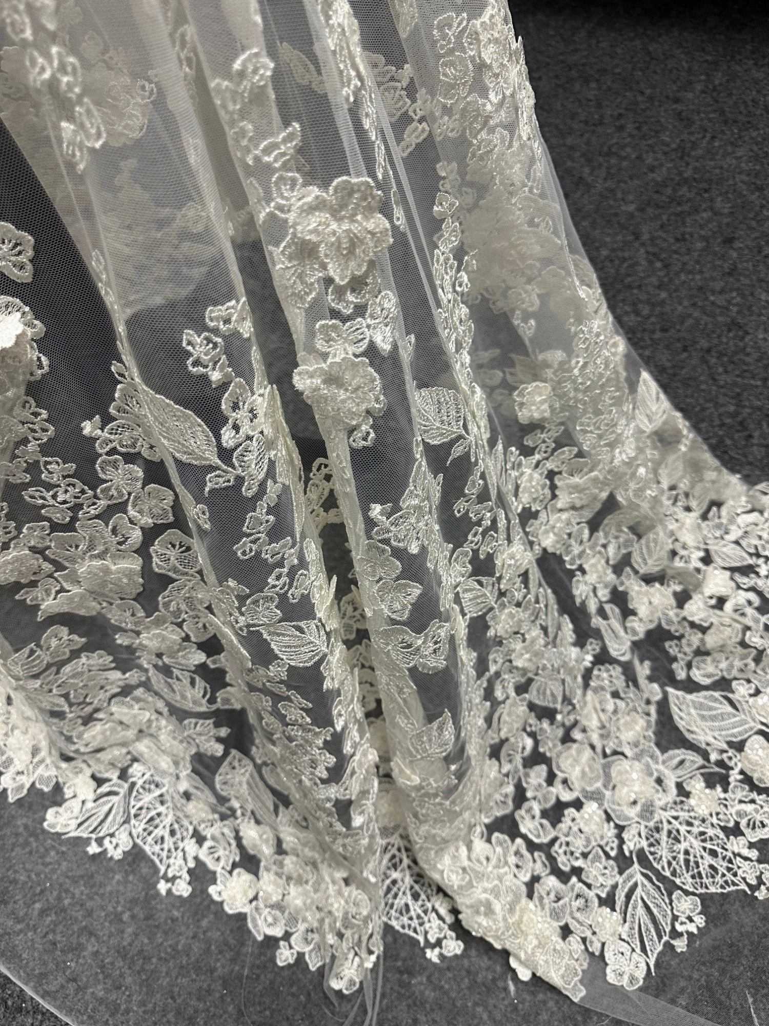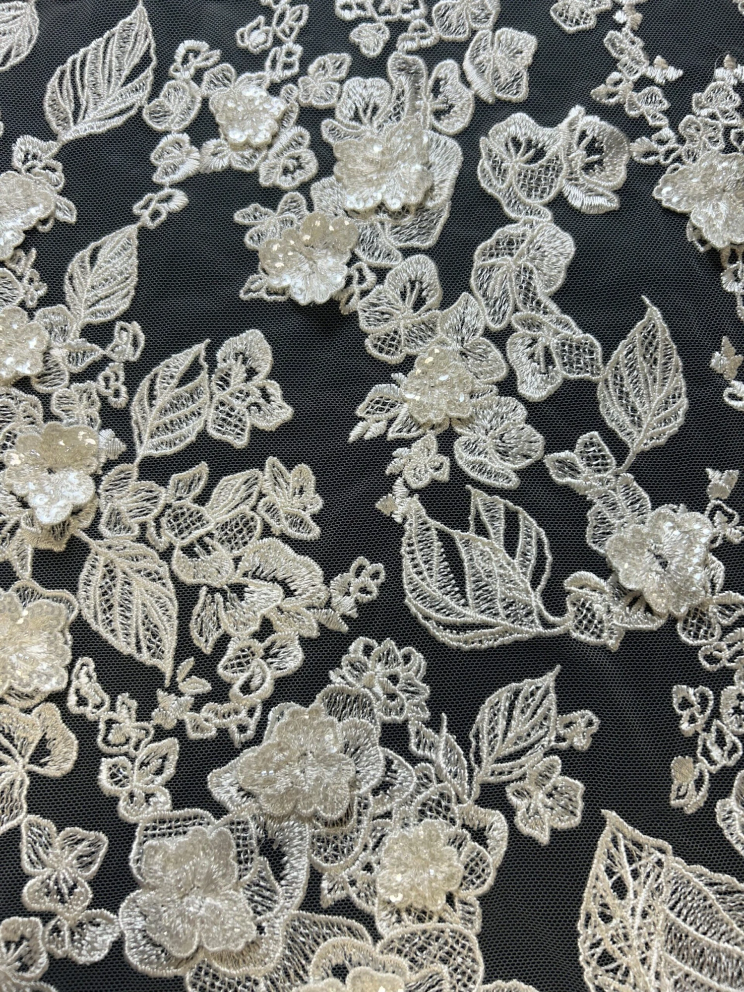 The base is an ivory tulle that has been delightfully embroidered with a contemporary leaf and flower pattern. A selection of the flowers are attached in their centres and sit proud of the base, to offer 3 dimensionality.