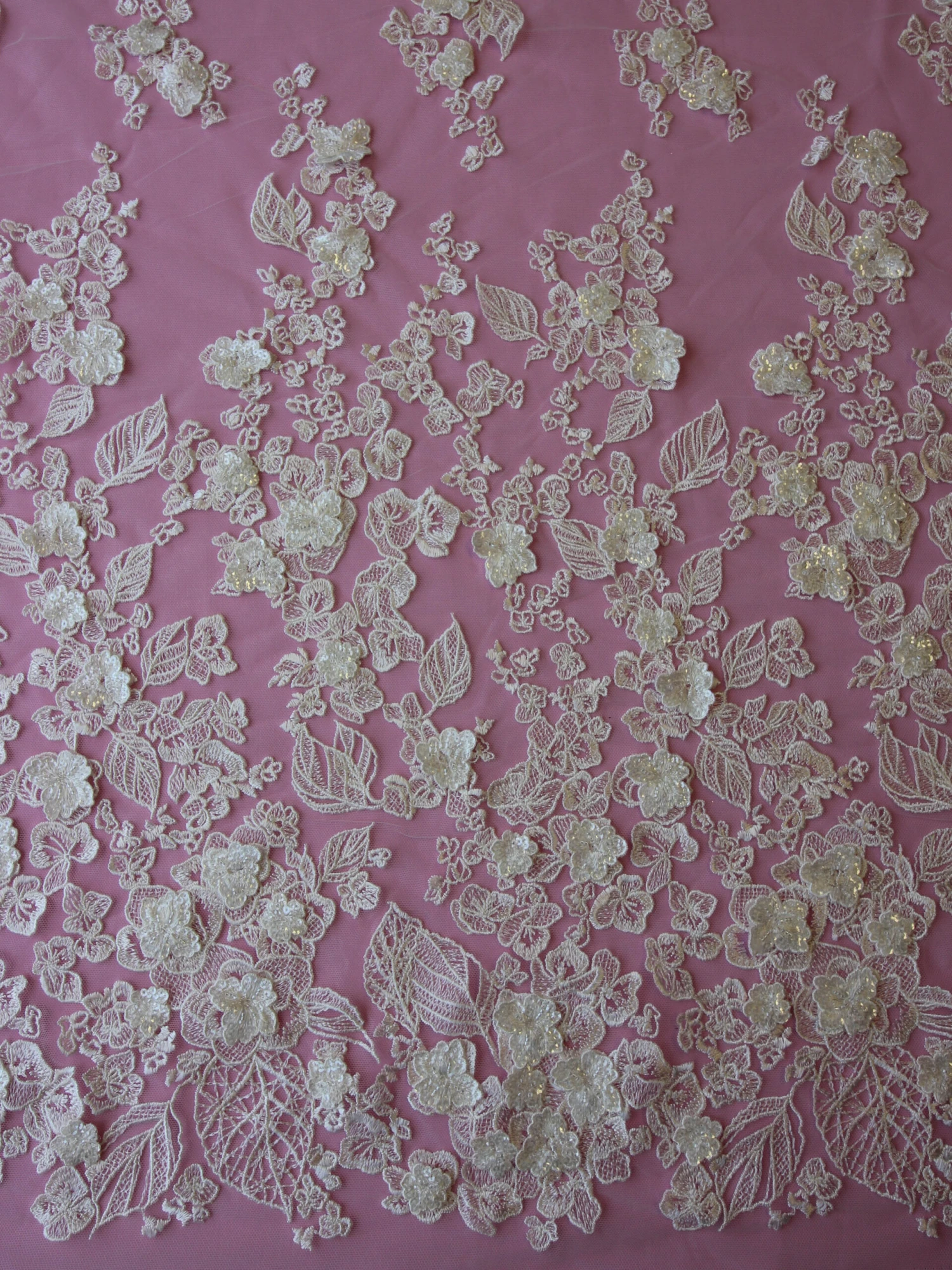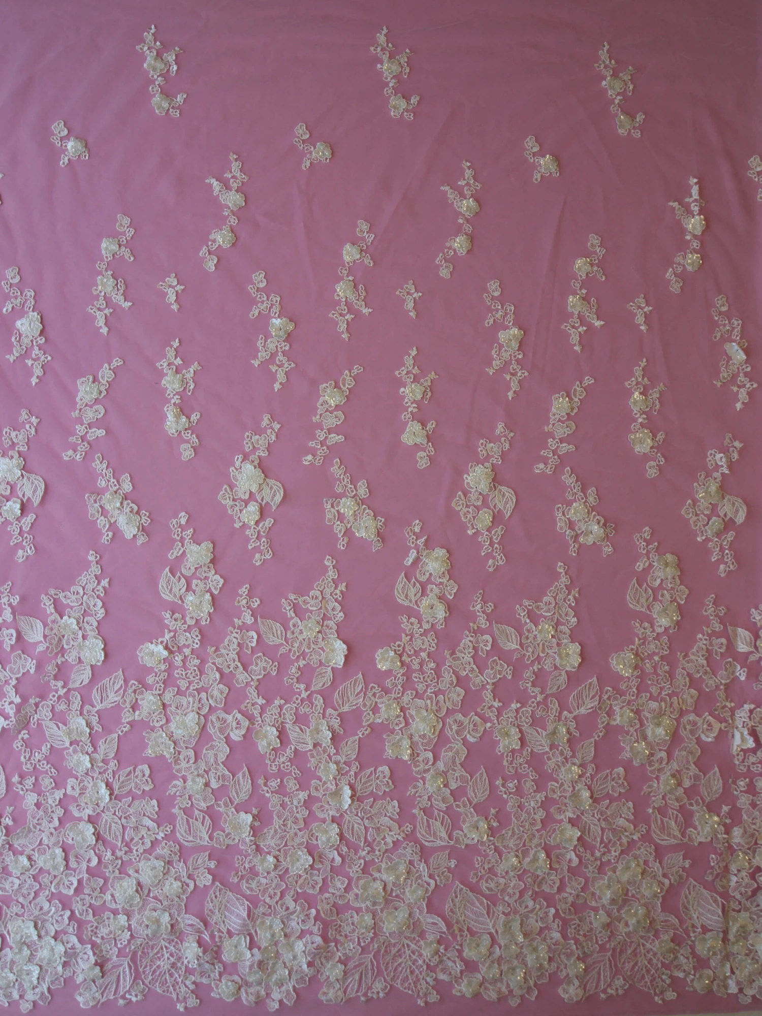 Hunter is a flamboyant and highly ornate ivory bridal lace with a pattern that graduates in density from one side to the other, that measures 132 cm (52″) wide.
