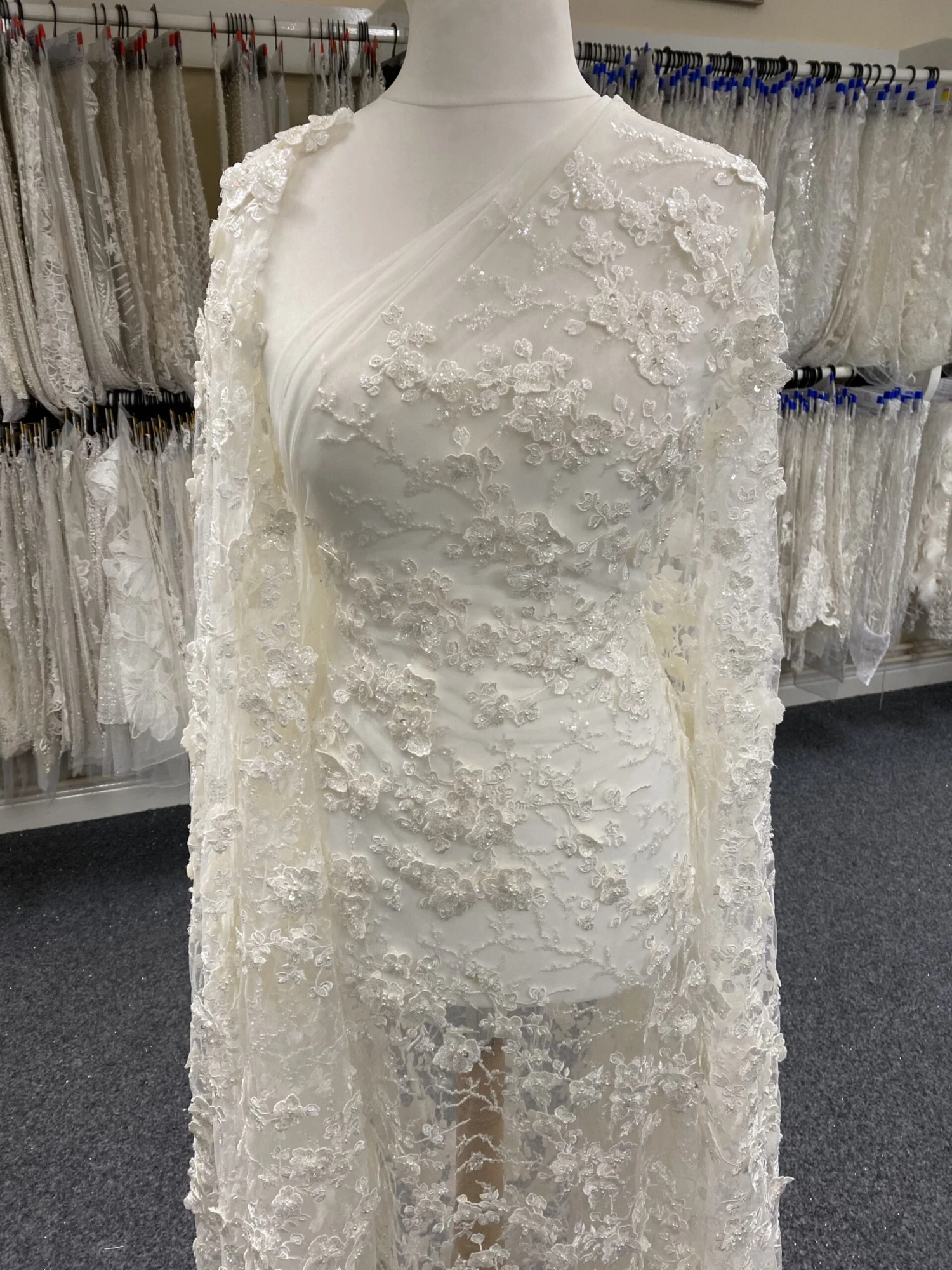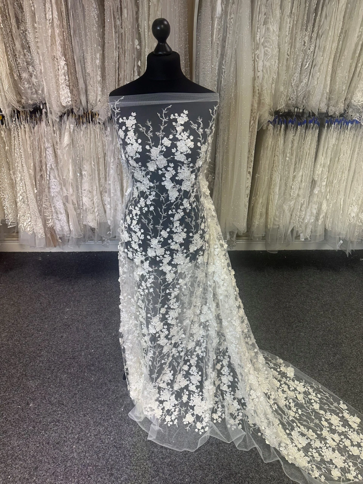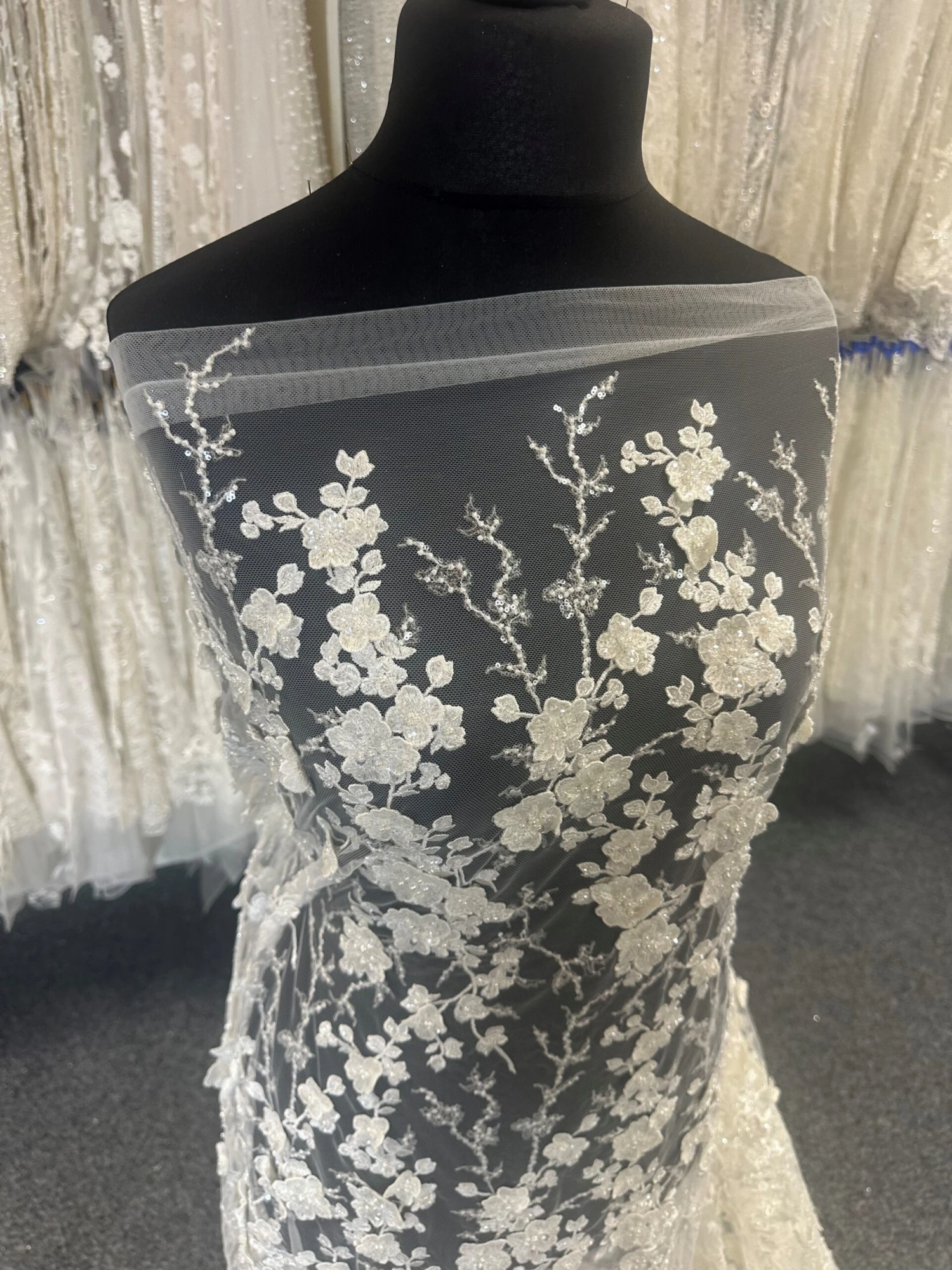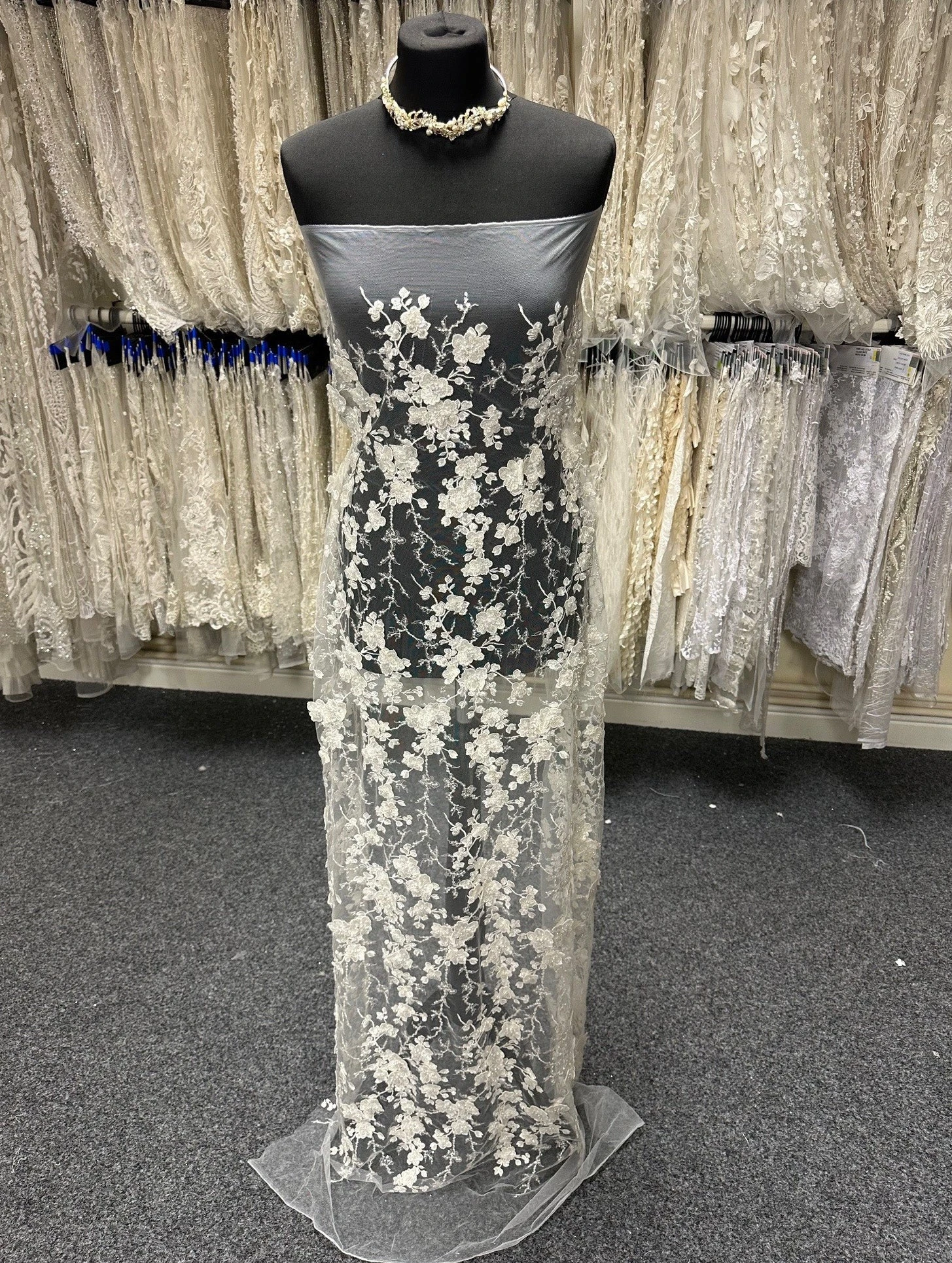 A highly glamorous ivory bridal lace with 3D flowers and exquisite beading, this measures 132 cm (52″) wide. Intricate three dimensional flowers cover the whole width of the tulle base and give this product a decadent charm. The flowers and the stems are embellished with tiny sequins making this a shimmering design.Â