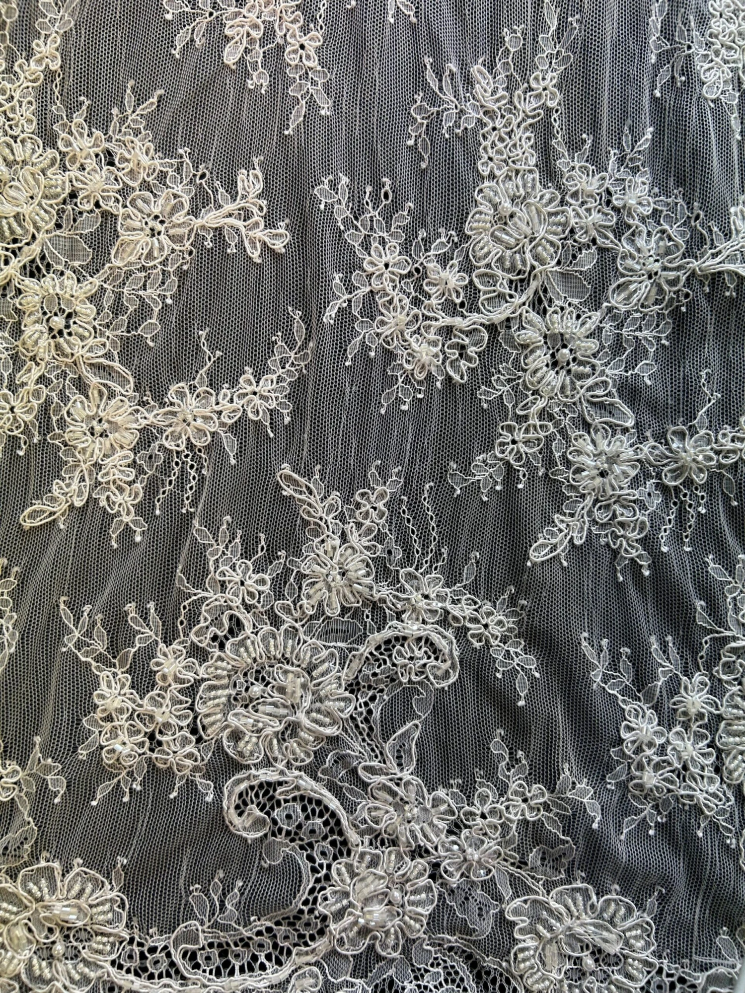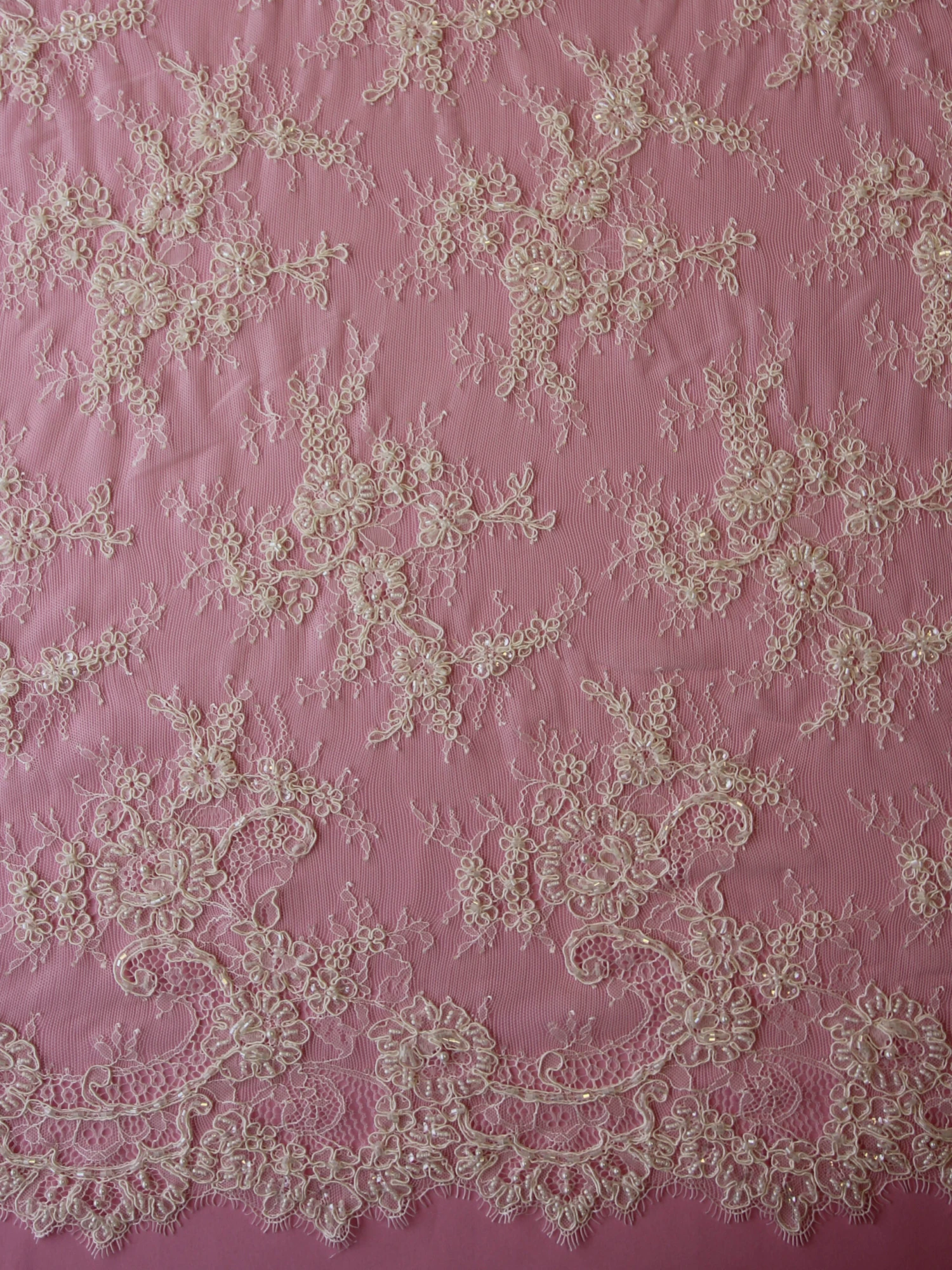 The background is a lightweight Raschel fabric, which has subsequently been hand embroidered to form floral bouquets. The petals ofluba lace the flowers have then been highlighted with a fine ivory cord and within the petals, there are transparent, colourless sequins, pearls and spherical beads. Both edges have a 7 mm (1/3″) fringe and the borders match. If you would like a trim that goes with this lace, look at Stacey or Wisconsin.