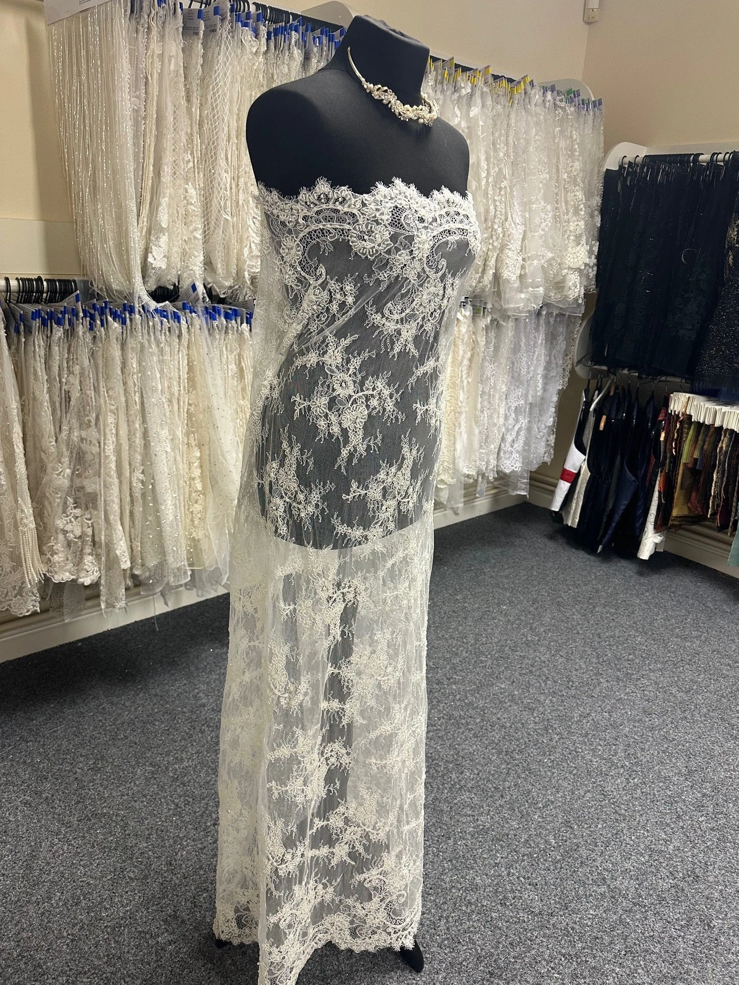 Carmel is an ivory bridal lace that measures approx 140 cm (55″) wide.