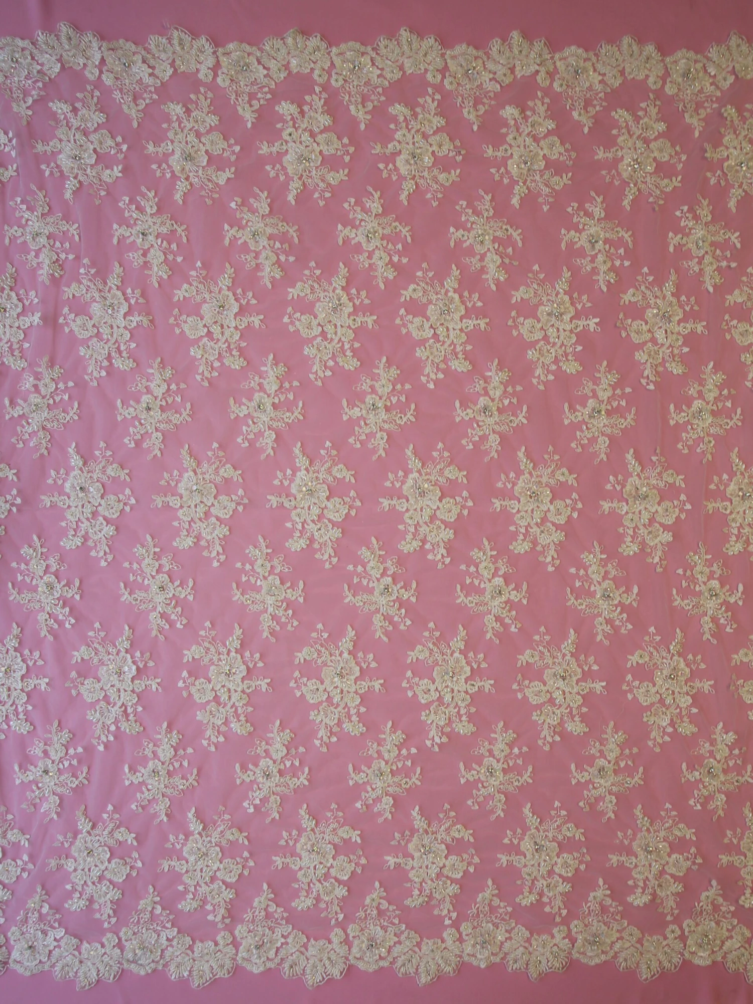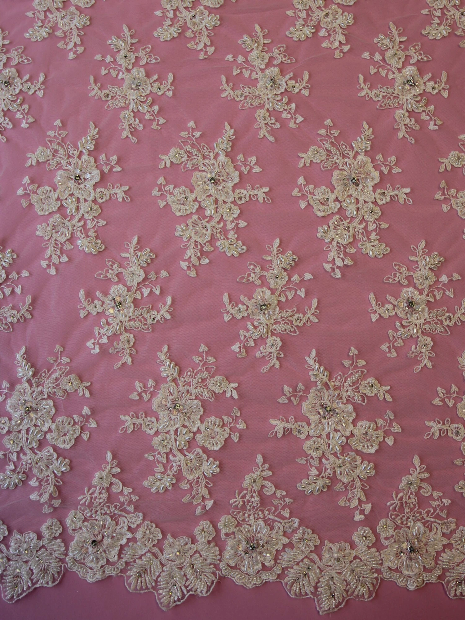 Chelsea is a splendid ivory lace that measures 132cm (52″) wide, that is heavily embellished with diamantes, beads and cording on top of embroidery thread. The floral motifs are pretty flowers with leaf and petal detail which have been corded to highlight the design.  The diamantes in the centre of the flowers are quite large and there is additional beading on the leaves and petals. The deep border of this design is particularly breathtaking. We also offer co-ordinating motifs and trim to match.