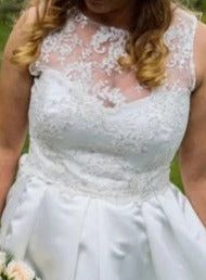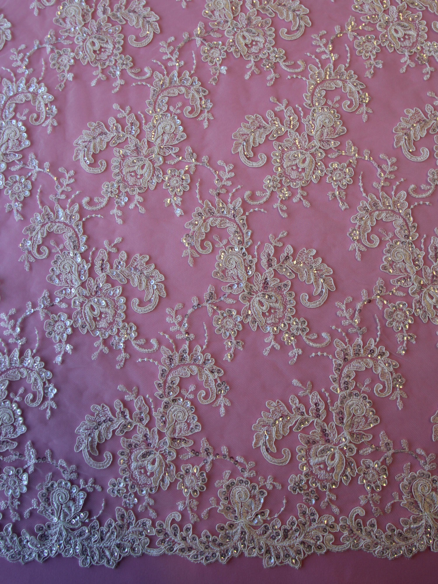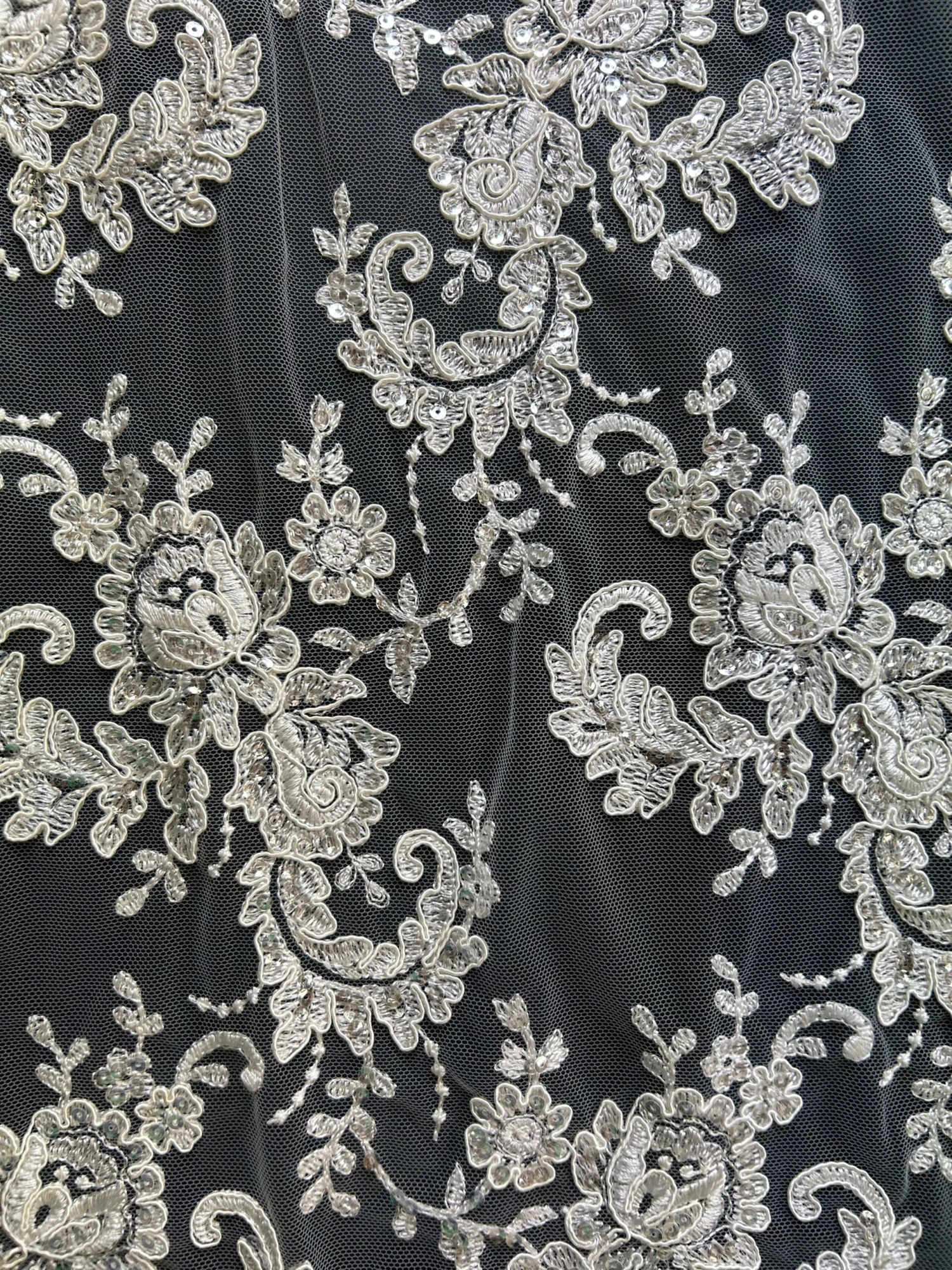 Both edges are scalloped and match one another. Our designer has decorated the rich ivory embroidery and cording of the floral pattern with lustrous sequins throughout. If you would like a trim to complement this lace, it’s worth looking at Tennessee.