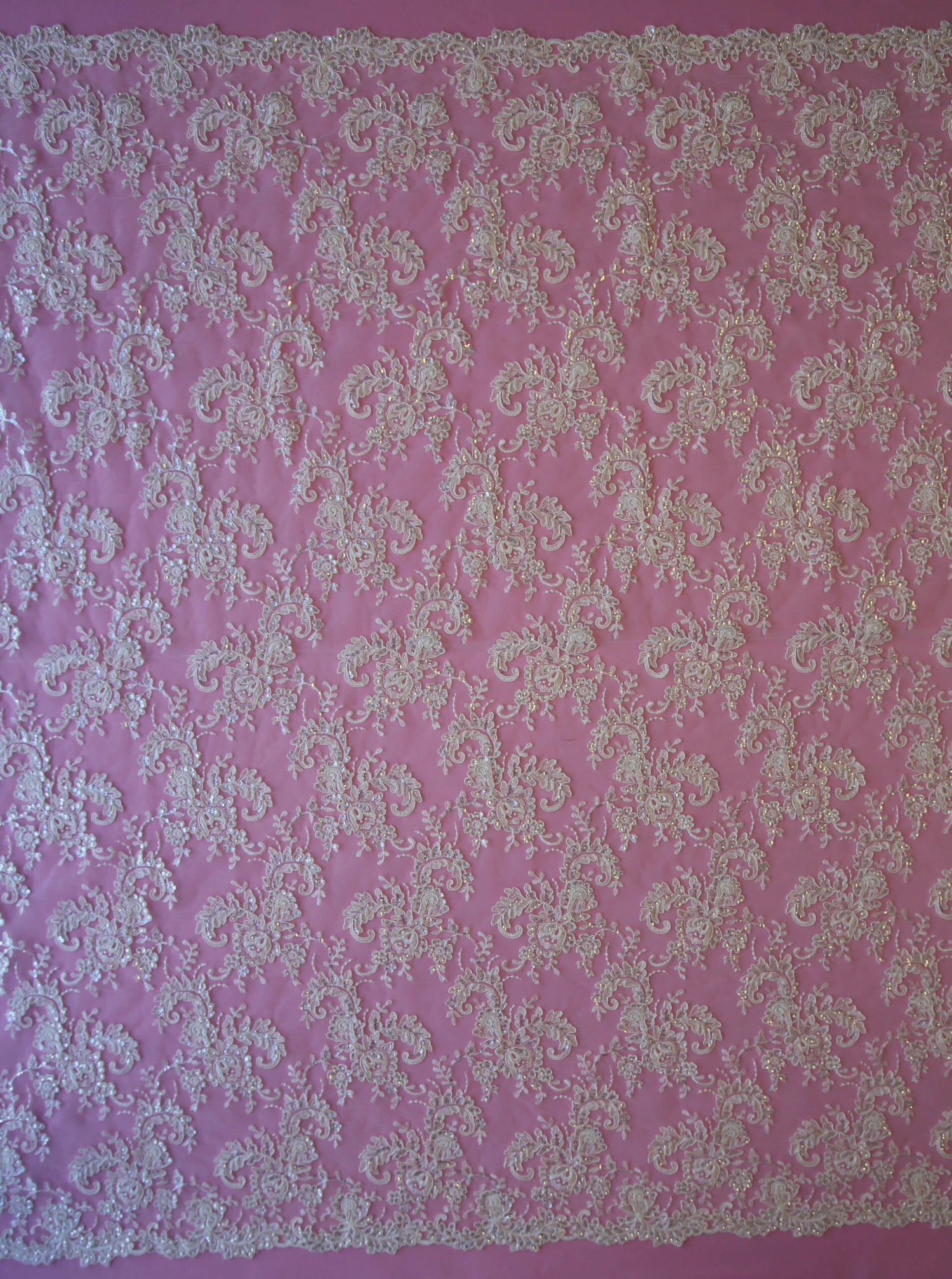 Anoushka is a highly embellished ivory wedding lace that measures 132 cm (52″) wide.
