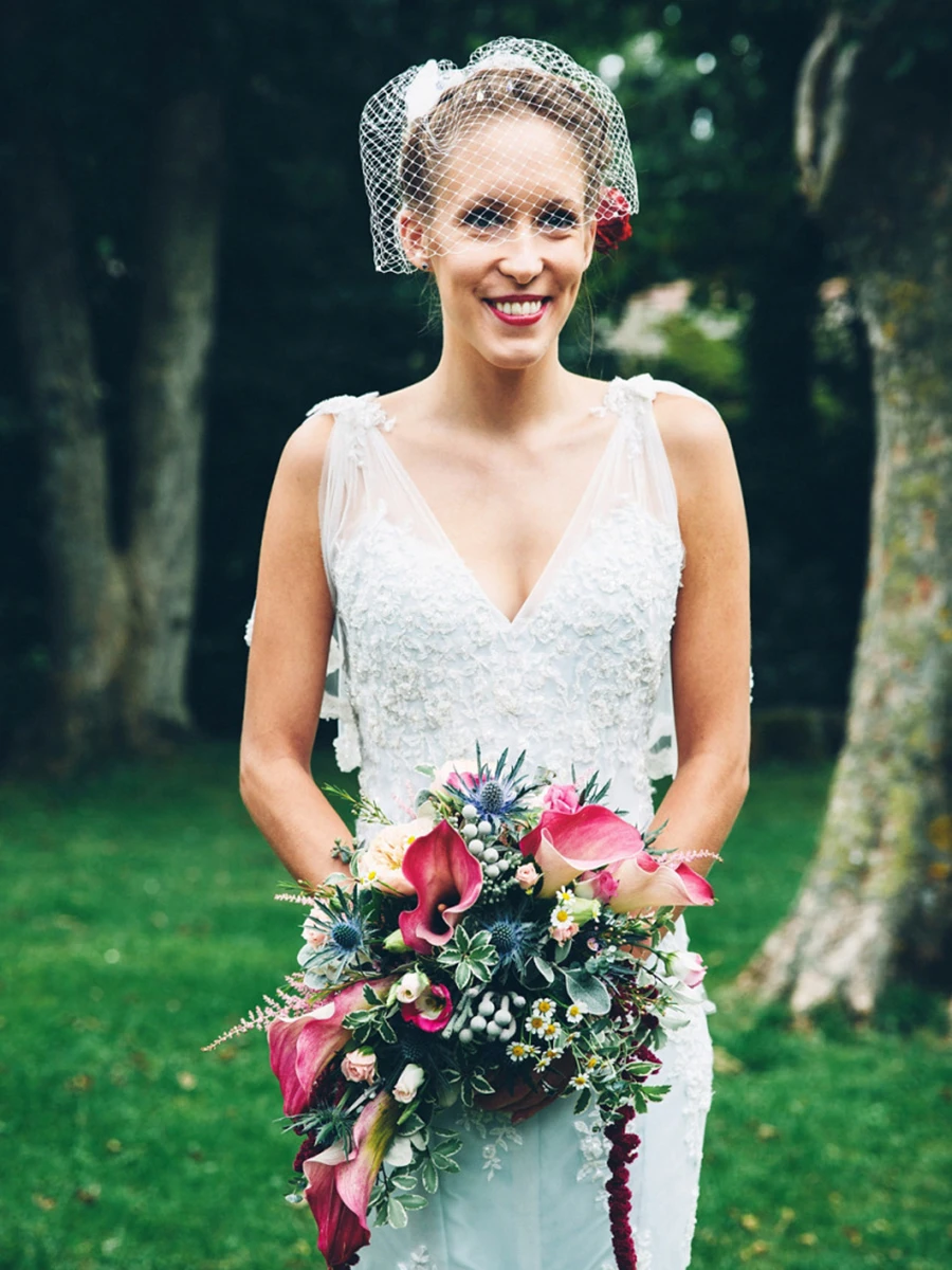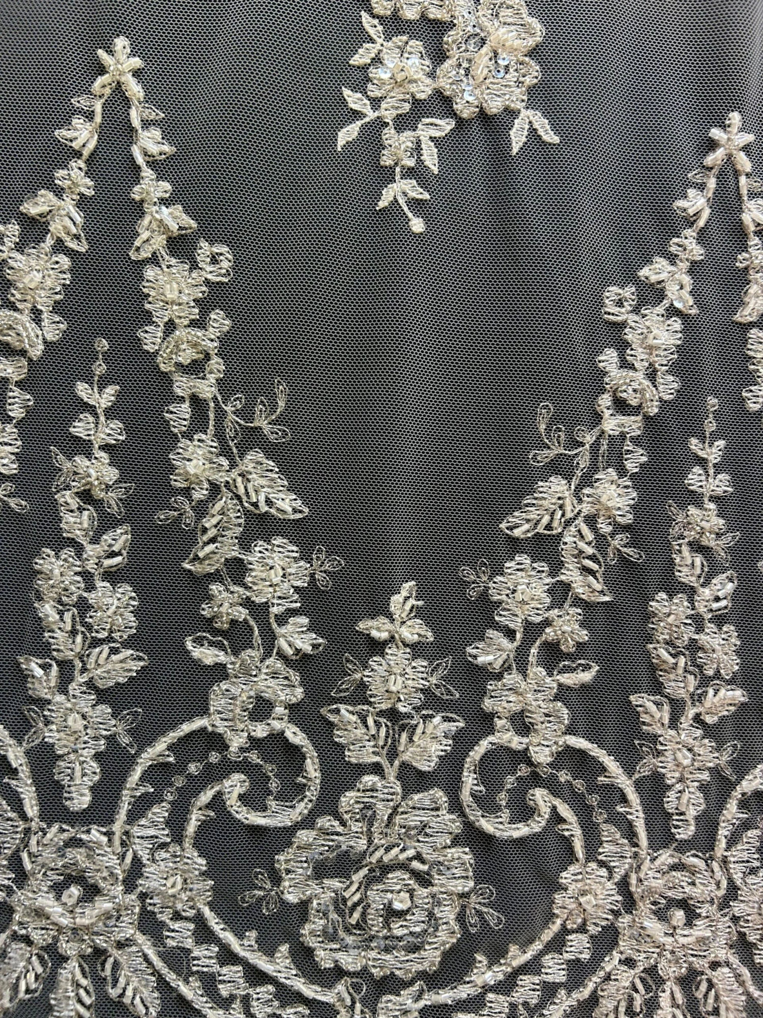 Lauren has a double scalloped border, one of which is a simple 3 cm (1.2″) edging with beads and sequins on an embroidered ground. In contrast, the other border is 35 cm (14″) in depth, featuring floral scrolls , which rise to give a pyramid effect. The border features hand sewn sequins and beads on a richly embroidered ground, edged with silver filigree thread.