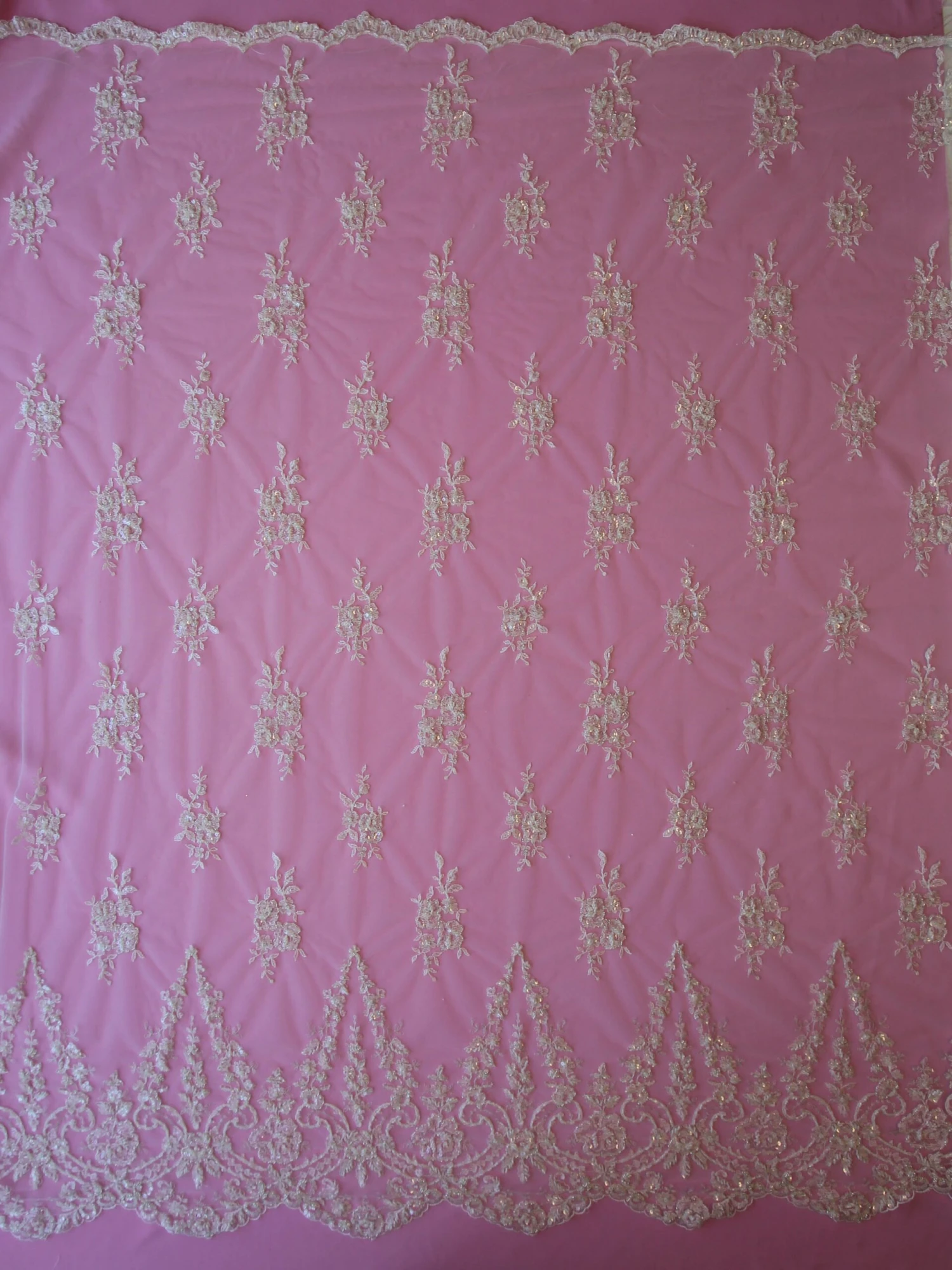 A heavily beaded border lace on a fine tulle ground. A small single flower and a double flower motif are enriched with beads and sequins on an embroidered background, which is edged with a silver filigree thread.