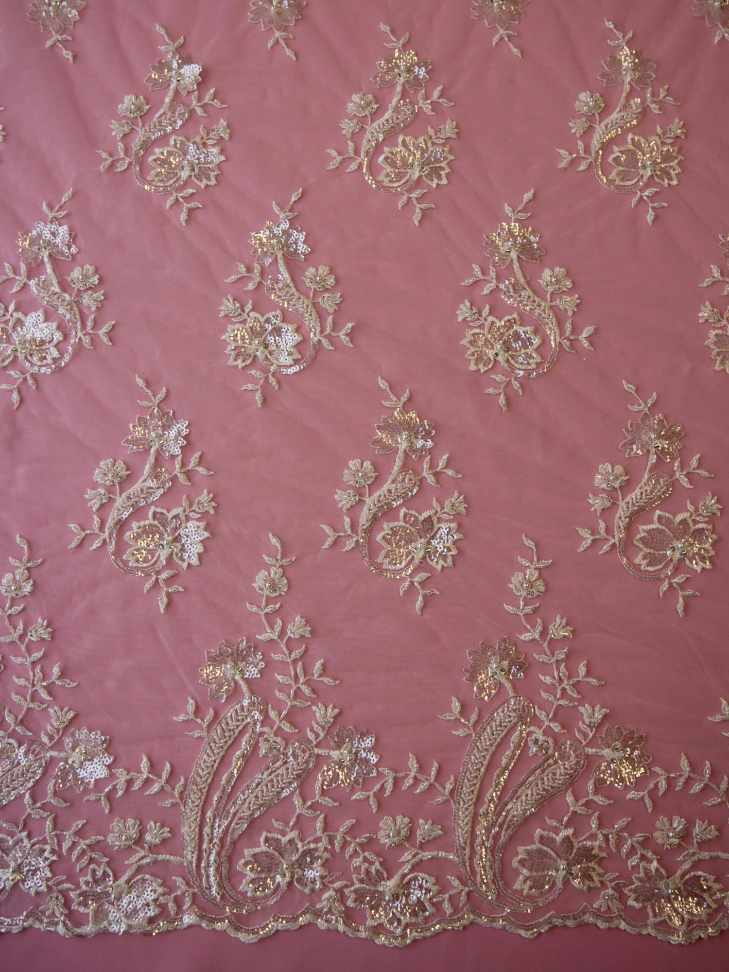 Both edges are scalloped and match one another. The borders extend into the design by 27 cm (11″)