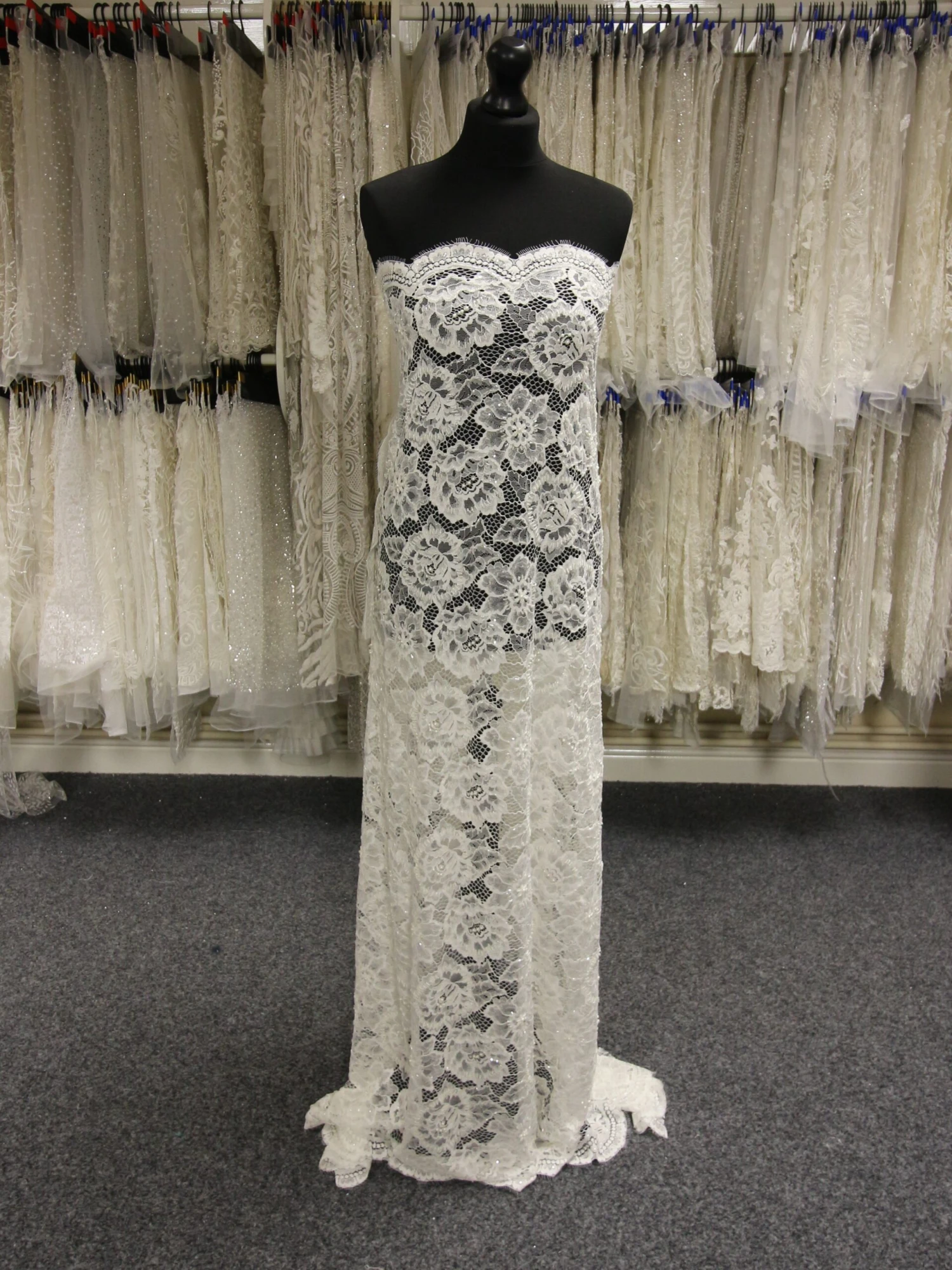 The design features a dense pattern of 3 different flowers that measure 10-12 cm (4-5″) across. The detail of the flowers is delightfully brought to life by clever use of embroidery. A variety of beads, sequins and pearls make this a glamorous lace.