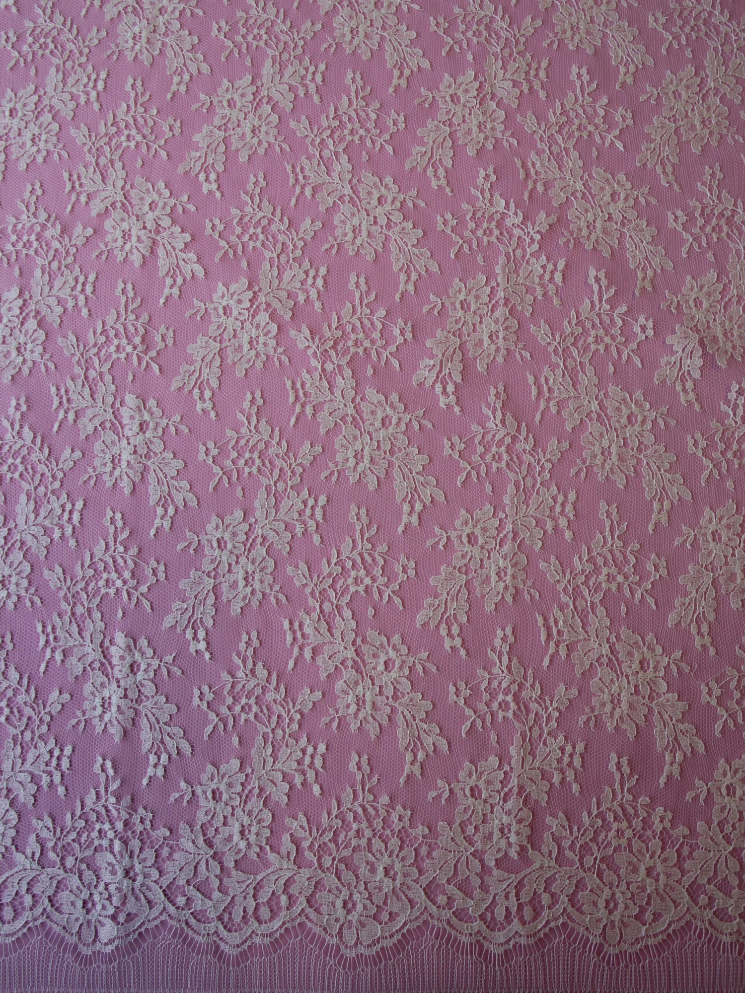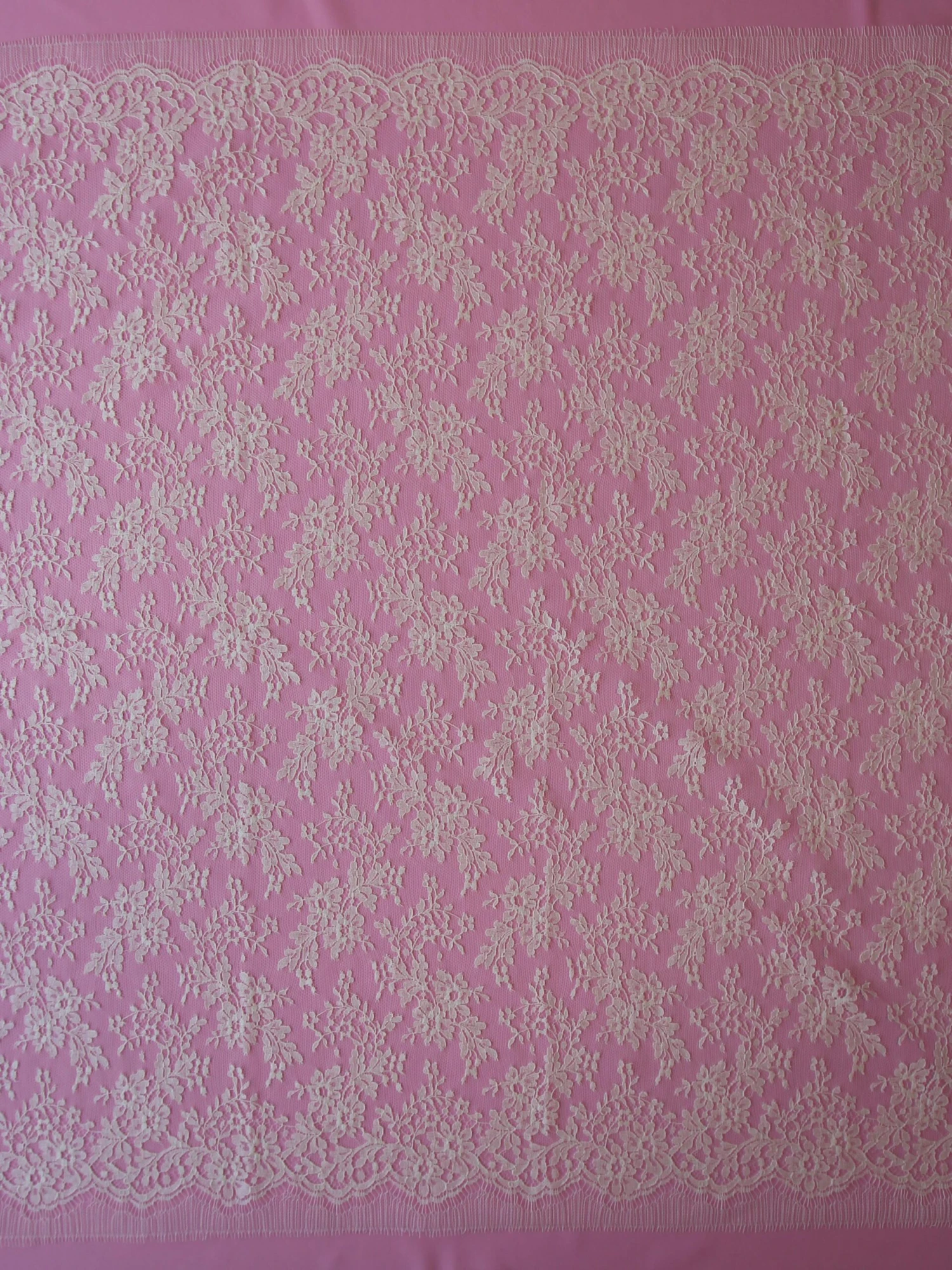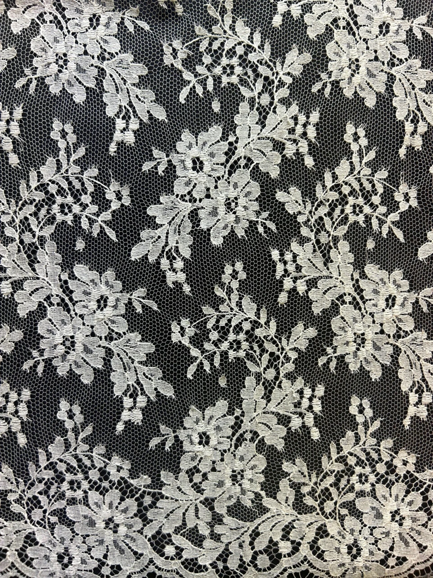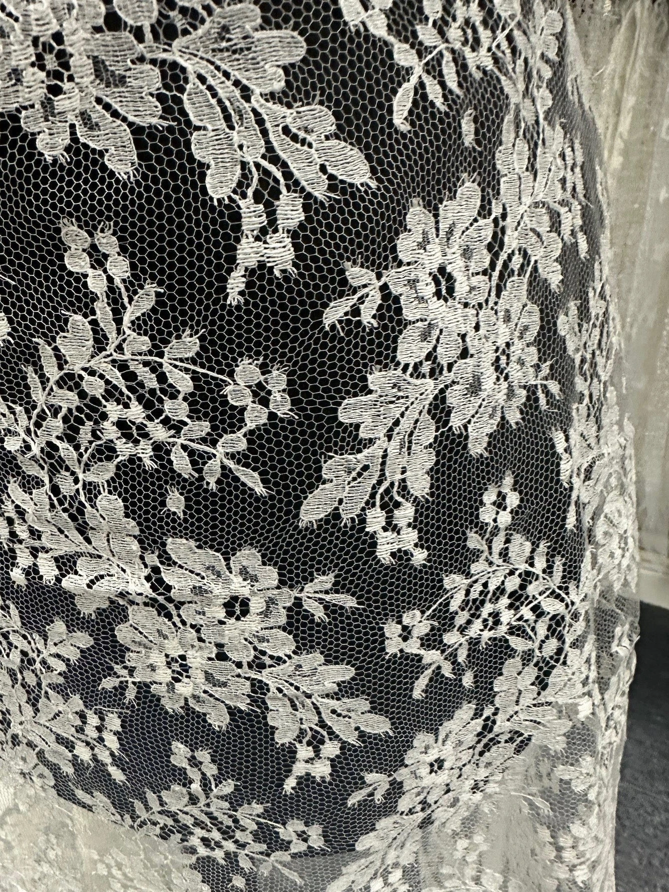 Beautiful and lightweight this is an appealing classic Chantilly lace with matching edges. The design is a traditional floral one which gives this lace a hint of vintage as the design is relatively dense across the full body of the lace. This suits brides who prefer not to have ‘gaps’ in the lace and also for small sections (bodice and sleeves) and for flower girl dresses. The colour is a rich ivory tone which adds to its appeal as a vintage lace. This lace measures 90 cm (35.5″) wide and is available from stock. Please add a sample to your cart to appreciate this delicate and elegant lace for yourself.