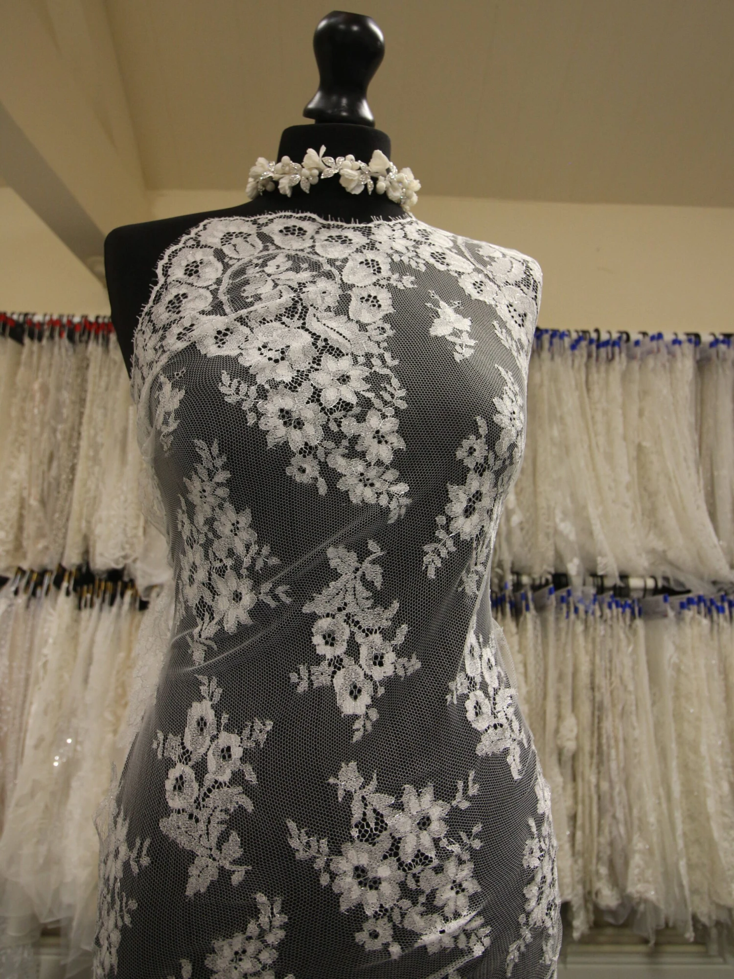Wendy is an ivory lace that measures 109 cm (43″) wide and features a delicate shading through to form a very feminine floral effect. There is a soft subtle silver thread that runs through the motifs in the lace.