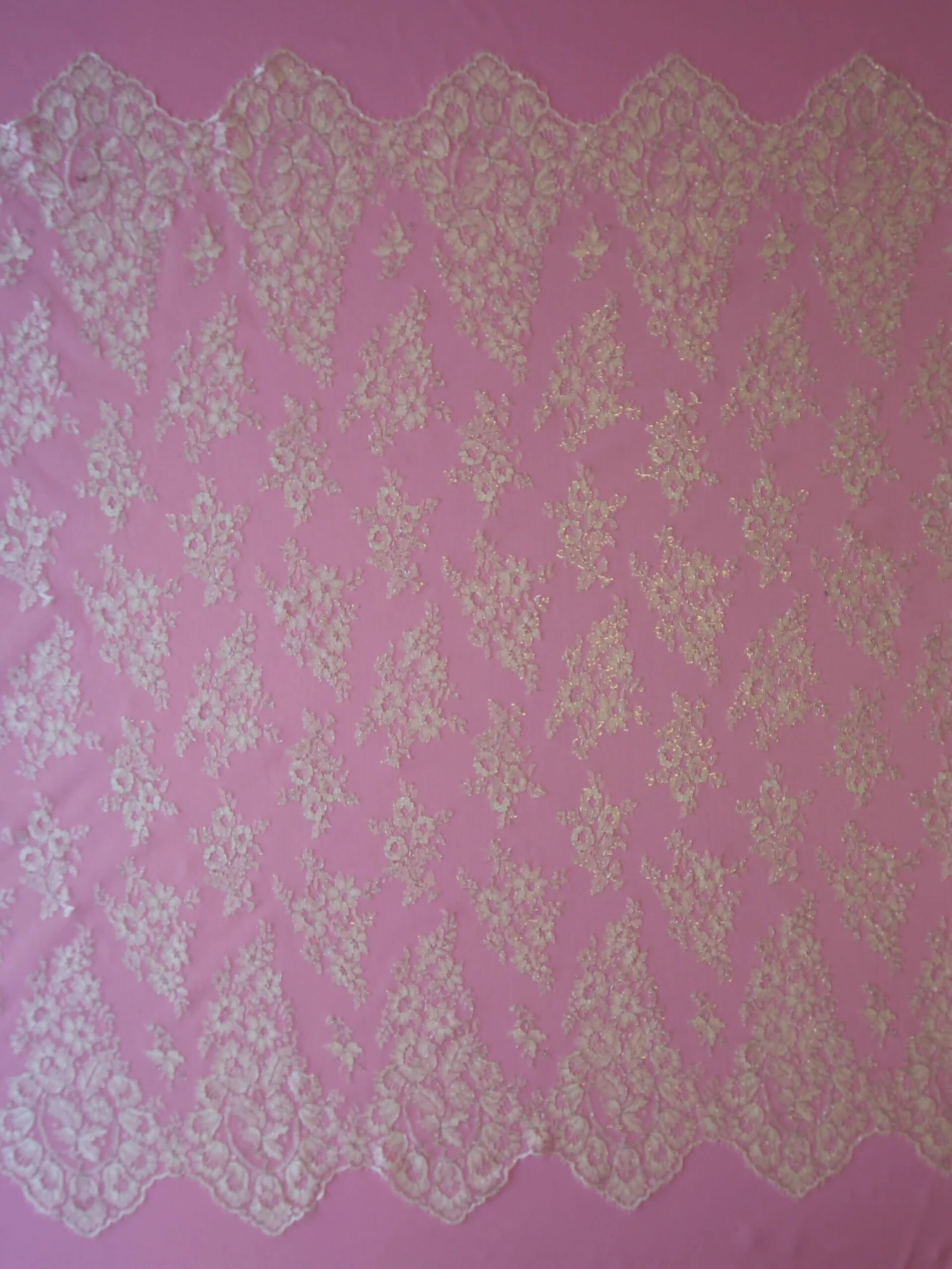 Both borders are scalloped and match with a small fringe on both sides. The scallops are quite bold repeating on 19 cm (8″).
