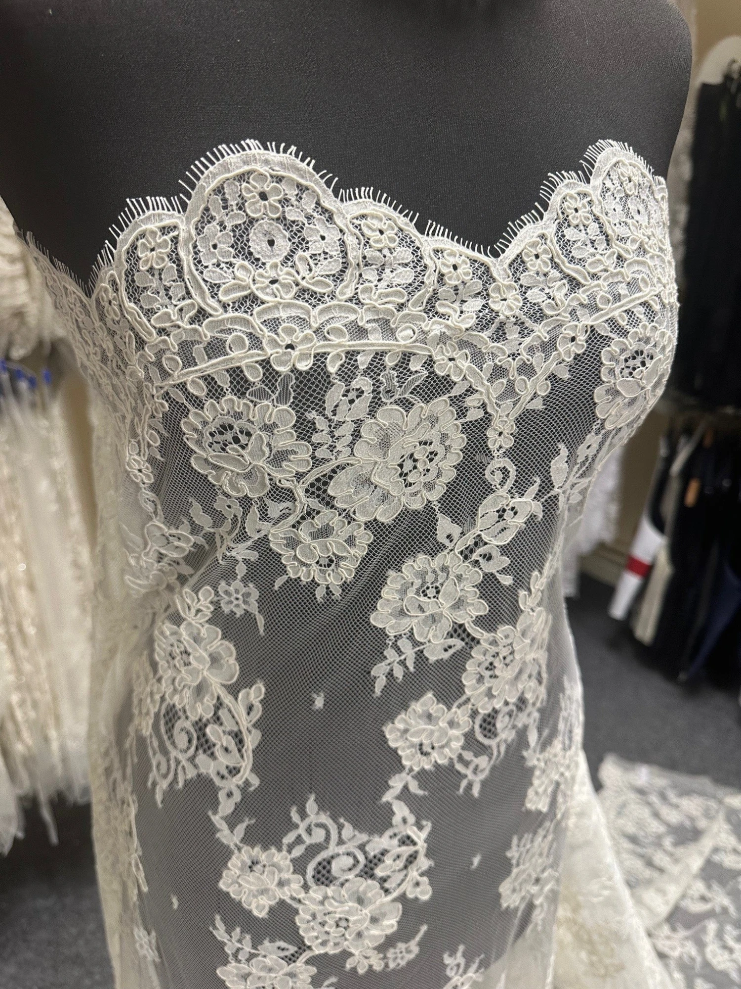 Amelia is an elegant corded bridal lace with a classic floral design. The 3 flowers which are central in the bouquet motif are delicately corded, which defines the outline of the flowers.