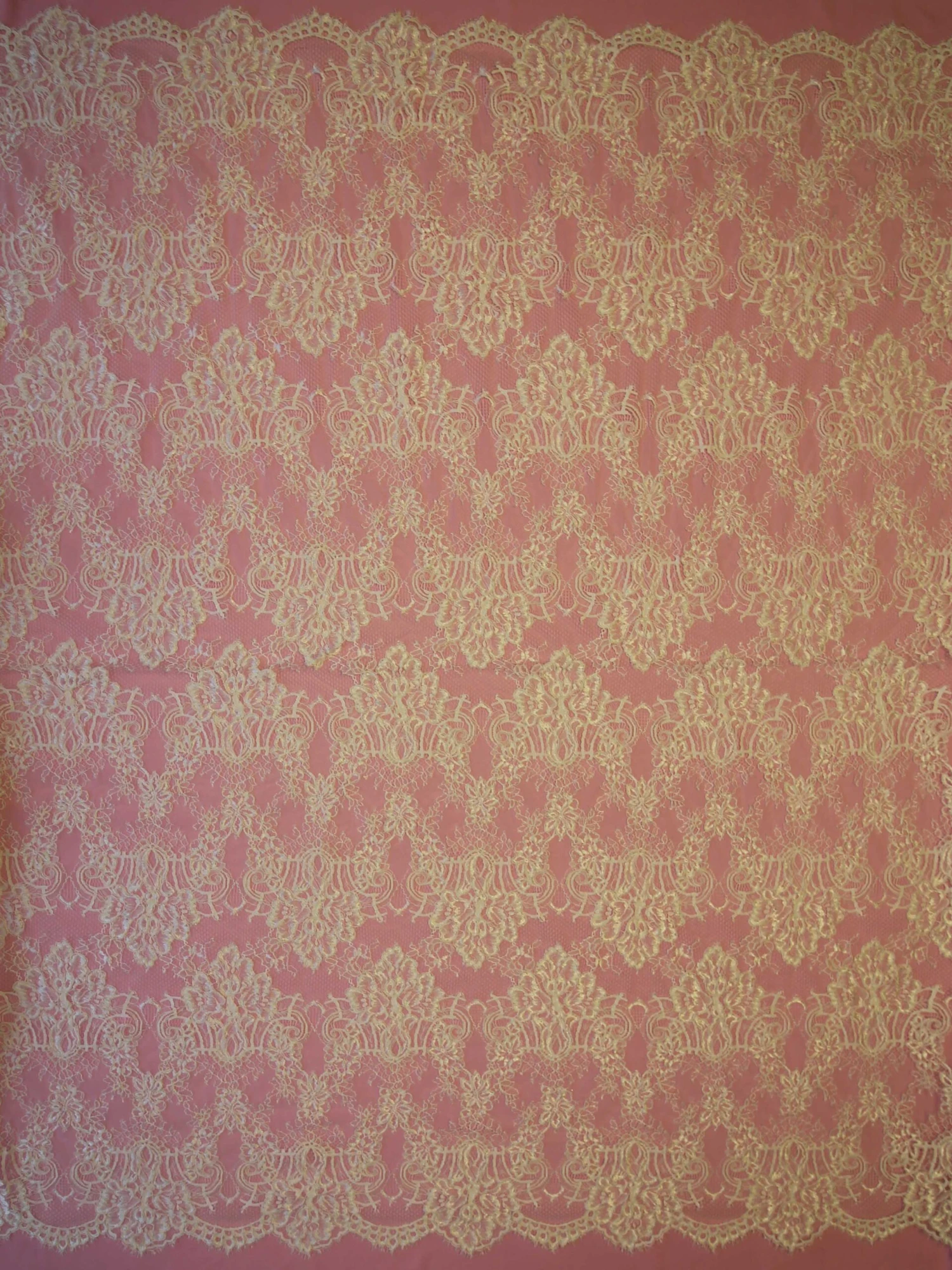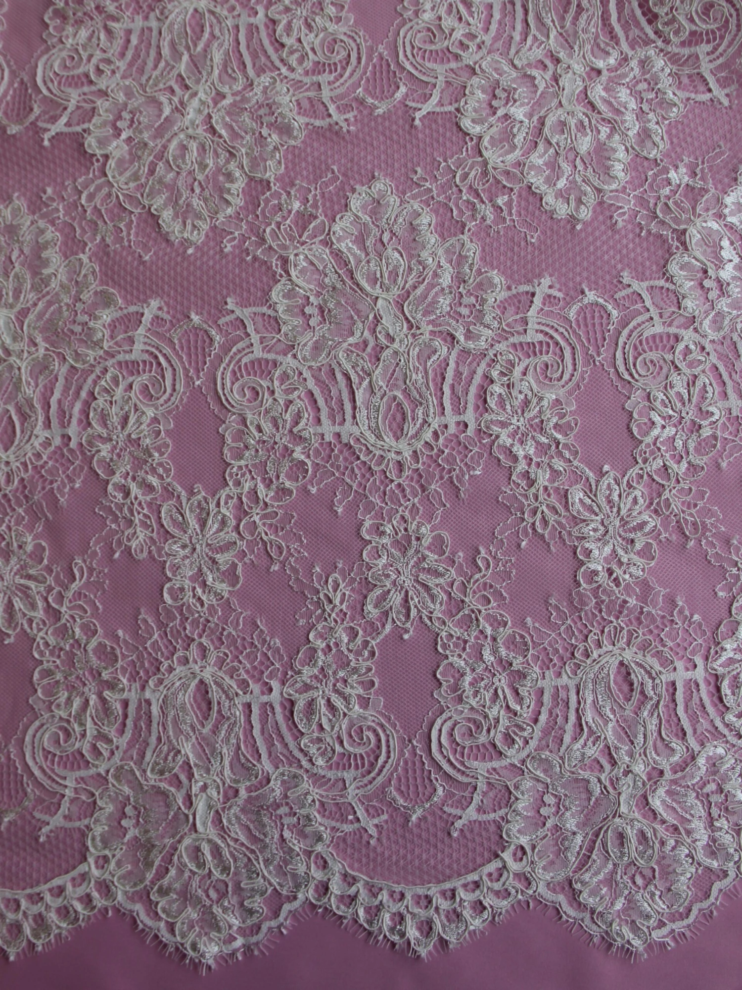 Karen is a glamorous ivory wedding lace, measuring 142 cm (56″) wide. Our designer has skillfully used a variety of different techniques to tastefully embellish this lace to eye catching effect. Both borders are scalloped and fringed and match one another. The piece de resistance is a delicate ivory cording which follows the contours of the pattern giving it some great depth and 3 dimensionality. The background used a variety of different weaves and embroidery is used at various densities to create different textures.