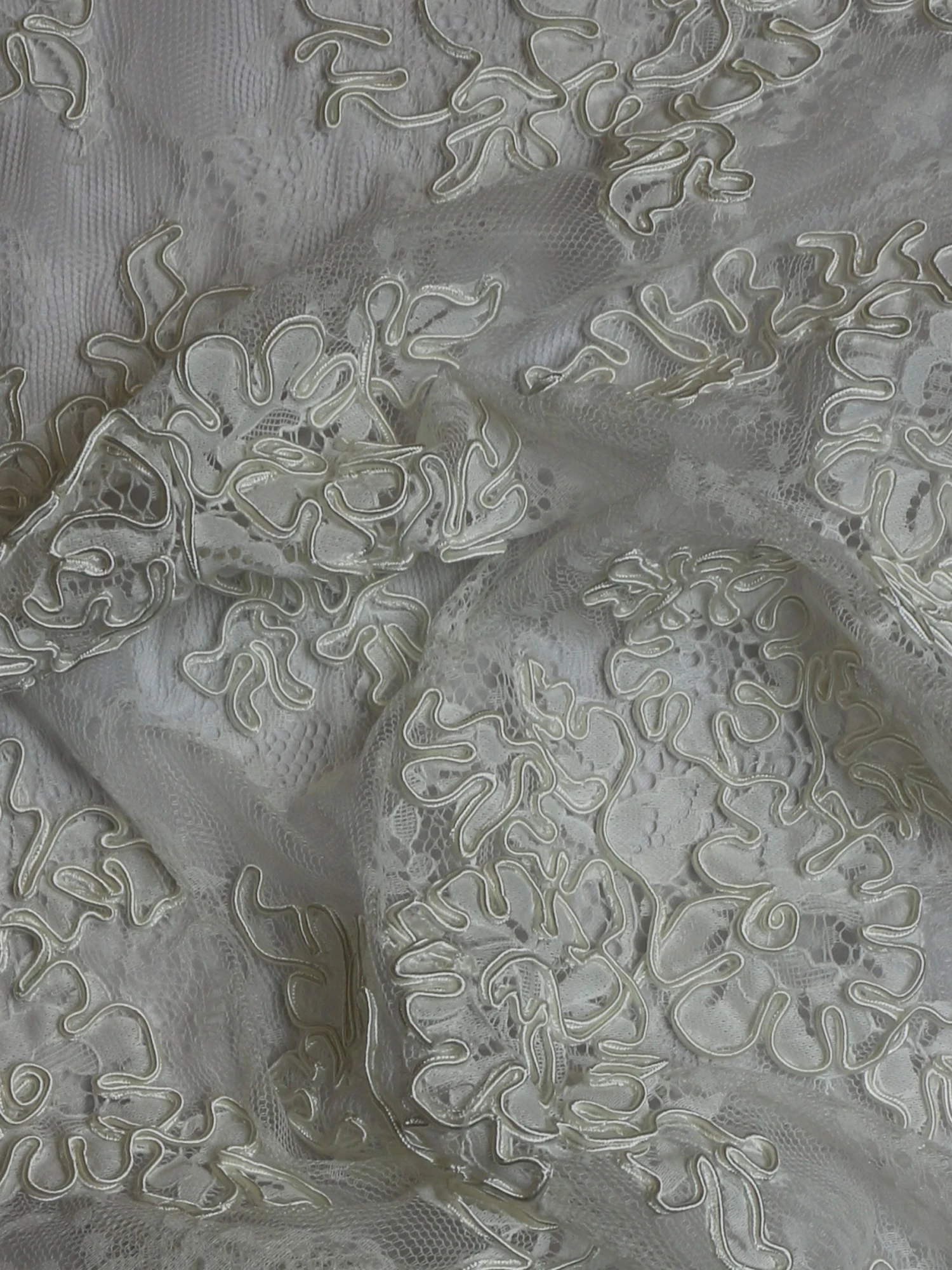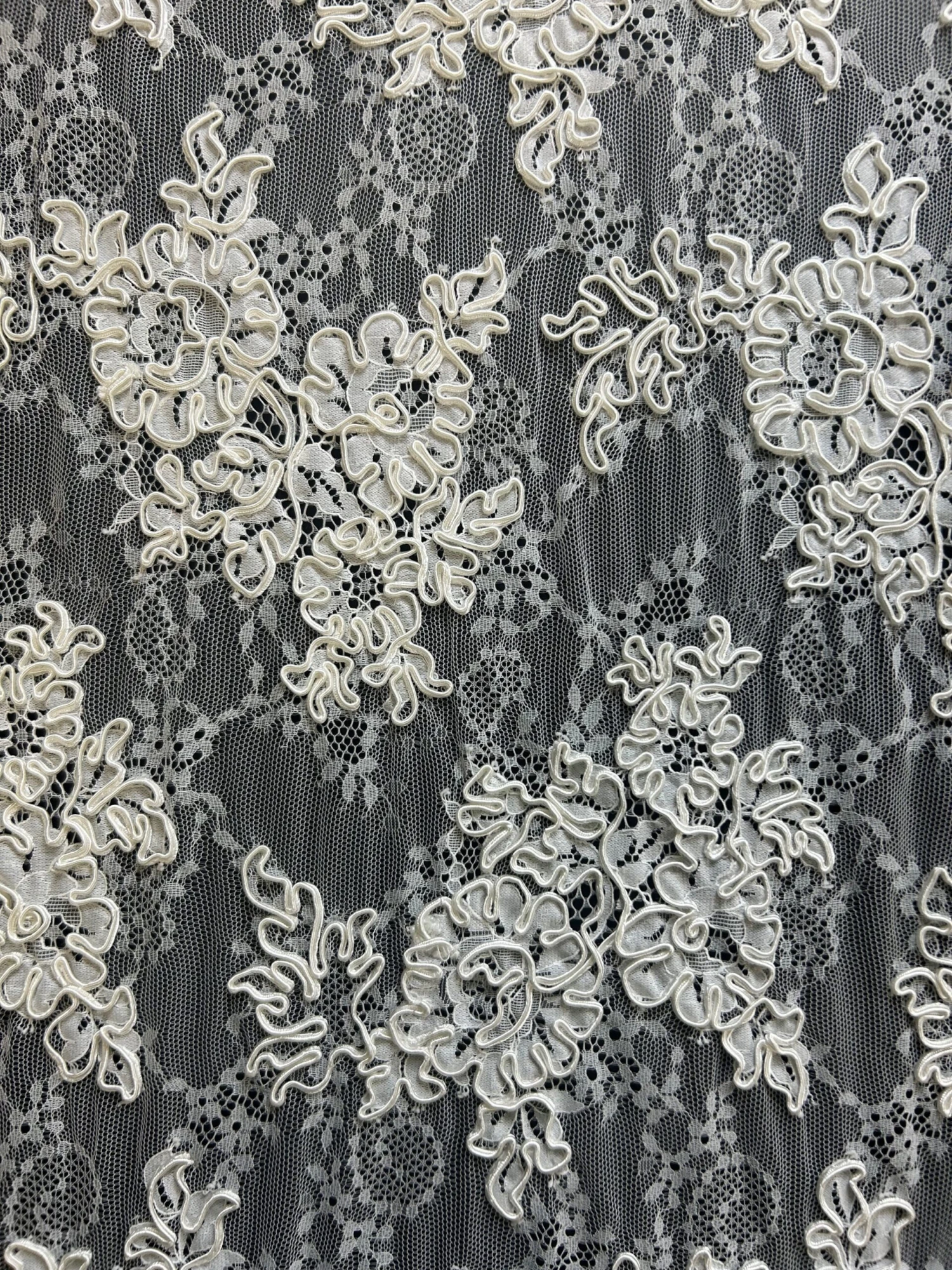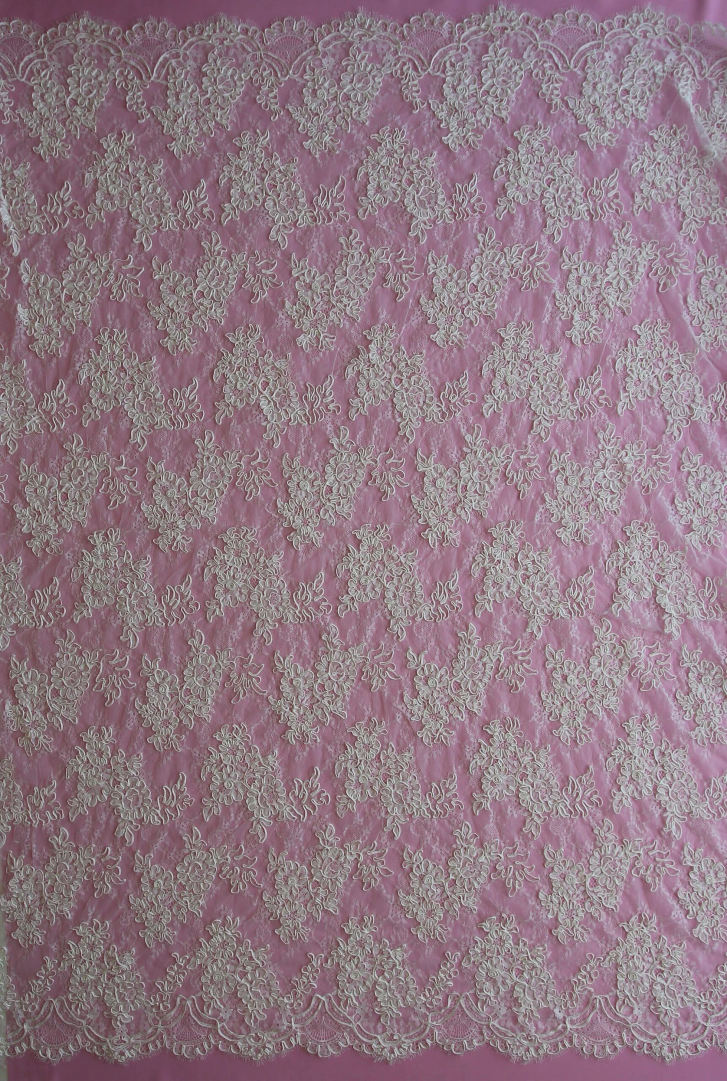 A flamboyant and heavily corded lace, this measures 137 cm (54″) wide.