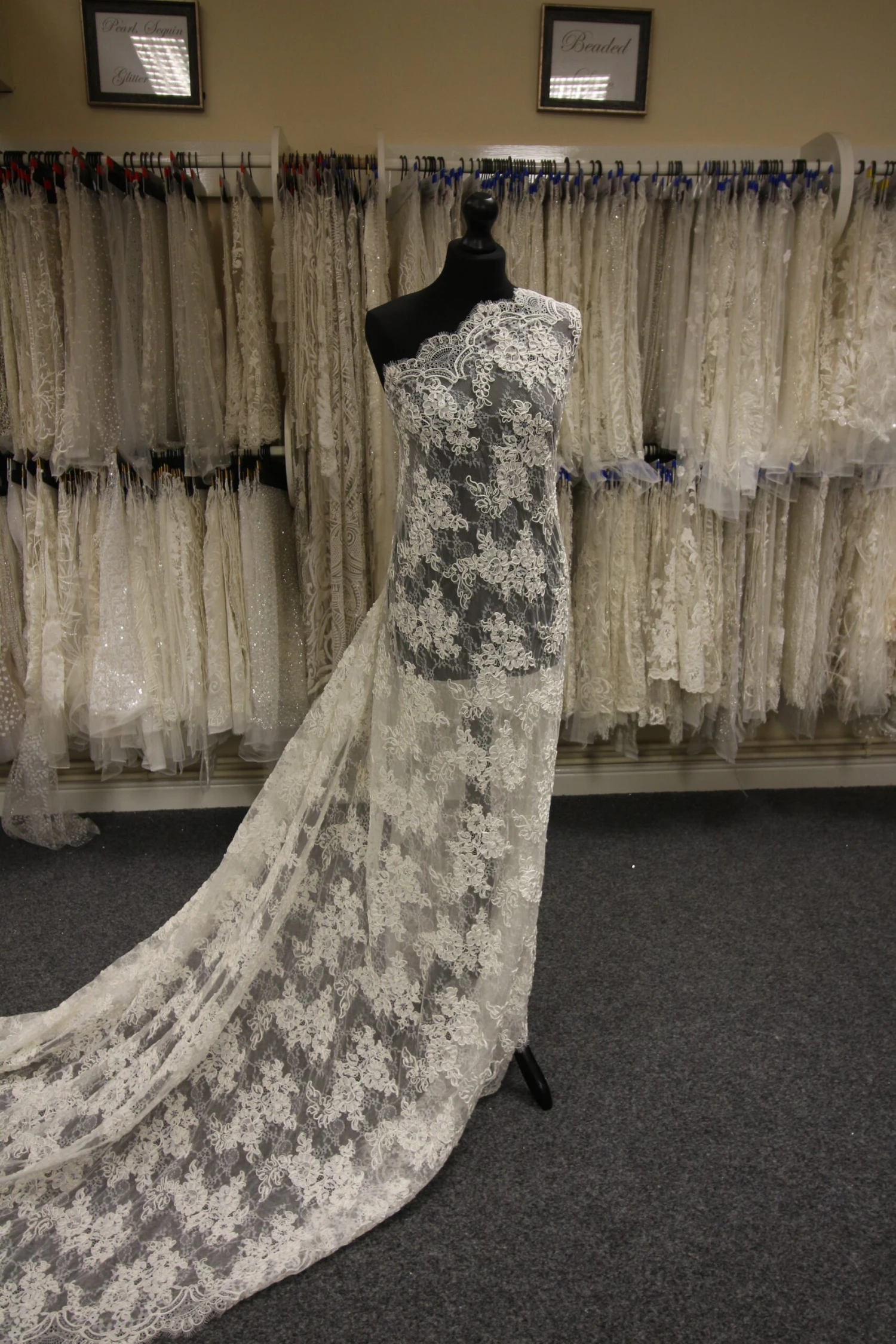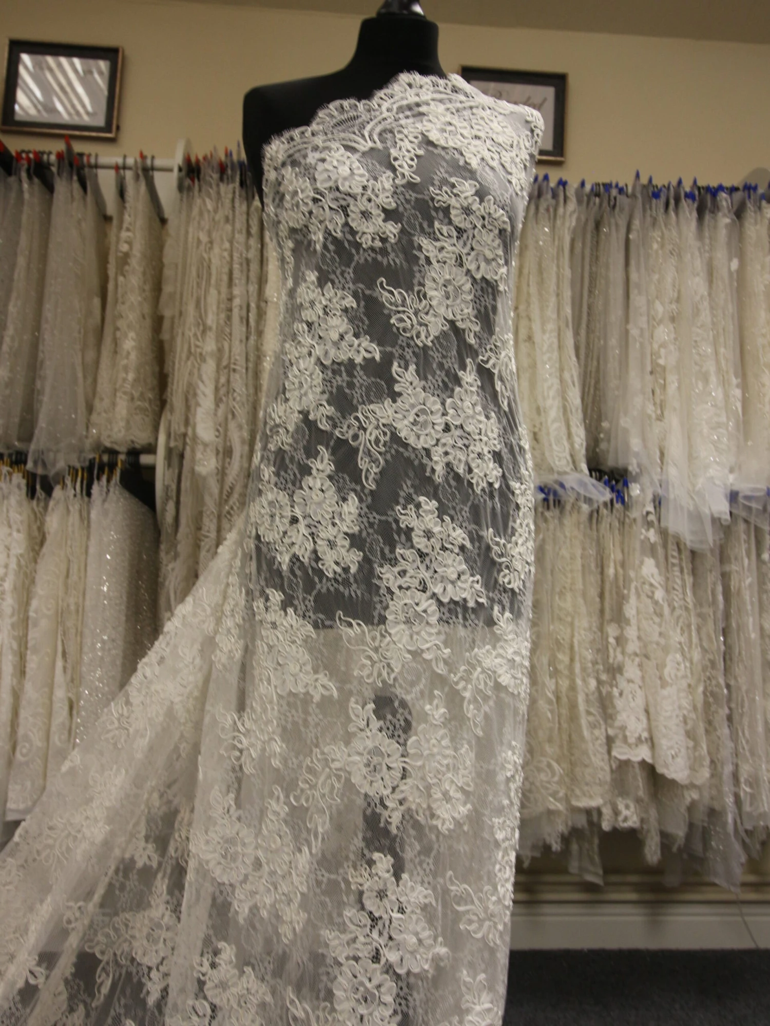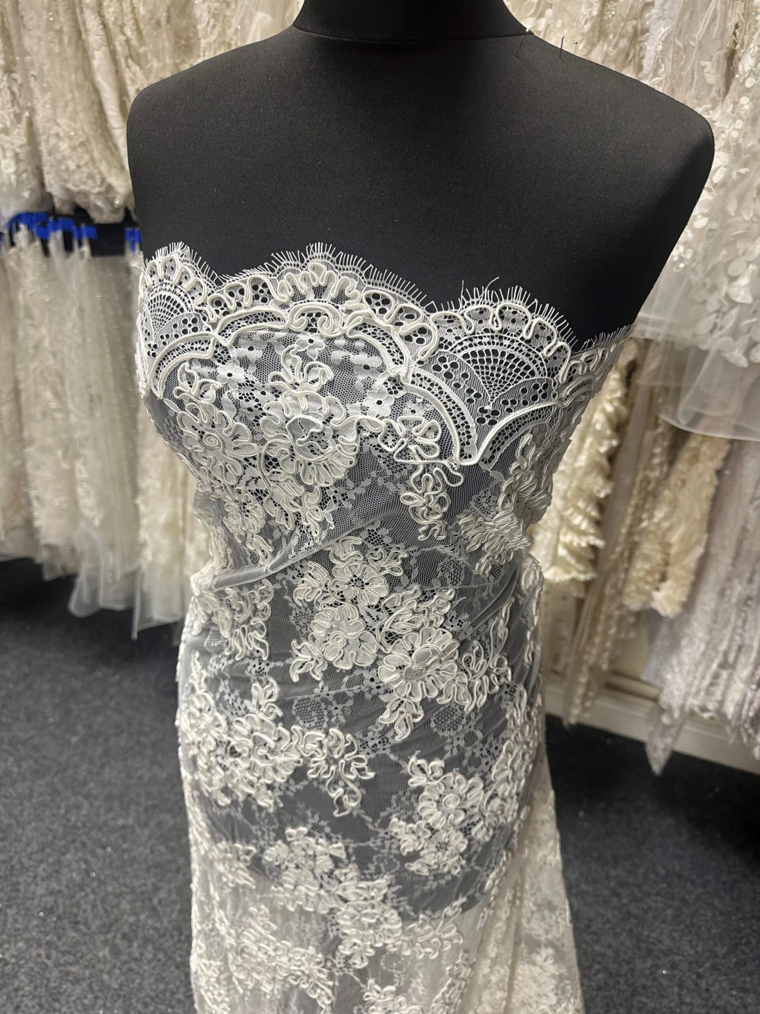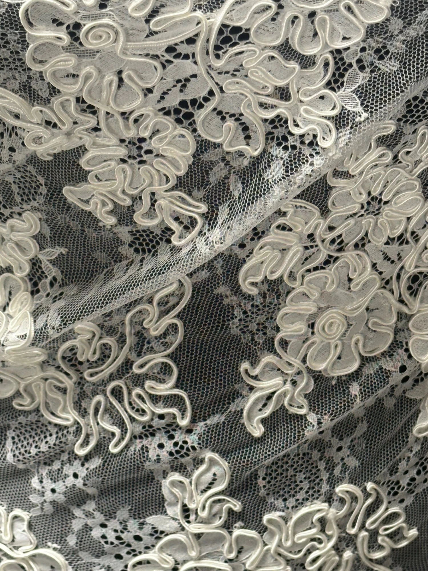 A flamboyant and heavily corded lace, this measures 137 cm (54″) wide.