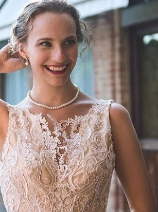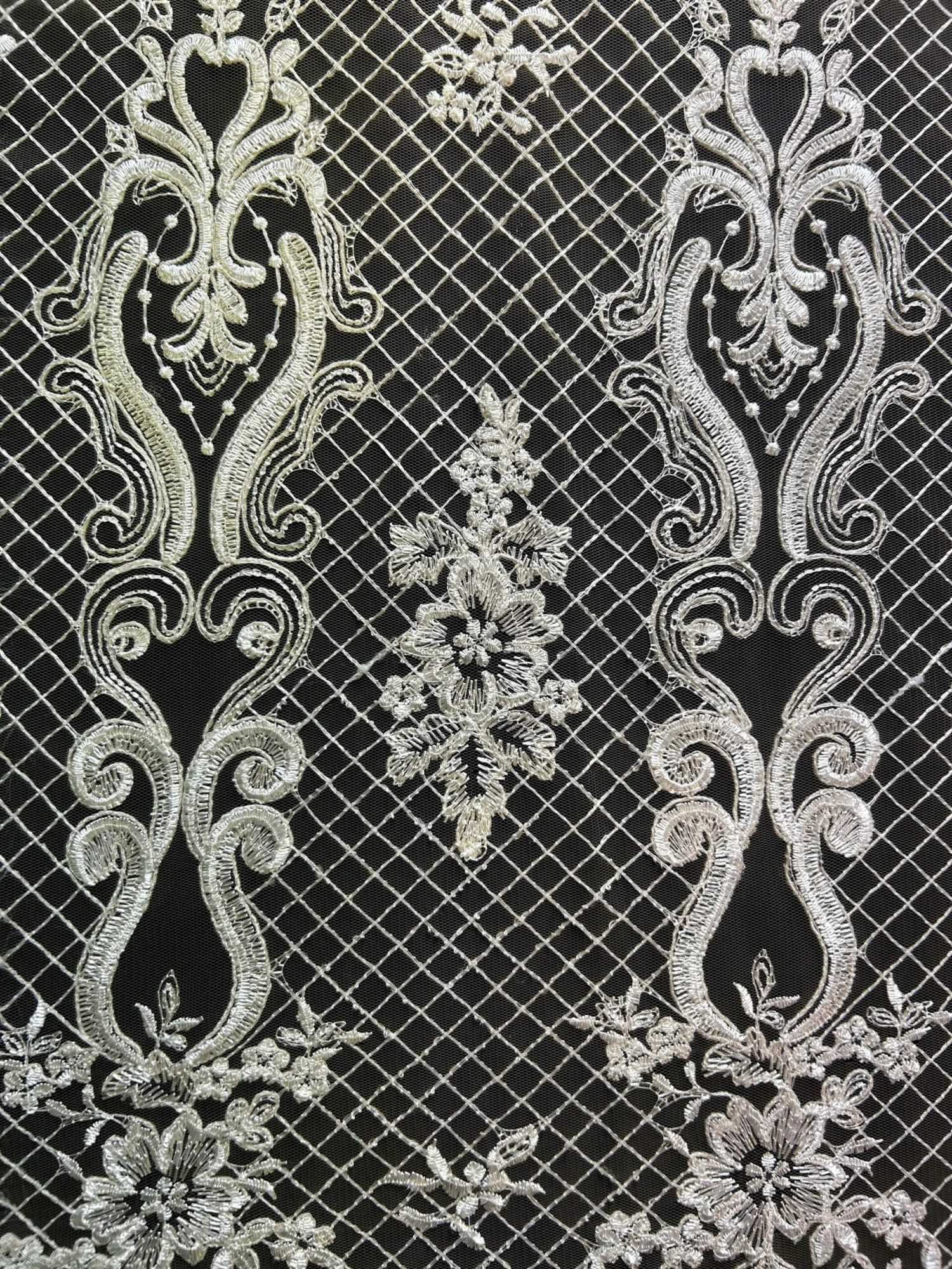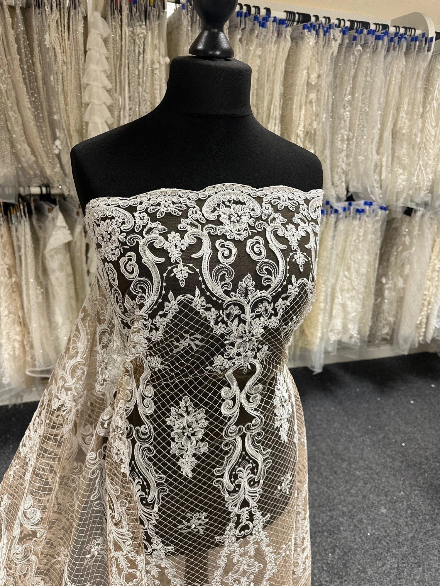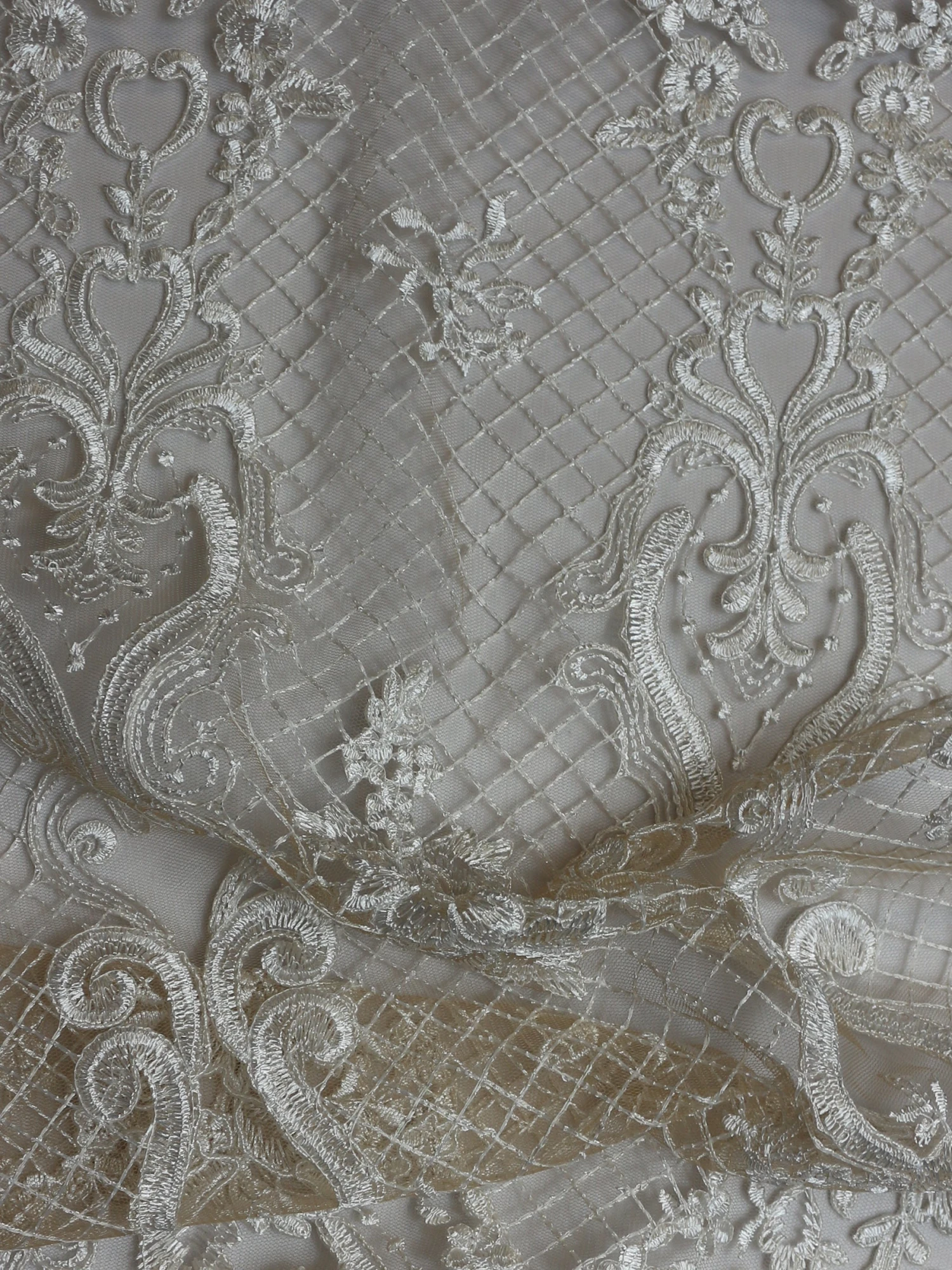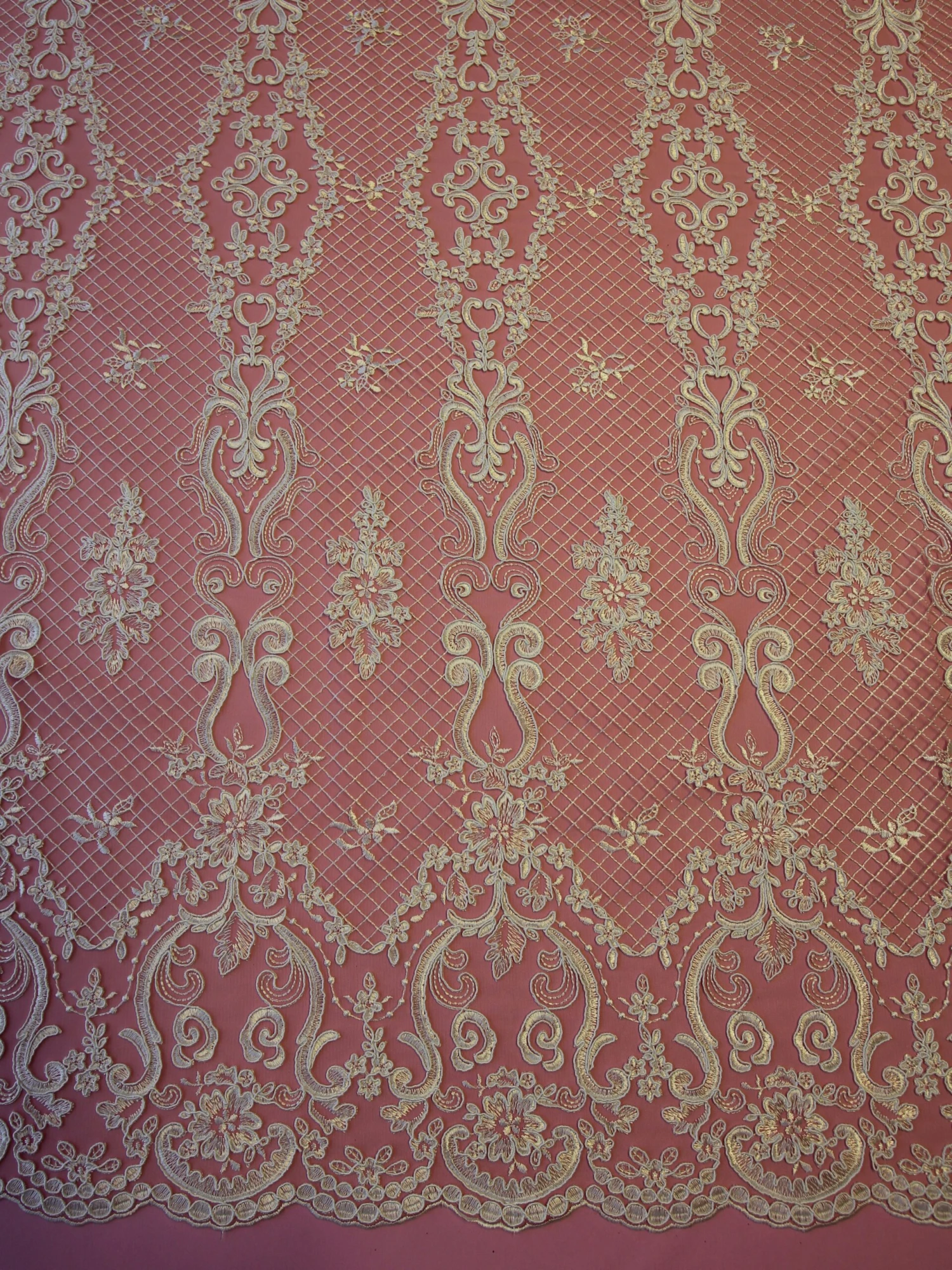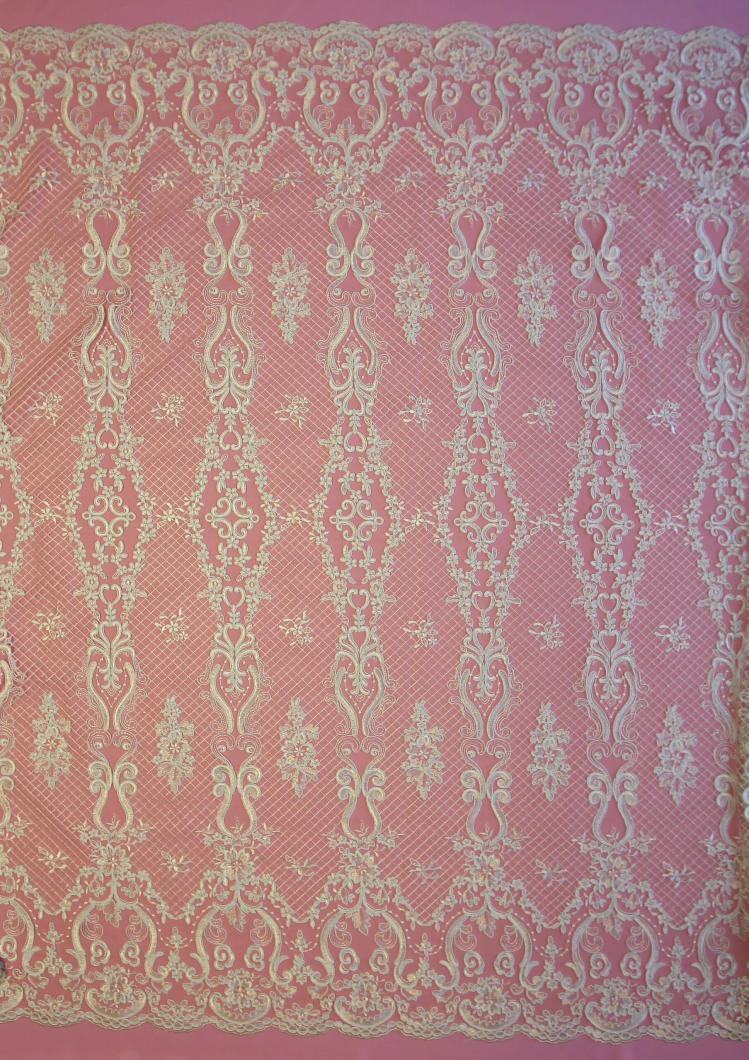 The ivory embroidery and light cording feature on a Champagne/Nude tulle base. This symmetrical lace design measures 132 cms (52″) wide.