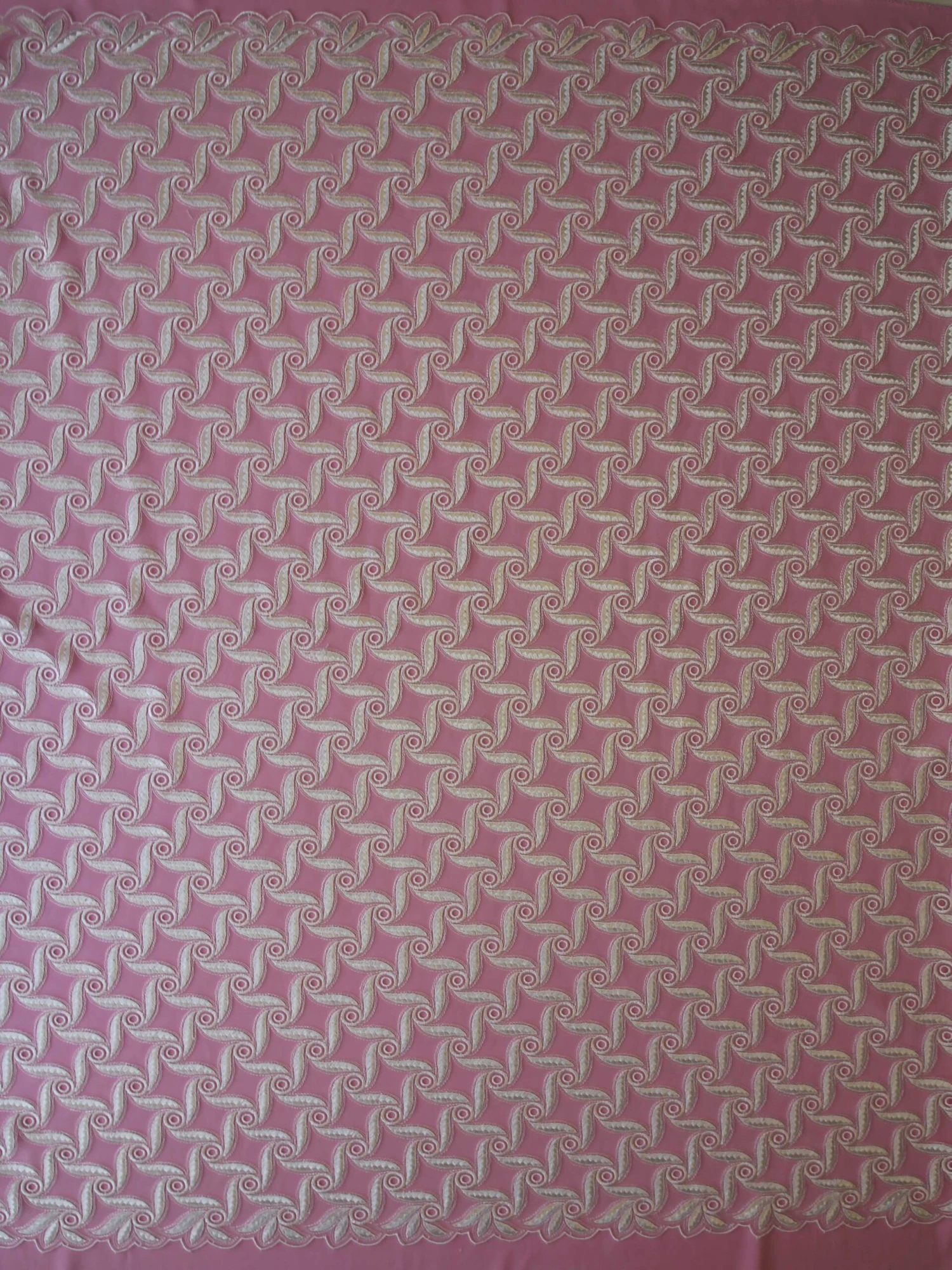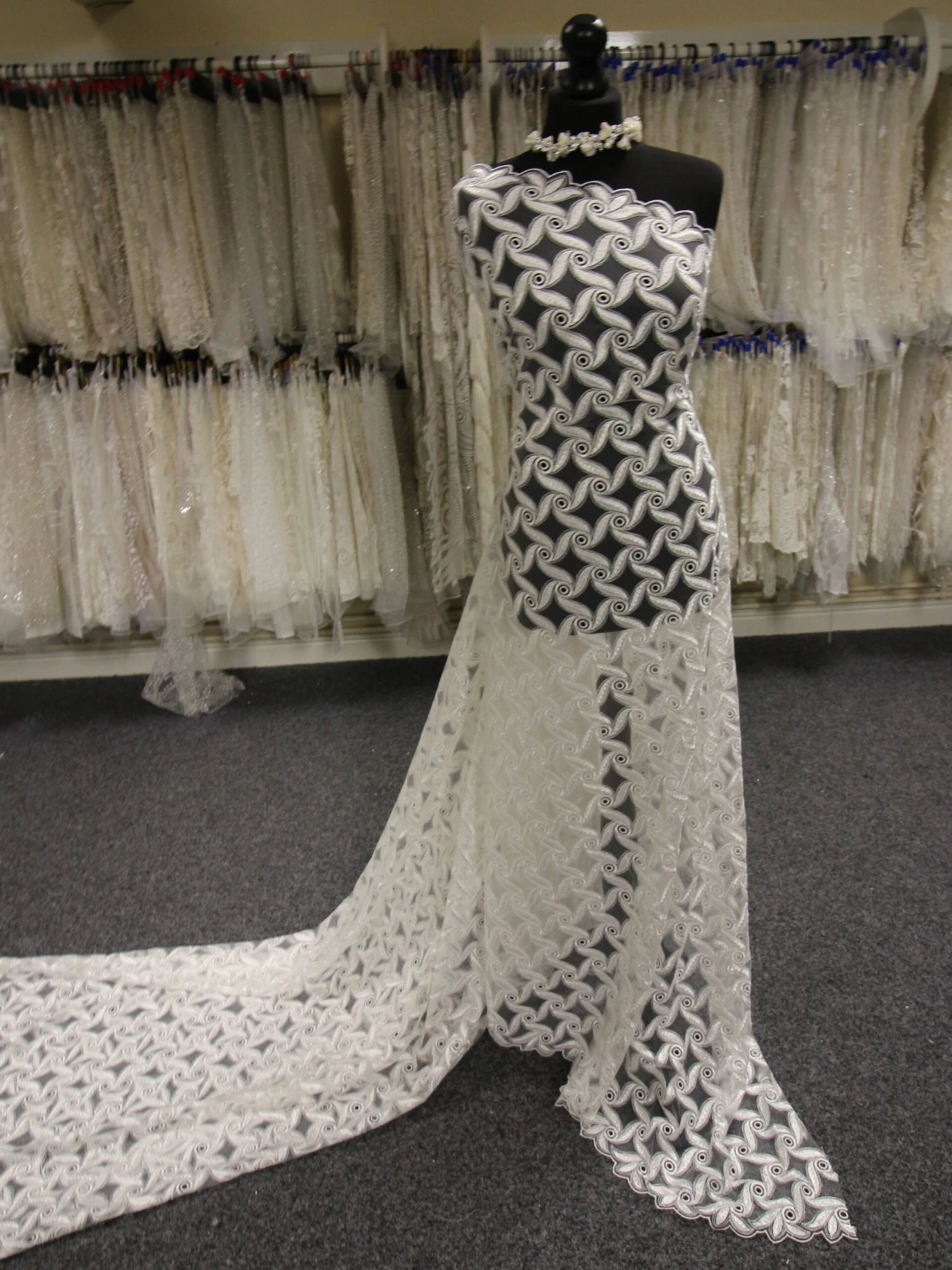 Clarence measures 140 cm (55″) wide and is a pale ivory in color. Our designer has used an interesting technique to embroider an ivory base tulle with “windmill” type patterns. The yarn is each “blade” forms a plaited pattern down the middle.