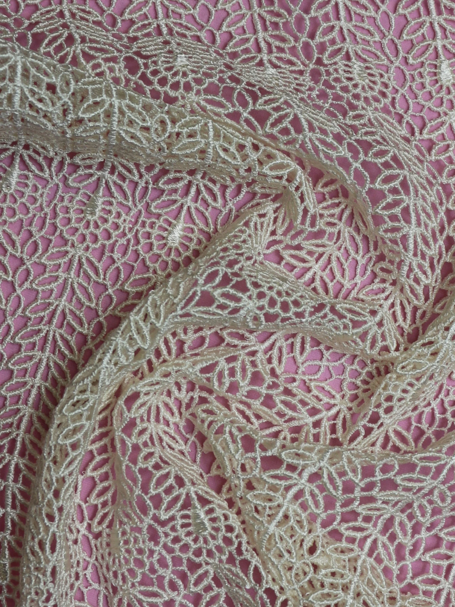A rather delicate design, the overwhelming aesthetic of this lace is not floral. As a Guipure it has an open interconnecting weave. This is a pretty and delicate lace with a small repeat so would suit flower girl or Christening gowns in addition to bridal wear. Available from stock without minimum so you only order as much or as little as you like. We also ship worldwide.