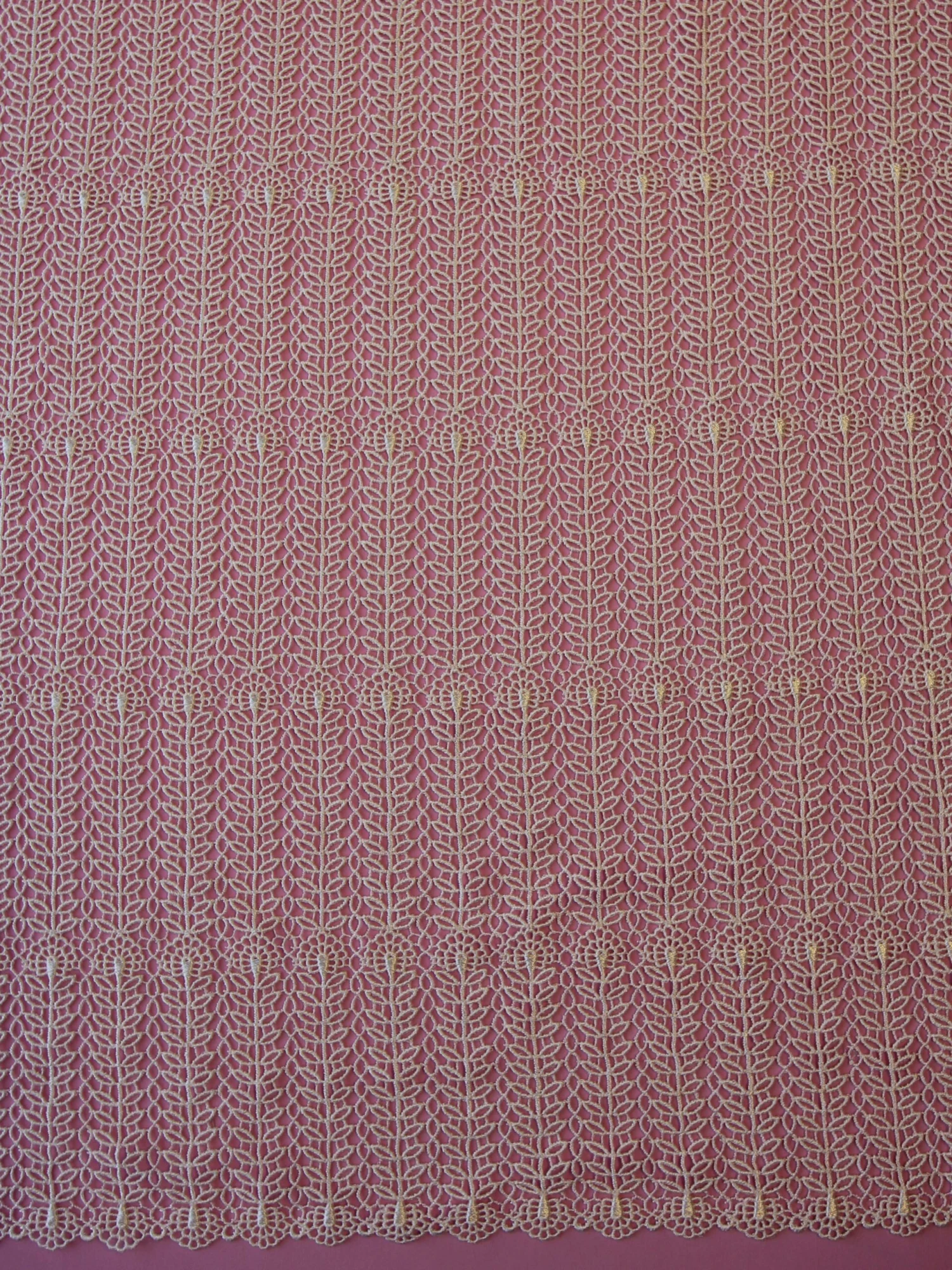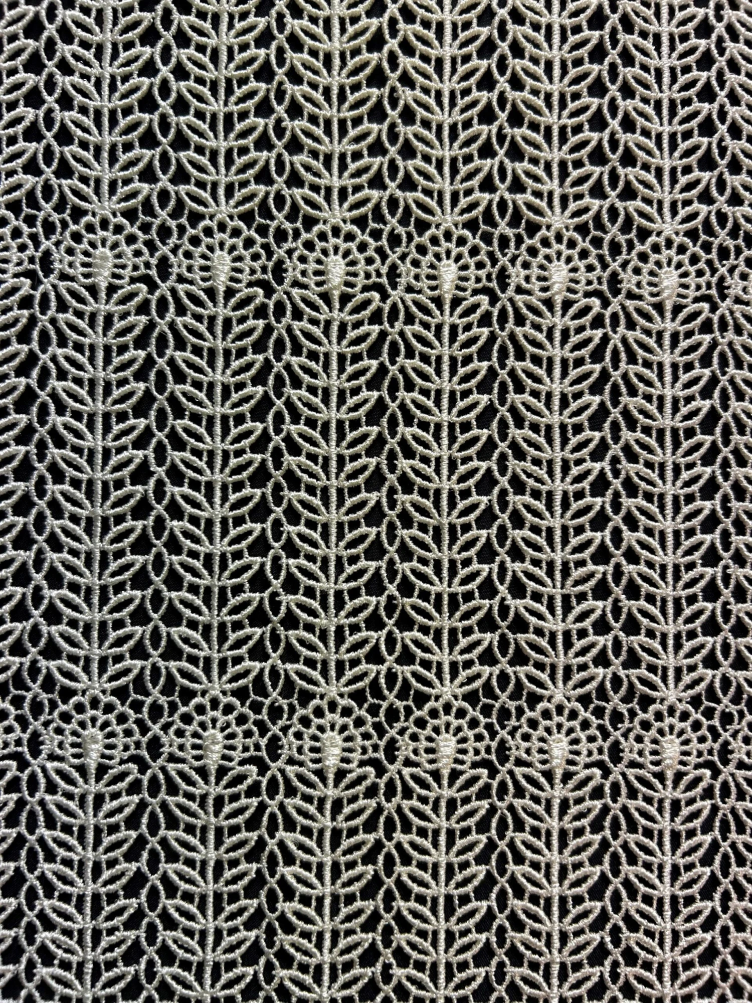 A retro design of vertical petals broken by a fan of teardrops, this Guipure lace has identical edges, which are both scalloped with a fan of teardrops. Grace measures 97 cm (38.1″) wide and is ivory in colour.