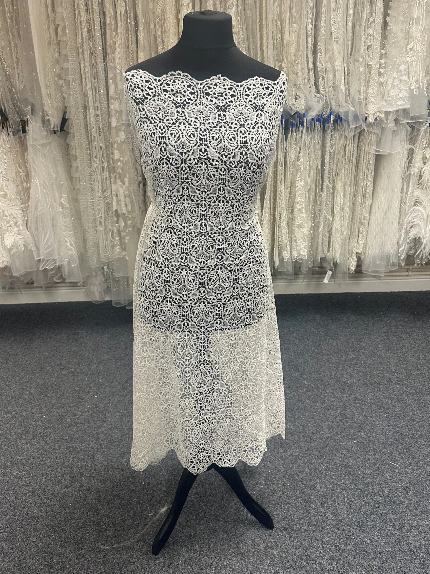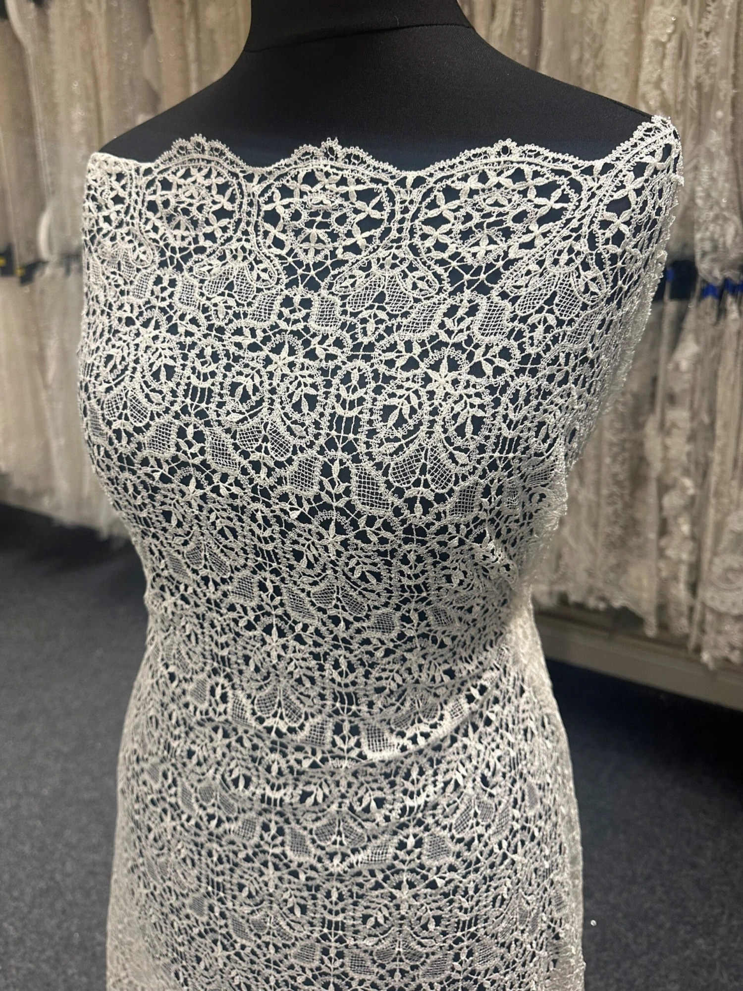 This lace measures 107 cm (42″) in width. We now offer this lace in white also.