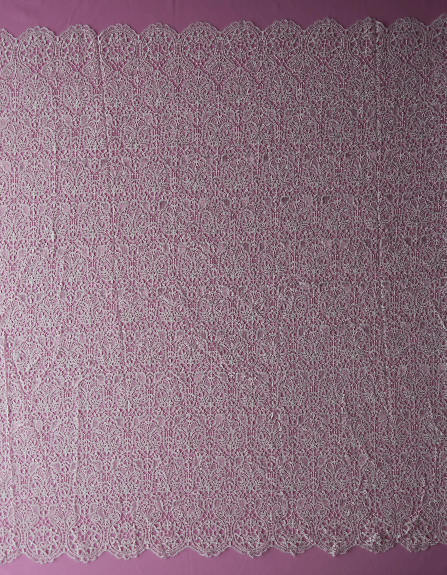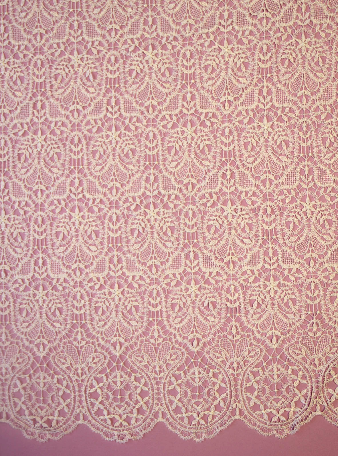 Isabella is a Guipure lace with an art deco theme. This beautiful pattern incorporates flower buds and leaves which are interspersed by small basket weave. Both edges are identically scalloped with a circular pattern of flowers completing the design.