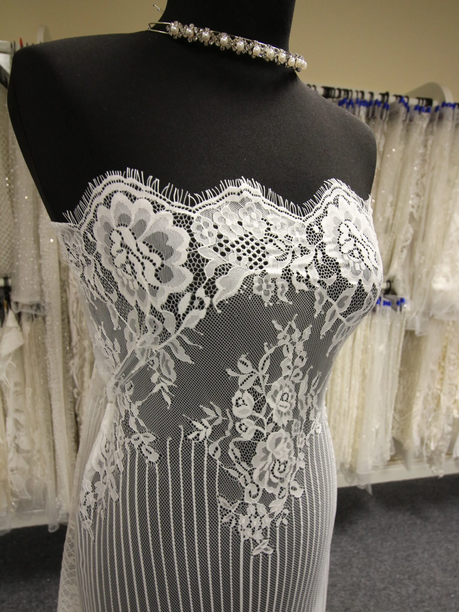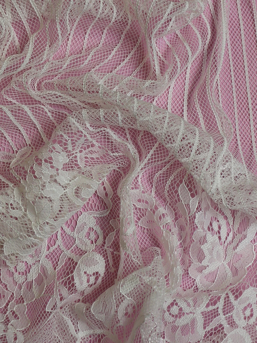 We have been asked by designers to source a lace that was decorated at the edges but had plainer areas in the middle of the lace. Macey fits very much the bill and features 2 matching edges that extend 20 cm (8″) in the pattern. Attractive motifs (23 cm x 14 cm) sit next to the borders. An elegant vertical stripe links the two sides and stretches for 76cm (30″)