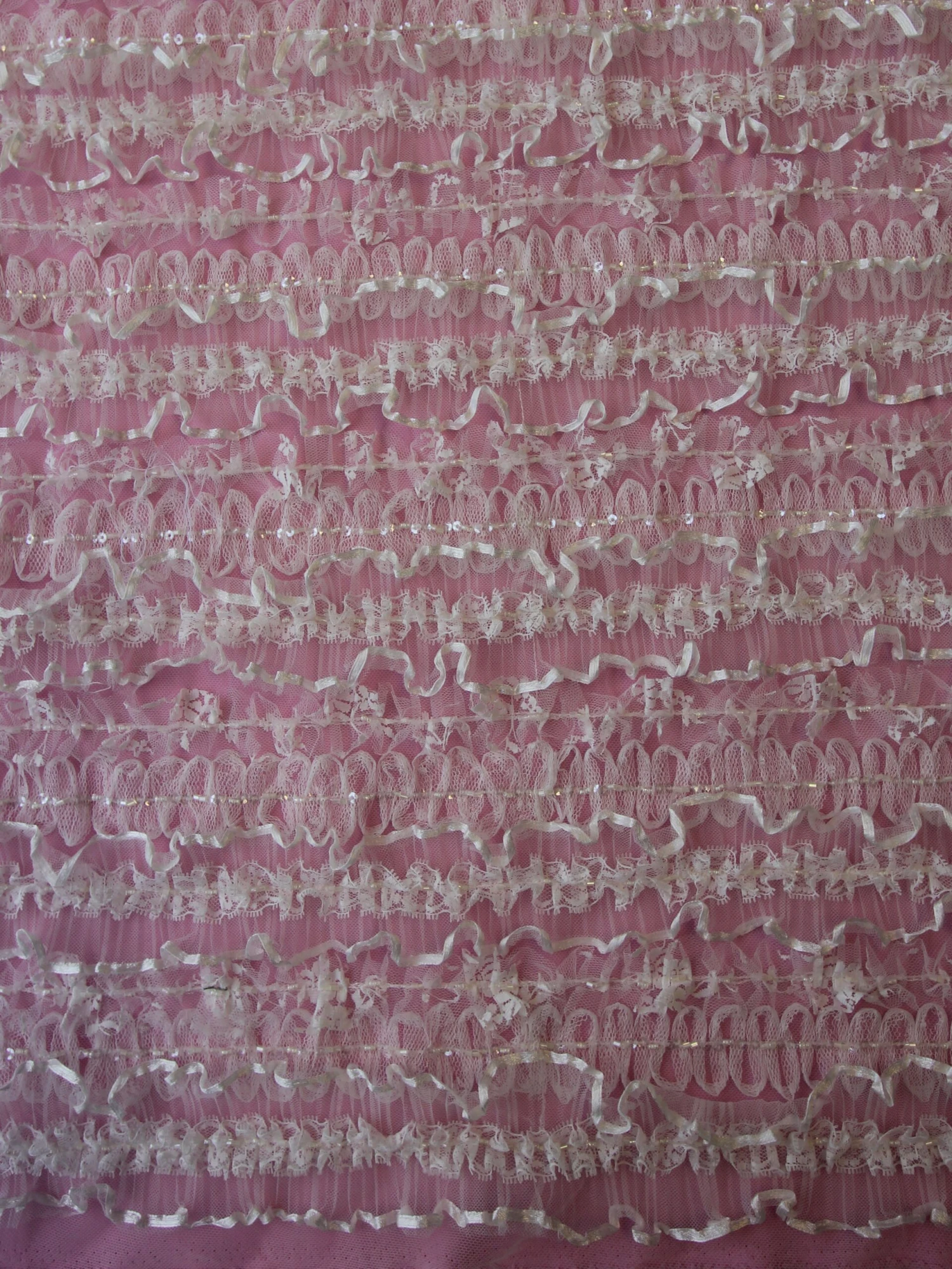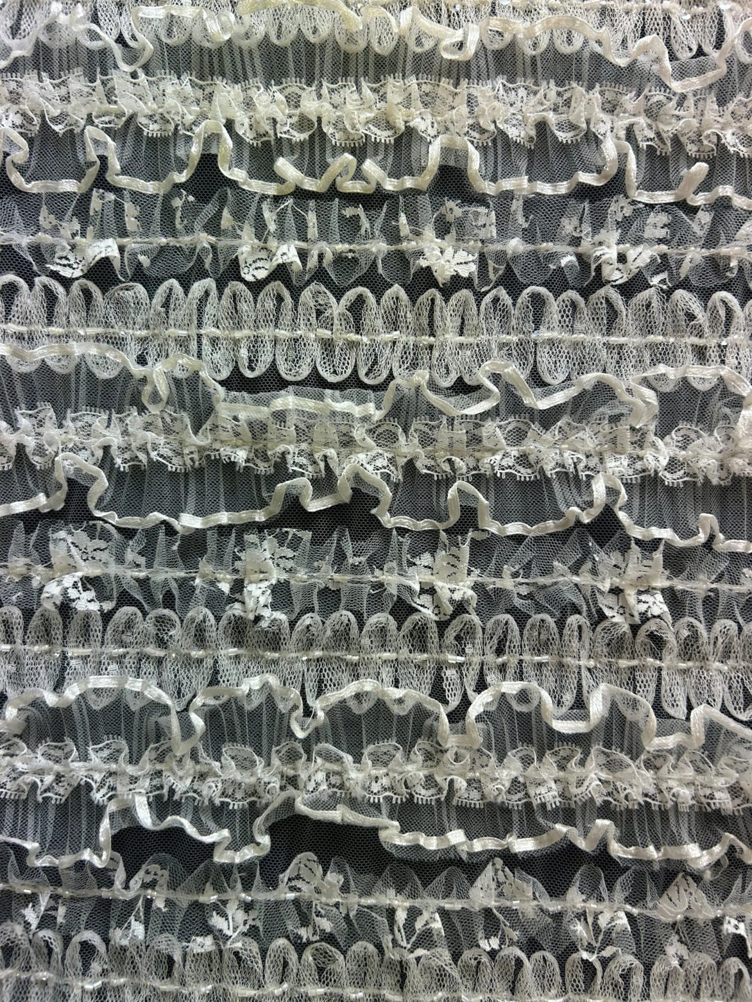 This ivory lace is comprised of a base layer of ivory tulle, on top of which are rows of rolled tulle which are embellished with a line of beads and sequins at the centre. Another layer is crinkled tulle that sits proud of the base, each edge finished with ribbon. At the centre of each row of crinkled ribbon framed tulle is lace trim further embellished with beads.